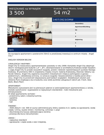 MIESZKANIE na WYNAJEM 3 500 Kraków, Stare Miasto, Szlak 54 m2 1407/3923/OMW Secondary ApartmentBuilding 54 1 2 Adjoining 1 1 Opis Do wynajęcia apartament o powierzchni 50m2 w prestiżowej inwestycji w centrum miasta - Angel City ! ENGLISH VERSION BELOW LOKALIZACJA I BUDYNEK : Angel City to nowoczesny apartamentowiec powstały w roku 2009. Kompleks Angel City obejmuje dwa 6- kondygnacyjne budynki („A” i „B”), wkomponowane w architekturę Krakowa dzięki fasadom z cegły.Angel City to przede wszystkim wygoda, prestiż i bliskość najistotniejszych punków Starego Krakowa. W promieniu 500 m znajdziemy między innymi: Galerię Krakowską, Dworzec Główny czy Rynek Główny. Angel City zapewnia wszystkim mieszkańcom miejsca parkingowe w garażu podziemnym, całodobową ochronę, co oznacza wygodę i bezpieczeństwo o każdej porze dnia i nocy. Angel City to przestrzeń dopasowana pod każdym względem. Dodatkowym atutem jest siłownia Pure znajdująca się w budynku oraz wiele punktów usługowych takich jak: Fresh, Idea Bank, Black Pearl. APARTAMENT: Mieszkanie usytuowane jest na pierwszym piętrze w sześciopiętrowym apartamentowcu z windą . Zostało wykończone i wyposażone w najwyższym standardzie . Całe mieszkanie jest klimatyzowane. W skład apartamentu wchodzi: - przestronny salon z otwartą kuchnią - sypialnia - łazienka - hall FINANSE : - 3500 złotych +ok. 500 zł czynsz administracyjny (który zawiera m.in. opłaty za ogrzewanie, wodę ciepłą i zimną, wywóz śmieci, monitoring, ochronę) + prąd - dwumiesięczna kaucja zabezpieczjąca zwrotna - prowizja dla biura nieruchomości UWAGI : - najwyższy standard - ogrzewanie i ciepła woda z sieci miejskiej, GAMP s.c. - doskonała lokalizacja - klimatyzacja - siłownia, sauna, recepcja For rent apartment of 50m2 in the prestigious investment in the city center - Angel City! LOCATION AND BUILDING: Angel City is a modern apartment block built in 2009. The complex Angel City includes two 6-storey buildings ( "A" and "B"), incorporated in the architecture of Krakow by the facades of cegły.Angel City is primarily a convenience, prestige and proximity to the most important punk old Krakow. Within 500 meters we find, among other things: Galeria Krakow, Main Railway Station and Main Market Square. Angel City provides all residents parking in the underground garage, clock protection, which means comfort and safety at any time of day or night. Modern solutions, classical beauty, intimate courtyards and exclusive penthouses. Brick, wood and a lot of greenery. These are just some of the features of this wonderful investment. Angel City is a space tailored in every respect. Another advantage is the Pure gym located in the building and many service points such as: Fresh, Idea Bank, the Black Pearl. APARTMENT: The flat is on the first floor of a six-storey apartment building with an elevator. It has been finished and furnished to the highest standard. The whole apartment is air conditioned. The apartment consists of: - Spacious living room with open kitchen - bedroom - bathroom - hall FINANCE: - 3500 PLN + approx. 500 zł administrative rent (which includes, among others, charges for heating, hot and cold water, garbage collection, monitoring, security) + electricity - Two-month deposit feedback - Commission for real estate COMMENTS : -high standard, heating the from the city, -Excellent location Serdecznie polecam! Bardzo proszę o kontakt lub o wypełnienie formularza na stronie: http://www.gamp-krakow.pl/zglos-poszukiwanie/ na pewno znajdziemy idealne mieszkanie, spełniające Państwa preferencje. Zachęcamy również do odwiedzenia naszej strony internetowej: www.gamp-krakow.pl KONTAKT DO AGENTA: Hubert Strugała Tel.: +48 530 900 452 Email: [email protected] GAMP Nieruchomości. Nowa jakość. Hubert Strugała tel. +48 530 900 452 email: [email protected] GAMP s.c. GAMP s.c. Powered by TCPDF (www.tcpdf.org)