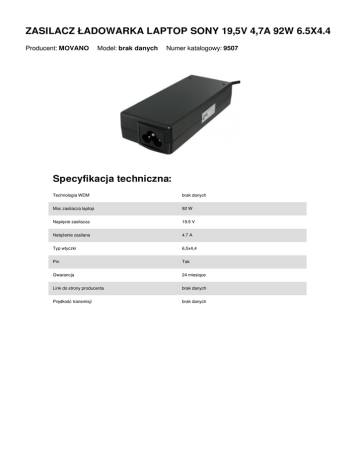 ZASILACZ ŁADOWARKA LAPTOP SONY 19,5V 4,7A 92W 6.5X4.4 Producent: MOVANO Model: brak danych Numer katalogowy: 9507 Specyfikacja techniczna: Technologia WDM brak danych Moc zasilacza laptop 92 W Napięcie zasilacza 19.5 V Natężenie zasilana 4.7 A Typ wtyczki 6,5x4,4 Pin Tak Gwarancja 24 miesiące Link do strony producenta brak danych Prędkość transmisji brak danych