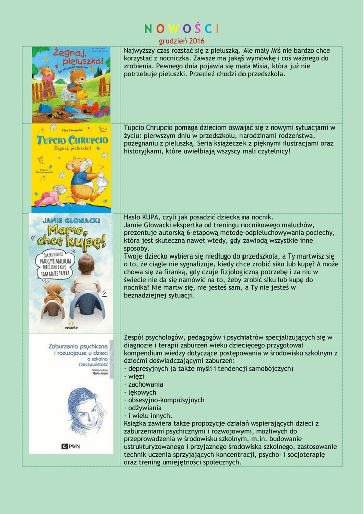 NOWOŚCI grudzień 2016 Najwyższy czas rozstać się z pieluszką. Ale mały Miś nie bardzo chce korzystać z nocniczka. Zawsze ma jakąś wymówkę i coś ważnego do zrobienia. Pewnego dnia pojawia się mała Misia, która już nie potrzebuje pieluszki. Przecież chodzi do przedszkola. Tupcio Chrupcio pomaga dzieciom oswajać się z nowymi sytuacjami w życiu: pierwszym dniu w przedszkolu, narodzinami rodzeństwa, pożegnaniu z pieluszką. Seria książeczek z pięknymi ilustracjami oraz historyjkami, które uwielbiają wszyscy mali czytelnicy! Hasło KUPA, czyli jak posadzić dziecka na nocnik. Jamie Głowacki ekspertka od treningu nocnikowego maluchów, prezentuje autorską 6-etapową metodę odpieluchowywania pociechy, która jest skuteczna nawet wtedy, gdy zawiodą wszystkie inne sposoby. Twoje dziecko wybiera się niedługo do przedszkola, a Ty martwisz się o to, że ciągle nie sygnalizuje, kiedy chce zrobić siku lub kupę? A może chowa się za firanką, gdy czuje fizjologiczną potrzebę i za nic w świecie nie da się namówić na to, żeby zrobić siku lub kupę do nocnika? Nie martw się, nie jesteś sam, a Ty nie jesteś w beznadziejnej sytuacji. Zespół psychologów, pedagogów i psychiatrów specjalizujących się w diagnozie i terapii zaburzeń wieku dziecięcego przygotował kompendium wiedzy dotyczące postępowania w środowisku szkolnym z dziećmi doświadczającymi zaburzeń: · depresyjnych (a także myśli i tendencji samobójczych) · więzi · zachowania · lękowych · obsesyjno-kompulsyjnych · odżywiania · i wielu innych. Książka zawiera także propozycje działań wspierających dzieci z zaburzeniami psychicznymi i rozwojowymi, możliwych do przeprowadzenia w środowisku szkolnym, m.in. budowanie ustrukturyzowanego i przyjaznego środowiska szkolnego, zastosowanie technik uczenia sprzyjających koncentracji, psycho- i socjoterapię oraz trening umiejętności społecznych. Książka powstała w odpowiedzi na potrzeby nauczycieli poszukujących gotowych rozwiązań lub inspiracji do pracy wychowawczej z dziećmi w wieku szkolnym. Jest ona zbiorem propozycji metodycznych dla nauczycieli pełniących funkcje wychowawców klas. Publikacja zawiera miniprogramy zajęć wychowawczych (obejmujące kilka scenariuszy) o tematyce ważnej dla prawidłowego rozwoju psychospołecznego uczniów. Poszczególne tematy zajęć mogą być podejmowane według zaproponowanej w książce kolejności, albo też mogą być realizowane wybiórczo, w zależności od potrzeb grupy i celu wychowawczego. Oprócz nauczycieli z książki korzystać mogą psychologowie, pedagodzy i wychowawcy grup pracujący ze starszymi dziećmi w szkołach, poradniach, świetlicach (środowiskowych, socjoterapeutycznych) i innych placówkach opiekuńczo-wychowawczych. Niniejsza publikacja ma na celu w zwięzły sposób zapoznać rodziców z podstawowymi zagadnieniami dotyczącymi rozwoju dziecka i udzielić odpowiedzi na podstawowe pytania: • Na czym polega wychowanie? • Co zrobić, by dziecko było lepsze i mądrzejsze? • Jak rozwijać jego wrodzone możliwości? • Jak wspierać go w okresie dojrzewania? • Jak współdziałać ze szkołą, by w procesie kształcenia w pełni wykorzystywało swój potencjał? Polecamy tą książkę również babciom i dziadkom, którzy współdziałając mądrze z rodzicami mogą wspomagać rozwój swoich ukochanych wnuków lub zepsuć swoje wnuki lekceważąc zasady ustalone przez rodziców. Publikacja składa się z dwóch części: Kwestionariusza diagnostycznego (książki) i Materiałów diagnostycznych (teczki). Jest to narzędzie, które umożliwi nauczycielom przedszkolnym dokonanie oceny poziomu rozwoju mowy dzieci przed przekroczeniem przez nie progu szkolnego. Pomoc ta może być również wykorzystana przez logopedów do wstępnej diagnozy i terapii. Ocenie podlega zdolność rozumienia i nadawania mowy, posługiwanie się częściami mowy i ich prawidłowa odmiana, umiejętność budowania zdań oraz, orientacyjnie, zakres słownictwa z wybranych obszarów. Kwestionariusz został opracowany w czterech językach (polskim, angielskim, niemieckim, rosyjskim). Umożliwia to wstępną diagnostykę dzieci dwujęzycznych, których w przedszkolach i gabinetach logopedycznych pojawia się coraz więcej. Teczka zawiera 31 kart, które przed przystąpieniem do badania należy rozciąć. Dzięki temu uzyskamy 62 zdjęcia niezbędne do przeprowadzenia diagnozy. Poradnik może okazać się inspirującą i przydatną lekturą dla rodziców i nauczycieli, którzy chcieliby się dowiedzieć więcej o tym, jak wychowujemy dzieci we współczesnym świecie, kto w rodzinie sprawuje władzę, w jaki sposób skutecznie komunikować się z dzieckiem, w czym może pomóc mediacja, jak funkcjonuje dziecko w odniesieniu do środowiska szkolnego, jak pomagać dziecku w osiąganiu gotowości szkolnej. Książka warta jest polecenia również tym rodzicom i nauczycielom, którzy poszukują wsparcia w radzeniu sobie z trudnościami rozwojowymi występującymi u PRZEDSZKOLAKÓW, takimi jak: zaburzenia w rozwoju mowy odmowa jedzenia zachowania masturbacyjne agresja dziecięca problemy adaptacyjne w środowisku przedszkolnym. Książka stanowi wprowadzenie w złożone i często skomplikowane zagadnienia z zakresu teorii, badań i historii rodziny, a w szczególności jej zadań opiekuńczo-wychowawczych. Może być przydatna tym czytelnikom, którzy chcieliby skonfrontować własną wiedzę i doświadczenie na temat rodziny z inną perspektywą patrzenia na nią, pogłębić zrozumienie jej złożoności i uwrażliwić na zachodzące w niej zjawiska. Autorzy przedstawili obszar badań pedagogiki opiekuńczej, której głównym przedmiotem jest opieka i wychowanie w rodzinie oraz implikacje tych procesów. Podjęte zagadnienia zaprezentowane zostały w dwóch częściach, stanowiących jednocześnie dwie główne perspektywy patrzenia na rodzinę: współczesną i history