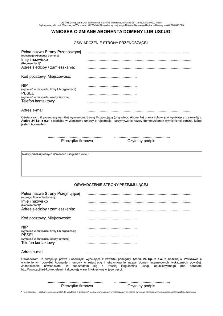 ACTIVE 24 Sp. z o.o., Ul. Barkocińska 6, 03-543 Warszawa, NIP: 526-287-38-03, KRS: 0000237885 Sąd rejonowy dla m.st. Warszawy w Warszawie, XIII Wydział Gospodarczy Krajowego Rejestru Sądowego Kapitał zakładowy spółki: 100.000 PLN WNIOSEK O ZMIANĘ ABONENTA DOMENY LUB USŁUGI OŚWIADCZENIE STRONY PRZENOSZĄCEJ Pełna nazwa Strony Przenoszącej ................................................................................................ (obecnego Abonenta domeny) Imię i nazwisko ................................................................................................ (Reprezentant)* Adres siedziby / zamieszkania: ................................................................................................ Kod pocztowy, Miejscowość: ............................................. NIP ............................................. (wypełnić w przypadku firmy lub organizacji) PESEL ............................................. (wypełnić w przypadku osoby fizycznej) Telefon kontaktowy ............................................. Adres e-mail ................................................................................................ Oświadczam, iż przenoszę na niżej wymienioną Stronę Przejmującą (przyszłego Abonenta) prawa i obowiązki wynikające z zawartej z Active 24 Sp. z o.o. z siedzibą w Warszawie umowy o rejestrację i utrzymywanie nazwy domeny/domen wymienionej poniżej, której jestem Abonentem: ................................................... Pieczątka firmowa ................................................... Czytelny podpis Nazwy przekazywanych domen lub usług (bez www.): OŚWIADCZENIE STRONY PRZEJMUJĄCEJ Pełna nazwa Strony Przejmującej ................................................................................................ (nowego Abonenta domeny) Imię i nazwisko ................................................................................................ (Reprezentant)* Adres siedziby / zamieszkania: ................................................................................................ Kod pocztowy, Miejscowość: ............................................. NIP ............................................. (wypełnić w przypadku firmy lub organizacji) PESEL ............................................. (wypełnić w przypadku osoby fizycznej) Telefon kontaktowy ............................................. Adres e-mail ................................................................................................ Oświadczam, iż przejmuję prawa i obowiązki wynikające z zawartej pomiędzy Active 24 Sp. z o.o. z siedzibą w Warszawie a wymienionym powyżej Abonentem umowy o rejestrację i utrzymywanie nazwy domen internetowych wskazanych powyżej. Jednocześnie oświadczam, iż zapoznałem się z treścią Regulaminu usług, opublikowanego pod adresem http://www.active24.pl/regulamin i akceptuję warunki określone w jego treści. ................................................... Pieczątka firmowa ................................................... Czytelny podpis * Reprezentant – osoba(y) umocowana(e) do składania o świadczeń woli w czynnościach przekraczających zakres zwykłego zarządu w imieniu obecnego/przyszłego Abonenta.