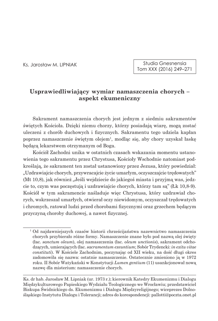 Ks. Jarosław M. LIPNIAK Studia Gnesnensia Tom XXX (2016) 249–271 Usprawiedliwiający wymiar namaszczenia chorych – aspekt ekumeniczny Sakrament namaszczenia chorych jest jednym z siedmiu sakramentów świętych Kościoła. Dzięki niemu chorzy, którzy posiadają wiarę, mogą zostać uleczeni z chorób duchowych i fizycznych. Sakramentu tego udziela kapłan poprzez namaszczenie świętym olejem1, modląc się, aby chory uzyskał łaskę będącą lekarstwem otrzymanym od Boga. Kościół Zachodni unika w ostatnich czasach wskazania momentu ustanowienia tego sakramentu przez Chrystusa, Kościoły Wschodnie natomiast podkreślają, że sakrament ten został ustanowiony przez Jezusa, który powiedział: „Uzdrawiajcie chorych, przywracajcie życie umarłym, oczyszczajcie trędowatych” (Mt 10,8), jak również „Jeśli wejdziecie do jakiegoś miasta i przyjmą was, jedzcie to, czym was poczęstują i uzdrawiajcie chorych, którzy tam są” (Łk 10,8-9). Kościół w tym sakramencie naśladuje więc Chrystusa, który uzdrawiał chorych, wskrzeszał umarłych, otwierał oczy niewidomym, oczyszczał trędowatych i chromych, ratował ludzi przed chorobami fizycznymi oraz grzechem będącym przyczyną choroby duchowej, a nawet fizycznej. Od najdawniejszych czasów historii chrześcijaństwa nazewnictwo namaszczenia chorych przybierało różne formy. Namaszczenie znane było pod nazwą olej święty (łac. sanctum oleum), olej namaszczenia (łac. oleum unctionis), sakrament odchodzących, umierających (łac. sacramentum exeuntium; Sobór Trydencki: in exitu vitae constituti). W Kościele Zachodnim, poczynając od XII wieku, na dość długi okres zadomowiła się nazwa: ostatnie namaszczenie. Ostatecznie zmieniono ją w 1972 roku. II Sobór Watykański w Konstytucji Lumen gentium (11) usankcjonował nową nazwę dla misterium: namaszczenie chorych. 1 Ks. dr hab. Jarosław M. Lipniak (ur. 1973 r.); kierownik Katedry Ekumenizmu i Dialogu Międzykulturowego Papieskiego Wydziału Teologicznego we Wrocławiu; przedstawiciel Biskupa Świdnickiego ds. Ekumenizmu i Dialogu Międzyreligijnego; wiceprezes Dolnośląskiego Instytutu Dialogu i Tolerancji; adres do korespondencji: [email protected] 250 Ks. Jarosław M. LIPNIAK Na początku sakrament chorych nie był sprawowany przez namaszczanie świętym olejem, ale przez nakładanie na chorego rąk (por. Mk 16,18; Dz 28,8-9). Jednakże już w czasach apostolskich nakładanie rąk zamieniono na namaszczanie olejem, o czym w III wieku wspomina Orygenes2. Praktykę posługiwania się świętym olejem odnajdujemy w słowach Listu św. Jakuba Apostoła (Jk 5,14‑15). Jest to pierwszy wyraźny opis porządku sakramentu. Tradycja wczesnego chrześcijaństwa (III-IV wiek) ów fragment Listu zgodnie przyjęła za apostolskie ustanowienie misterium świętego oleju. Słowa św. Jakuba stały się podstawą włączenia namaszczenia chorych do siedmiu sakramentów3. „W piśmiennictwie starochrześcijańskim, poza nielicznymi wyjątkami, brak jest systematycznych formularzy regulujących rytuał. Literatura okresu katakumb sporadycznie zajmuje się porządkiem sakramentu zwłaszcza dlatego, że istniała duża swoboda w sposobach odprawiania misterium. Milczenie starożytnych rękopisów wiąże się również z faktem, że męczennicy nie potrzebowali namaszczenia odpuszczającego grzechy (własną przecież krwią pieczętowali zbawienie) i w pewnym sensie sakrament chorych znajdował się niejako na marginesie ekonomii sakramentów”4. W I wieku o istnieniu sakramentu chorych wspomina tylko Dionizy Areopagita5. Adam Sawicki podkreśla, że wiek III również przynosi jedynie list otwarty Tertuliana do prokonsula Afryki6. Po Edykcie Mediolańskim (313 r.) wprowadzono wyraźne zmiany w tematyce utworów: apologetykę zamienia twórczość objaśniająca zasady wiary. Około 350 roku pojawia się egipski Euchologion7. Egipska Anafora Serapiona z Thmuis podaje ponadto modlitwy nad wodą i olejem, w których prosi się o moc uleczającą, aby ustąpiła wszelka gorączka i wszelki zły duch, i wszelka choroba. Biskup Kon stantynopola, św. Jan Chryzostom8, cytując tekst św. Jakuba Apostoła wspomina o namaszczeniu chorych, a patriarcha Egiptu, św. Cyryl Aleksandryjski, przedstawia stosowny rytuał celebrowany nad pogrążonymi w chorobie (chrześcijanin może odzyskać zdrowie poprzez namaszczenie wspomniane przez św. Jakuba)9. Pierwszą próbą w dziedzinie ujednolicenia rytu sakramentu był list papieża Orygenes, Scholia semeioseis: PG XII, 418. A. Sawicki, Sakrament namaszczenie chorych. Próba systematyzacji wiedzy o misterium świętego oleju, Elips 2(2000)2,134. 4 Tamże, 135. 5 Dionizy Areopagita, O hierarchii kościelnej, VII, 8: PG III, 369-585. 6 Tertulian, Do Skapuli, IV: PL I, 697, (775). 7 Jest to księga liturgiczna, zawierająca 30 modlitw. A. Dimitrijewskij, Euchologion, Kijew 1894. 8 G.S. Debolskij, Prawoslawnaja Cerkow w jejo tażnstwach, bogoslużenii, obrjadach i triebach, Moskwa 1994, 511. 9 Św. Cyryl Aleksandryjski, Księgi dialogów o kulcie Bożym „w duchu i prawdzie”, PG LXVIII, 472. 2 3 Usprawiedliwiający wymiar namaszczenia chorych – aspekt ekumeniczny 251 Innocentego I do Docencjusza z Gubbio10. Namiestnik Chrystusa stwierdza w nim, że namaszczenia świętym olejem mogą udzielać biskupi i kapłani. List papieża dowodzi, że sakrament chorych jest sakramentem w pełnym tego słowa znaczeniu. Chrześcijan, którzy niosą pokutę za popełnione grzechy obowiązuje, zgodnie z zaleceniem Innocentego, bezwarunkowy zakaz przystępowania do namaszczenia, gdyż, jeśli komu zabroniono udziału we wszystkich sakramentach, to korzystanie z pomocy jednego z nich także się temu sprzeciwi11. I ostatnia cenna uwaga Biskupa Rzymu: „do misterium świętego oleju dopuścić można wyłącznie chrześcijan, których dosięgła choroba”12. Usprawiedliwienie ma związek z chorobą, gdyż ta powiązana jest z grzechem i łaską