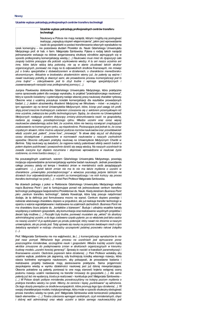 Newsy Uczelnie wyższe potrzebują profesjonalnych centrów transferu technologii Uczelnie wyższe potrzebują profesjonalnych centrów transferu technologii Naukowcy w Polsce nie mają narzędzi, którymi mogliby się posługiwać realizując „najwyższy stopień wtajemniczenia”, jakim jest wprowadzanie nauki do gospodarki w postaci transferowania własnych wynalazków na rynek komercyjny – nie pozostawia złudzeń Prorektor ds. Nauki Gdańskiego Uniwersytetu Medycznego prof. dr hab. n farm. Małgorzata Sznitowska. Pytana o rodzaj takich narzędzi jednoznacznie wskazuje na dobrze zorganizowaną strukturę ośrodków zajmujących się w sposób profesjonalny komercjalizacją wiedzy. (…) Naukowiec musi mieć do dyspozycji całe zespoły ludzkie pracujące dla potrzeb urynkowienia wiedzy. A tu ani nasza uczelnia ani inne, które także widzą taką potrzebę, nie są w stanie zbudować takich struktur organizacyjnych, ponieważ nie mają na to odpowiednich środków finansowych, nie mówiąc już o braku specjalistów z doświadczeniem w działaniach, o charakterze menedżerskoekonomicznym. Aktualnie w środowisku akademickim wiemy już, że patenty są ważne i nawet naukowcy potrafią je stworzyć sami, ale prowadzenie procesu komercjalizacji jest to „inna bajka” – zdecydowanie jest to zbyt trudne i wymaga specjalistycznych i zaawansowanych narzędzi oraz profesjonalnej pomocy (…). Justyna Pawłowska doktorantka Gdańskiego Uniwersytetu Medycznego, która praktycznie sama opracowała patent dla swojego wynalazku, to przykład "przedsiębiorczego naukowca", który w sposób świadomy i systematyczny nadaje własnej pracy naukowej charakter rynkowy. Obecnie wraz z uczelnią poszukuje ścieżek komercjalizacji dla rezultatów prowadzonych badań. (…) Jestem absolwentką Akademii Medycznej we Wrocławiu - mówi - w związku z tym wypowiem się na temat Uniwersytetów Medycznych, które, biorąc pod uwagę ich profil, stoją przed znacznie trudniejszym zadaniem zrzeszenia się z sektorem przemysłowym niż inne uczelnie, zwłaszcza teo profilu technologicznym. Sądzę, że obecnie na Uniwersytetach Medycznych następuje przełom dotyczący zmiany ukierunkowania nauki na gospodarkę, nadania jej nowego, przedsiębiorczego rytmu. Władze uczelni oraz coraz więcej naukowców uświadamiają sobie fakt, że uczelnie, które nie tworzą rozwiązań znajdujących zastosowanie na komercyjnym rynku, są niepotrzebne. Pocieszające jest jednak to, że coraz częstszym słowem, które można usłyszeć podczas rozmów naukowców oraz przedstawicieli władz uczelni jest „patent”, „know how”, „innowacja”. Te słowa stały się już od dłuższego czasu obowiązkowe i powszechne w rozmowach naukowców u naszych zachodnich sąsiadów. Obecnie odbywam praktykę naukową na Uniwersytecie Medycznym Charité w Berlinie. Tutaj naukowcy są świadomi, że najpierw należy patentować efekty swoich badań a potem dopiero publikować i powszechnie dzielić się swoją wiedzą. Na naszych uczelniach ta zasada zaczyna być dopiero rozumiana i stopniowo wprowadzana w naukowe życie codzienne, co mnie bardzo cieszy (…). Na poszczególnych uczelniach, wzorem Gdańskiego Uniwersytetu Medycznego, powstają instytucje odpowiedzialne za komercjalizację wyników badań naukowych. Jednak powodzenie całego procesu zależy od tempa i trwałości zmian w mentalności osób zarządzających uczelniami - (…) jeżeli takich zmian nie ma to nie ma także myślenia o uczelni w charakterze „uniwersytetu przedsiębiorczego” a wówczas pozostają jedynie tabliczki na drzwiach biur odpowiedzialnych w uczelni za komercjalizację i na nich kończy się proces transferu technologii na rynek (…)– mówi Pani Profesor Małgorzata Sznitowska. Na drzwiach jednego z pokoi w Rektoracie Gdańskiego Uniwersytetu Medycznego widać napis Business Point i jest to funkcjonujące ponad rok jednoosobowe centrum transferu technologii podlegające bezpośrednio Prorektorowi ds. Nauki. Kiedy określam Business Point jako „centrum transferu technologii”, Izabela Kowalczyk, która tutaj pracuje natychmiast dodaje, że ta definicja jest formułowana mocno na wyrost. Centrum dopiero powstaje i nabierze właściwego charakteru dopiero w przyszłości, ale już realizuje transfer technologii w oparciu o wzorce wypraktykowane i realizowane na uczelniach zachodnich. Business Point nie ma charakteru biura jedynie ds. „kontaktów z biznesem”. Buduje i udrażnia wszelkie kanały współpracy z sektorem gospodarki, aby komunikacja oraz realizowanie wspólnych projektów i zleceń były możliwe. (…) Początki były trudne, ponieważ musiałam się „wkleić” do struktury administracyjnej uczelni, a do tego zadawano często pytanie: po co właściwie jest taka osoba na naszej uczelni? A ja wydobywam po prostu potencjał, który nawet nie drzemie w naszym uniwersytecie, ale po prostu jest. Tutaj uprawia się naukę na poziomie światowym niech o tym świadczą wynalazki w rodzaju chociażby szczepionki jadalnej przeciwko rakowi żołądka (…). Prof. Małgorzata Sznitowska nie ma wątpliwości, że (…) komercjalizacja wynalazków to nie jest nasz pomysł. Wdrażanie tego procesu na uczelniach jest wymuszane przez poszczególne ministerstwa, szczególnie nauki i gospodarki. Władze każdej uczelni będą wkrótce zmuszone do podejmowania zmian w strukturach organizacyjnych w kierunku budowy modelu „uczelni trzeciej generacji”. Sprawią to naciski w kwestiach parametryzacji i finansowania uczelni. Osobiście popieram takie działania(…). Pani Profesor wolałaby, aby uczelnie wyższe, podobnie jak zagranicą, szły trudniejszą ścieżką własnego rozwoju, która stawia konkretne wymagania naukowcom, aby pokazywali, że prowadzone badania i realizowane projekty badawcze mają zastosowanie praktyczne. Sama przyjemność zaspokajania wiedzy w wyniku działalności naukowej jest już dzisiaj niewystarczająca. 
