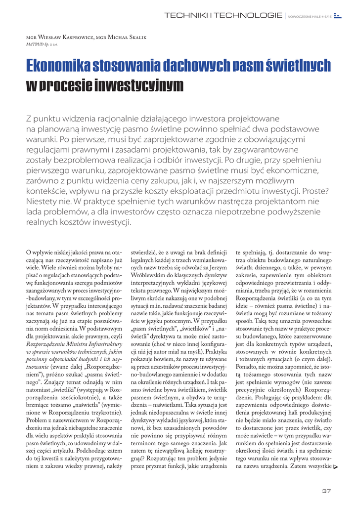 TECHNIKI I TECHNOLOGIE | NOWOCZESNE HALE 45/15 mgr Wiesław Kasprowicz, mgr Michał Skalik MATBUD Sp. z o.o. Ekonomika stosowania dachowych pasm świetlnych w procesie inwestycyjnym Z punktu widzenia racjonalnie działającego inwestora projektowane na planowaną inwestycję pasmo świetlne powinno spełniać dwa podstawowe warunki. Po pierwsze, musi być zaprojektowane zgodnie z obowiązującymi regulacjami prawnymi i zasadami projektowania, tak by zagwarantowane zostały bezproblemowa realizacja i odbiór inwestycji. Po drugie, przy spełnieniu pierwszego warunku, zaprojektowane pasmo świetlne musi być ekonomiczne, zarówno z punktu widzenia ceny zakupu, jak i, w najszerszym możliwym kontekście, wpływu na przyszłe koszty eksploatacji przedmiotu inwestycji. Proste? Niestety nie. W praktyce spełnienie tych warunków nastręcza projektantom nie lada problemów, a dla inwestorów często oznacza niepotrzebne podwyższenie realnych kosztów inwestycji. O wpływie niskiej jakości prawa na otaczającą nas rzeczywistość napisano już wiele. Wiele również można byłoby napisać o regulacjach stanowiących podstawę funkcjonowania szeregu podmiotów zaangażowanych w proces inwestycyjno-budowlany, w tym w szczególności projektantów. W przypadku interesującego nas tematu pasm świetlnych problemy zaczynają się już na etapie poszukiwania norm odniesienia. W podstawowym dla projektowania akcie prawnym, czyli Rozporządzeniu Ministra Infrastruktury w sprawie warunków technicznych, jakim powinny odpowiadać budynki i ich usytuowanie (zwane dalej „Rozporządzeniem”), próżno szukać „pasma świetlnego”. Znający temat odnajdą w nim natomiast „świetliki” (występują w Rozporządzeniu sześciokrotnie), a także brzmiące tożsamo „naświetla” (wymienione w Rozporządzeniu trzykrotnie). Problem z nazewnictwem w Rozporządzeniu ma jednak niebagatelne znaczenie dla wielu aspektów praktyki stosowania pasm świetlnych, co udowodnimy w dalszej części artykułu. Podchodząc zatem do tej kwestii z należytym przygotowaniem z zakresu wiedzy prawnej, należy stwierdzić, że z uwagi na brak definicji legalnych każdej z trzech wzmiankowanych nazw trzeba się odwołać za Jerzym Wróblewskim do klasycznych dyrektyw interpretacyjnych wykładni językowej tekstu prawnego. W największym możliwym skrócie nakazują one w podobnej sytuacji m.in. nadawać znaczenie badanej nazwie takie, jakie funkcjonuje rzeczywiście w języku potocznym. W przypadku „pasm świetlnych”, „świetlików” i „naświetli” dyrektywa ta może mieć zastosowanie (choć w nieco innej konfiguracji niż jej autor miał na myśli). Praktyka pokazuje bowiem, że nazwy te używane są przez uczestników procesu inwestycyjno-budowlanego zamiennie i w dodatku na określenie różnych urządzeń. I tak pasmo świetlne bywa świetlikiem, świetlik pasmem świetlnym, a obydwa te urządzenia – naświetlami. Taka sytuacja jest jednak niedopuszczalna w świetle innej dyrektywy wykładni językowej, która stanowi, iż bez uzasadnionych powodów nie powinno się przypisywać różnym terminom tego samego znaczenia. Jak zatem tę niewątpliwą kolizję rozstrzygnąć? Rozpatrując ten problem jedynie przez pryzmat funkcji, jakie urządzenia te spełniają, tj. dostarczanie do wnętrza obiektu budowlanego naturalnego światła dziennego, a także, w pewnym zakresie, zapewnienie tym obiektom odpowiedniego przewietrzania i oddymiania, trzeba przyjąć, że w rozumieniu Rozporządzenia świetliki (a co za tym idzie – również pasma świetlne) i naświetla mogą być rozumiane w tożsamy sposób. Taką tezę umacnia powszechne stosowanie tych nazw w praktyce procesu budowlanego, które zarezerwowane jest dla konkretnych typów urządzeń, stosowanych w równie konkretnych i tożsamych sytuacjach (o czym dalej). Ponadto, nie można zapomnieć, że istotą tożsamego stosowania tych nazw jest spełnienie wymogów (nie zawsze precyzyjnie określonych) Rozporządzenia. Posługując się przykładem: dla zapewnienia odpowiedniego doświetlenia projektowanej hali produkcyjnej nie będzie miało znaczenia, czy światło to dostarczone jest przez świetlik, czy może naświetle – w tym przypadku warunkiem do spełnienia jest dostarczenie określonej ilości światła i na spełnienie tego warunku nie ma wpływu stosowana nazwa urządzenia. Zatem wszystkie 37 NOWOCZESNE HALE 45/15 | TECHNIKI I TECHNOLOGIE trzy wskazane przyczyny rozpatrywane razem (jednak wydaje się, że nie każda z osobna) mogą stanowić uzasadnione powody odstępstwa od przedmiotowej dyrektywy interpretacyjnej i być uzasadnieniem dla tożsamego stosowania różnych nazw1. Należy jednak pamiętać, że wszelkie tego typu odstępstwa należy stosować zwężająco i nie powinno się ich rozszerzać na inne występujące w Rozporządzeniu nazwy, jak np. okna. Gdy projektantowi uda się już ustalić, że pasma świetlne, świetliki i naświetla to zasadniczo w świetle Rozporządzenia to samo, musi paść kluczowe pytanie, co zatem projektuję. Szczęśliwie (?) odpowiedź na brak wiążących wskazówek w tym zakresie w obowiązującym prawie budowlanym odnajdziemy w Polskich (choć o dziwo z uporem utrzymywanych w języku Szekspira) Normach. To do Polskich Norm, w zakresie dla którego brak jest obowiązujących norm odniesienia, zmuszeni są odwoływać się uczestnicy procesu budowlanego w ramach interesującego nas tematu. Abstrahując od szeregu wątpliwości dotyczących charakteru prawnego tych dokumentów, w szczególności od dyskusji na temat ich obowiązywania i zakresu stosowania, wskazują one na znane rozróżnienie: pasm świetlnych (norma PN-EN 14963:2006) i prefabrykowanych świetlików punktowych (norma PN-EN 1873:2014-07). Już same polskie nazwy przedmiotowych norm wskazują na zasadniczą różnicę pomiędzy tymi urządzeniami: PN-EN 14963 dotyczy przecież „podnoszonych ciągłych naświetli z tworzywa”, natomia