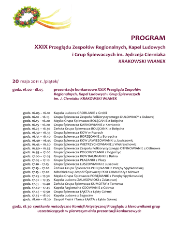 PROGRAM XXIX Przeglądu Zespołów Regionalnych, Kapel Ludowych i Grup Śpiewaczych im. Jędrzeja Cierniaka KRAKOWSKI WIANEK 20 maja 2011 r. /piątek/ godz. 16.00 - 18.05 godz. 16.05 – 16.10 godz. 16.10 – 16.15 godz. 16.15 – 16.20 godz. 16.15 – 16.20 godz. 16.25 – 16.30 godz. 16.30 – 16.35 godz. 16.35 – 16.40 godz. 16.40 – 16.45 godz. 16.45 – 16.50 godz. 16.50 – 16.55 godz. 16.55 – 17.00 godz. 17.00 – 17.05 godz. 17.05 – 17.10 godz. 17.10 – 17.15 godz. 17.15 – 17.20 godz. 17.15 – 17.20 godz. 17.25 – 17.30 godz. 17.30 – 17.35 godz. 17.35 – 17.40 godz. 17.40 – 17.45 godz. 17.45 – 17.50 godz. 17.55 – 18.00 godz. 18.00 – 18.20 prezentacje konkursowe XXIX Przeglądu Zespołów Regionalnych, Kapel Ludowych i Grup Śpiewaczych im. J. Cierniaka KRAKOWSKI WIANEK Kapela Ludowa GROBLANIE z Grobli Grupa Śpiewacza Zespołu Folklorystycznego DULOWIACY z Dulowej Męska Grupa Śpiewacza BOLĘCANIE z Bolęcina Grupa Śpiewacza KARNOWIANIE z Karniowic Żeńska Grupa Śpiewacza BOLĘCANKI z Bolęcina Grupa Śpiewacza KGW w Psarach Grupa Śpiewacza BORZĘCANIE z Borzęcina Grupa Śpiewacza KGW JAWISZOWIANKI z Jawiszowic Grupa Śpiewacza WIETRZYCHOWIANIE z Wietrzychowic Grupa Śpiewacza Zespołu Folklorystycznego OTFINOWIANIE z Otfinowa Grupa Śpiewacza POGORZYCANKI z Pogorzyc Grupa Śpiewacza KGW BALINIANKI z Balina Grupa Śpiewacza PŁAZANKI z Płazy Grupa Śpiewacza LUSZOWIANKI z Luszowic Żeńska Grupa Śpiewacza PORĘBIANIE z Poręby Spytkowskiej Młodzieżowy Zespół Śpiewaczy POD CHMURKĄ z Mirowa Męska Grupa Śpiewacza PORĘBIANIE z Poręby Spytkowskiej Kapela Ludowa ZALASOWIOKI z Zalasowej Żeńska Grupa Śpiewacza KUMOTRY z Tarnowa Kapela Regionalna GDOWIANIE z Gdowa Grupa Śpiewacza ŁĄKTA z Łąkty Górnej Kapela Ludowa z Żegociny Zespół Pieśni i Tańca ŁĄKTA z Łąkty Górnej godz. 18.30 spotkanie metodyczne Komisji Artystycznej Przeglądu z kierownikami grup uczestniczących w pierwszym dniu prezentacji konkursowych 21 maja 2011 r. /sobota/ godz. 11.10 – 13.20 I część prezentacji konkursowych godz. 11.10 – 11.15 godz. 11.15 – 11.20 godz. 11.20 – 11.25 godz. 11.25 – 11.30 godz. 11.30 – 11.35 godz. 11.40 – 11.45 godz. 11.45 – 11.50 godz. 11.50 – 11.55 godz. 11.55 – 12.00 godz. 12.00 – 12.05 godz. 12.05 – 12.10 godz. 12.10 – 12.15 godz. 12.15 – 12.20 godz. 12.20 – 12.45 godz. 12.45 – 12.50 godz. 12.50 – 12.55 godz. 12.55 – 13.00 godz. 13.00 – 13.05 godz. 13.05 – 13.10 Grupa Śpiewacza MIROWIANIE z Mirowa Grupa Śpiewacza WESOŁE KUMOSZKI z Tomaszowic Grupa Śpiewacza W KUŹNI U KOWALA z Kowalowej Kapela Ludowa W KUŹNI U KOWALA z Kowalowej Grupa Śpiewacza RUDNIANKI z Rudna Grupa Śpiewacza ŁĘCANKI z Łęki Szczucińskiej Grupa Śpiewacza KOZIEROWIANIE z Kozierowa Grupa Śpiewacza GOSPODYNIE Z DELASTOWIC Grupa Śpiewacza NASZA WOLA z Woli Batorskiej Żeńska Grupa Śpiewacza POGÓRZANKI z Jastrzębi Zespół Śpiewaczy NIEDŹWIEDZOKI z Niedźwiedzy Męska Grupa Śpiewacza POGÓRZANIE z Jastrzębi Grupa Śpiewacza CHORĄGWIANKI z Chorągwi Zespół Obrzędowy z Dębiny Zakrzewskiej Kapela Ludowa ŁAPANOWIANIE z Łapanowa Józef RÓŻYŃSKI z Bochni – instrumentalista - /heligonka/ Tomasz FERENC z Trzciany – instrumentalista /klarnet/ Józef ŚWISTAK z Woli Dębińskiej – instrumentalista - /heligonka/ Kapela Ludowa Regionalnego Zespołu KRAKOWIACY ZIEMI BRZESKIEJ z Brzeska godz. 13.10 – 13.15 Kapela Ludowa GWOŹDZIEC z Gwoźdźca godz. 13.15 – 13.20 Młodzieżowa Kapela Ludowa PASTUSZKOWE GRANIE ze Szczurowej godz. 13.20 – 13.45 Michał PASTUCH z Rudych Rysi – MISTRZ z uczniami: Daniel PASTUCH , Bartosz KLIMAJ, Adrian GAŁEK, Damian MAJ, Paweł DULĘBA - /heligonka/ godz. 14.00 – 15.30 PRZERWA spotkanie metodyczne Komisji Artystycznej Przeglądu z kierownikami grup uczestniczących w I części prezentacji konkursowych godz. 15.30 – 17.30 godz. 15.30 – 15.35 godz. 15.35 – 15.45 godz. 15.45 – 15.50 godz. 15.55 – 16.00 godz. 16.00 – 16.05 godz. 16.05 – 16.35 godz. 16.35 – 16.50 godz. 16.50 – 16.55 godz. 17.00 – 17.25 II część prezentacji konkursowych Grupa Śpiewacza GRABNIANKI z Grabna Grupa Śpiewacza SIEDLECANKI z Siedlca Żeński Zespół Śpiewaczy POMORZANY z Olkusza Grupa Śpiewacza BRACIEJOWIANKI z Braciejówki Męski Zespół Śpiewaczy POMORZANY z Olkusza Zespół Regionalny BISKUPIANIE z Biskupic Radłowskich Zespół Pieśni i Tańca PORĘBIANIE z Poręby Spytkowskiej Grupa Śpiewacza GWOŹDZIEC z Gwoźdźca Młodzieżowy Zespół Folklorystyczny GWOŹDZIEC z Gwoźdźca godz. 17.40 spotkanie metodyczne Komisji Artystycznej Przeglądu z kierownikami grup uczestniczących w II części prezentacji konkursowych 22 maja 2011 r. /niedziela/ godz. 11.00 – 13.40 godz. 11.10 – 11.25 godz. 11.40 – 12.00 godz. 12.00 – 12.25 godz. 12.25 – 12.40 godz. 12.40 – 12.45 godz. 12.45 – 12.50 godz. 12.50 – 12.55 godz. 13.00 – 13.30 godz. 13.30 – 13.40 godz. 13.40 – 13.45 godz. 13.45 – 14.00 I część prezentacji konkursowych Zespół Pieśni i Tańca BORZĘCANIE z Borzęcina Zespół Regionalny SCUROSKO MAGIERECKA ze Szczurowej Zespół Pieśni i Tańca IWKOWIANIE z Iwkowej Zespół Pieśni i Tańca ŁONIOWIACY z Łoniowej Eugeniusz DYNGOSZ z Bukowca – instrumentalista - /skrzypce/ Kapela Ludowa POGÓRZANIE z Jastrzębi Kapela Ludowa Dębińskiego Centrum Kultury Zespół Regionalny MIETNIOWIACY z Mietniowa Marcin KORBUT z Siedlca – instrumentalista /heligonka/ Marcin KORBUT z Siedlca – MISTRZ - uczeń Paweł OPYD /heligonka/ Zespół Pieśni i Tańca SIEDLECANIE z Siedlca godz. 14.00 – 16.00 PRZERWA spotkanie metodyczne Komisji Artystycznej Przeglądu z kierownikami grup uczestniczących w I części przesłuchań konkursowych godz. 16.10 – 18.00 godz. 16.10 – 16.35 godz. 16.35 – 17.05 godz. 17.05 – 17.35 godz. 17.40 – 18.10 godz. 20.00 II część prezentacji konkursowych Zespół Pieśni i Tańca SUŁKOWIANIE z Sułkowa Zesp
