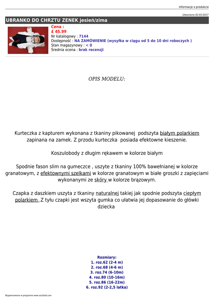 Informacje o produkcie Utworzono 02-03-2017 UBRANKO DO CHRZTU ZENEK jesień/zima Cena : £ 45.99 Nr katalogowy : 7144 Dostępność : NA ZAMÓWIENIE (wysyłka w ciągu od 5 do 10 dni roboczych ) Stan magazynowy : < 0 Średnia ocena : brak recenzji OPIS MODELU: Nowoczesne i eleganckie ubranko dla chłopca na chrzest i inne okazje . Strój idealnie nadający się na jesień-zimę. W sad kompletu wchodzą: Kurteczka z kapturem wykonana z tkaniny pikowanej podszyta białym polarkiem zapinana na zamek. Z przodu kurteczka posiada efektowne kieszenie. Koszulobody z długim rękawem w kolorze białym Spodnie fason slim na gumeczce , uszyte z tkaniny 100% bawełnianej w kolorze granatowym, z efektownymi szelkami w kolorze granatowym w białe groszki z zapięciami wykonanymi ze skóry w kolorze brązowym. Czapka z daszkiem uszyta z tkaniny naturalnej takiej jak spodnie podszyta ciepłym polarkiem .Z tyłu czapki jest wszyta gumka co ułatwia jej dopasowanie do główki dziecka Do kompletu należy granatowa mucha w białe groszki jak na zdjęciu i podpinka polarowa pod spodnie Rozmiary: 1. roz.62 (2-4 m) 2. roz.68 (4-6 m) 3. roz.74 (6-10m) 4. roz.80 (10-16m) 5. roz.86 (16-22m) 6. roz.92 (2-2,5 latka) Wygenerowano w programie www.oscGold.com Przed zakupem proszę nas poinformować o rozmiarze ubranka oraz spytać o termin realizacji !!! Dostępne opcje UBRANKO DO CHRZTU ZENEK jesień/zima » ROZMIAR: roz. 62, roz. 68, roz. 74, roz. 80, roz. 86, roz. 92.
