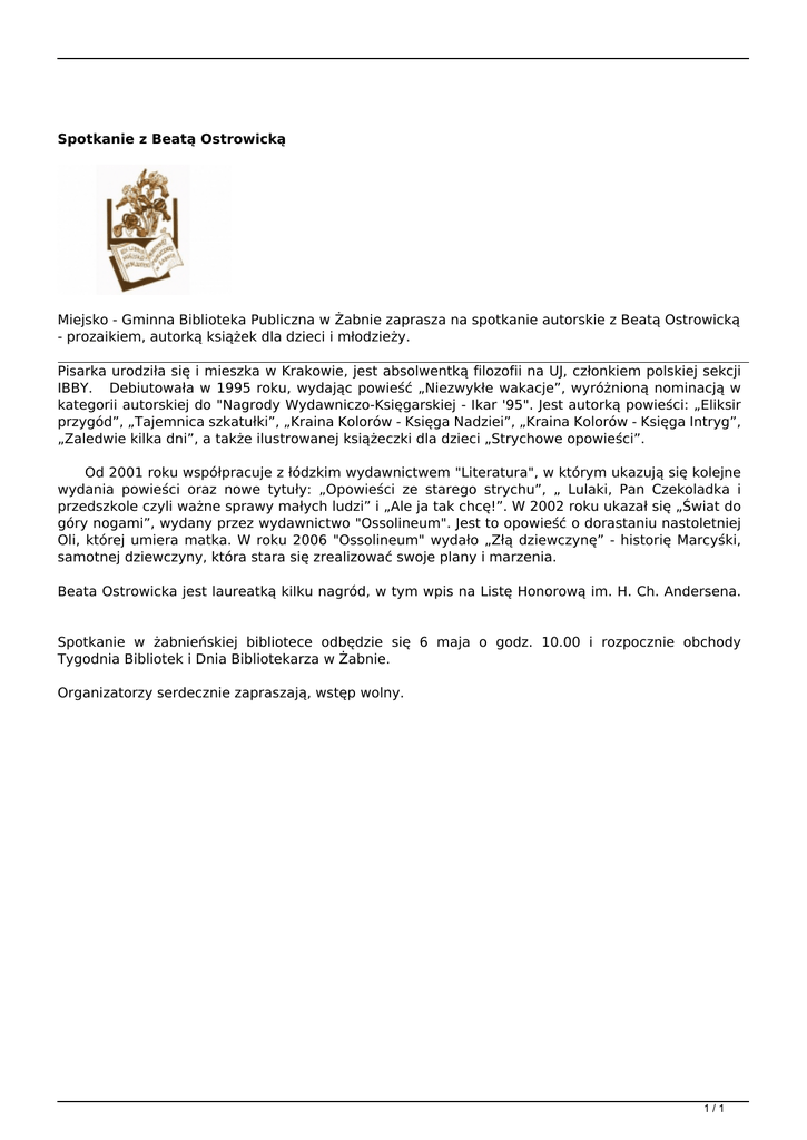 Spotkanie z Beatą Ostrowicką Miejsko - Gminna Biblioteka Publiczna w Żabnie zaprasza na spotkanie autorskie z Beatą Ostrowicką - prozaikiem, autorką książek dla dzieci i młodzieży. Pisarka urodziła się i mieszka w Krakowie, jest absolwentką filozofii na UJ, członkiem polskiej sekcji IBBY. Debiutowała w 1995 roku, wydając powieść „Niezwykłe wakacje”, wyróżnioną nominacją w kategorii autorskiej do "Nagrody Wydawniczo-Księgarskiej - Ikar '95". Jest autorką powieści: „Eliksir przygód”, „Tajemnica szkatułki”, „Kraina Kolorów - Księga Nadziei”, „Kraina Kolorów - Księga Intryg”, „Zaledwie kilka dni”, a także ilustrowanej książeczki dla dzieci „Strychowe opowieści”. Od 2001 roku współpracuje z łódzkim wydawnictwem "Literatura", w którym ukazują się kolejne wydania powieści oraz nowe tytuły: „Opowieści ze starego strychu”, „ Lulaki, Pan Czekoladka i przedszkole czyli ważne sprawy małych ludzi” i „Ale ja tak chcę!”. W 2002 roku ukazał się „Świat do góry nogami”, wydany przez wydawnictwo "Ossolineum". Jest to opowieść o dorastaniu nastoletniej Oli, której umiera matka. W roku 2006 "Ossolineum" wydało „Złą dziewczynę” - historię Marcyśki, samotnej dziewczyny, która stara się zrealizować swoje plany i marzenia. Beata Ostrowicka jest laureatką kilku nagród, w tym wpis na Listę Honorową im. H. Ch. Andersena. Spotkanie w żabnieńskiej bibliotece odbędzie się 6 maja o godz. 10.00 i rozpocznie obchody Tygodnia Bibliotek i Dnia Bibliotekarza w Żabnie. Organizatorzy serdecznie zapraszają, wstęp wolny. 1/1 Powered by TCPDF (www.tcpdf.org)