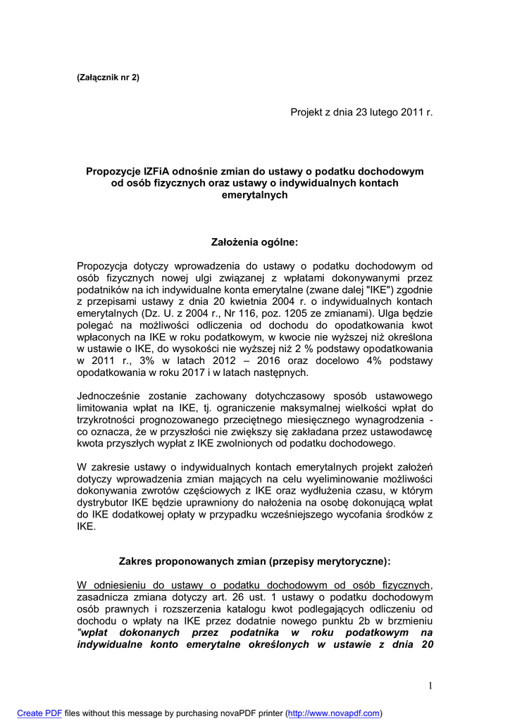 (Załącznik nr 2) Projekt z dnia 23 lutego 2011 r. Propozycje IZFiA odnośnie zmian do ustawy o podatku dochodowym od osób fizycznych oraz ustawy o indywidualnych kontach emerytalnych Założenia ogólne: Propozycja dotyczy wprowadzenia do ustawy o podatku dochodowym od osób fizycznych nowej ulgi związanej z wpłatami dokonywanymi przez podatników na ich indywidualne konta emerytalne (zwane dalej "IKE") zgodnie z przepisami ustawy z dnia 20 kwietnia 2004 r. o indywidualnych kontach emerytalnych (Dz. U. z 2004 r., Nr 116, poz. 1205 ze zmianami). Ulga będzie polegać na możliwości odliczenia od dochodu do opodatkowania kwot wpłaconych na IKE w roku podatkowym, w kwocie nie wyższej niż określona w ustawie o IKE, do wysokości nie wyższej niż 2 % podstawy opodatkowania w 2011 r., 3% w latach 2012 – 2016 oraz docelowo 4% podstawy opodatkowania w roku 2017 i w latach następnych. Jednocześnie zostanie zachowany dotychczasowy sposób ustawowego limitowania wpłat na IKE, tj. ograniczenie maksymalnej wielkości wpłat do trzykrotności prognozowanego przeciętnego miesięcznego wynagrodzenia co oznacza, że w przyszłości nie zwiększy się zakładana przez ustawodawcę kwota przyszłych wypłat z IKE zwolnionych od podatku dochodowego. W zakresie ustawy o indywidualnych kontach emerytalnych projekt założeń dotyczy wprowadzenia zmian mających na celu wyeliminowanie możliwości dokonywania zwrotów częściowych z IKE oraz wydłużenia czasu, w którym dystrybutor IKE będzie uprawniony do nałożenia na osobę dokonującą wpłat do IKE dodatkowej opłaty w przypadku wcześniejszego wycofania środków z IKE. Zakres proponowanych zmian (przepisy merytoryczne): W odniesieniu do ustawy o podatku dochodowym od osób fizycznych, zasadnicza zmiana dotyczy art. 26 ust. 1 ustawy o podatku dochodowym osób prawnych i rozszerzenia katalogu kwot podlegających odliczeniu od dochodu o wpłaty na IKE przez dodatnie nowego punktu 2b w brzmieniu "wpłat dokonanych przez podatnika w roku podatkowym na indywidualne konto emerytalne określonych w ustawie z dnia 20 1 Create PDF files without this message by purchasing novaPDF printer (http://www.novapdf.com) kwietnia 2004 r. o indywidualnych kontach emerytalnych, do wysokości określonej w tej ustawie". Podobna zmiana powinna zostać dokonana w art. 30c ust. 2 ustawy w odniesieniu do podatników opodatkowanych 19% podatkiem dochodowym od osób fizycznych (tzw. liniowym), stwarzając możliwość odliczania od podstawy opodatkowania nie tylko składek na ubezpieczenie społeczne (I i II filar) – jak ma miejsce dotychczas, ale również wpłat na IKE. Nowe przepisy w art. 26 i art. 30c stanowiłby, że łączna kwota odliczeń z tytułu wpłat na IKE nie może przekroczyć w roku podatkowym kwoty stanowiącej 2% dochodu. Przepisy przejściowe do ustawy nowelizującej będą określać limitu odliczeń i jego wzrost w latach 2014 - 2016 do 3%, a docelowo - do 4% w 2017 roku. Kwota odliczeń, o których mowa w nowych przepisach art. 26 ust. 1 pkt 2b i art. 30c ust. 2, przekraczająca kwotę dochodu, o którym mowa w ust. 1, może być odliczona od dochodu uzyskanego w najbliższych kolejno po sobie następujących 5 latach podatkowych. Podobnie jak ma to miejsce w przypadku dotychczas istniejących odliczeń od dochodu, małżonkowie opodatkowujący się łącznie oraz osoby samotnie wychowujące dzieci mogłyby skorzystać z możliwości odrębnego odliczenia od sumy swoich dochodów wpłat na IKE dokonanych w roku podatkowym przez każdego z małżonków albo przez osobę samotnie wychowującą dziecko (w tym ostatnim przypadku na własne IKE oraz na IKE dziecka, które ukończyło 16 lat). W odniesieniu do ustawy o indywidualnych kontach emerytalnych, zasadnicza zmiana polegałaby na usunięciu z art. 37 dotychczasowego ust. 1a i 11, który przewiduje dokonywanie częściowych zwrotów i wprowadzenie w ust. 9 przepisu, zgodnie z którym, przedmiotem zwrotu może być wyłącznie całość środków zgromadzonych na IKE, a w przypadku gdy oszczędzający gromadzi środki na podstawie umów zawartych z różnymi funduszami inwestycyjnymi, zarządzanymi przez to samo towarzystwo, przedmiotem zwrotu jest całość środków zgromadzonych w tych funduszach. W konsekwencji, przepis art. 15, zgodnie z którym możliwe jest ustanowienie zastawu na środkach zgromadzonych na IKE, zaś zaspokojenie wierzyciela z tych środków oznacza zwrot, powinien być uzupełniony o ust. 2, zgodnie z którym zaspokojenie wierzytelności zabezpieczonej zastawem ze środków zgromadzonych na IKE powoduje, że środki pozostałe na IKE są przekazywane oszczędzającemu w formie zwrotu. Zważywszy na możliwość dokonania całkowitego zwrotu środków z IKE przez podatników, którzy skorzystali z ulgi podatkowej, do ustawy zostanie wprowadzona regulacja nakładająca obowiązek skorygowania podstawy opodatkowania i zapłacenia zaległego podatku wraz z odsetkami. Z uwagi na 2 Create PDF files without this message by purchasing novaPDF printer (http://www.novapdf.com) termin przedawnienia zobowiązań podatkowych taka regulacja może dotyczyć tylko zwrotów dokonywanych w terminie 6 lat od dokonania wpłaty na IKE będącej podstawą do skorzystania z ulgi podatkowej. Odsetki będą naliczane od następnego dnia po dniu, w którym podatnik skorzystał z ulgi. W konsekwencji, przepisy art. 2 pkt 15a, art. 21 ust. 2 pkt 5a oraz art. 22 ust. 3 pkt 5a powinny ulec skreśleniu jako odnoszące się wyłącznie do zwrotu częściowego, zaś przepisy art. 1, art. 9 w ust. 1 pkt 7, art. 15 ust. 1, art. 33, tytuł rozdziału 7 i art. 38 ust. 1 powinny zostać zmienione poprzez wykreślenie z ich treści pojawiających się odniesień do częściowego zwrotu. Na instytucje finansowe prowadzące IKE zostanie nałożony obowiązek poinformowania właściwego organu podatkowego o dokonanym zwrocie środków z IKE. Ponadto zmianie uległby art. 39 ust. 1 ustawy o indywidualny
