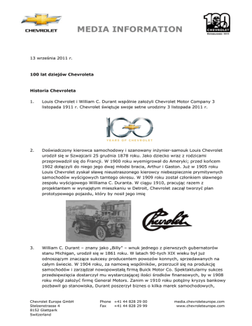 MEDIA INFORMATION 13 września 2011 r. 100 lat dziejów Chevroleta Historia Chevroleta 1. Louis Chevrolet i William C. Durant wspólnie założyli Chevrolet Motor Company 3 listopada 1911 r. Chevrolet świętuje swoje setne urodziny 3 listopada 2011 r. 2. Doświadczony kierowca samochodowy i szanowany inżynier-samouk Louis Chevrolet urodził się w Szwajcarii 25 grudnia 1878 roku. Jako dziecko wraz z rodzicami przeprowadził się do Francji. W 1900 roku wyemigrował do Ameryki; przed końcem 1902 dołączyli do niego jego dwaj młodsi bracia, Arthur i Gaston. Już w 1905 roku Louis Chevrolet zyskał sławę nieustraszonego kierowcy niebezpiecznie prymitywnych samochodów wyścigowych tamtego okresu. W 1909 roku został członkiem sławnego zespołu wyścigowego Williama C. Duranta. W ciągu 1910, pracując razem z projektantem w wynajętym mieszkaniu w Detroit, Chevrolet zaczął tworzyć plan prototypowego pojazdu, który by nosił jego imię 3. William C. Durant – znany jako „Billy” – wnuk jednego z pierwszych gubernatorów stanu Michigan, urodził się w 1861 roku. W latach 90-tych XIX wieku był już odnoszącym znaczące sukcesy producentem powozów konnych, sprzedawanych na całym świecie. W 1904 roku, za namową wspólników, przerzucił się na produkcję samochodów i zarządzał nowopowstałą firmą Buick Motor Co. Spektaktularny sukces przedsięwzięcia dostarczył mu wystarczającej ilości środków finansowych, by w 1908 roku mógł założyć firmę General Motors. Zanim w 1910 roku potężny kryzys bankowy pozbawił go stanowiska, Durant poszerzył biznes o kilka marek samochodowych, Chevrolet Europe GmbH Stelzenstrasse 4 8152 Glattpark Switzerland Phone +41 44 828 29 00 Fax +41 44 828 29 99 media.chevroleteurope.com www.chevroleteurope.com 2 między innymi Cadillac, Oldsmobile i Oakland. 4. Nieugięty Billy Durant, chcąc zaprojektować nowy samochód po opuszczeniu GM, nawiązał współpracę z Louisem Chevroletem, co zaowocowało powstaniem powszechnie znanego samochodu wyścigowego. W 1912 roku model Classic Six serii C, stworzony przez Louisa Chevroleta, warty 2 150 $, luksusowy samochód o wybitnych osiągach, wyjechał na ulice Detroit. 5. Pod koniec 1913 roku Louis Chevrolet rozstał się z Billym Durantem, pozostawiając po sobie prawa do produkowania samochodów pod swoim nazwiskiem. Louis przeprowadził się do Indianapolis, gdzie wraz ze swymi młodszymi braćmi Arthurem i Gastonem, stał się legendą wyścigów Indianapolis 500. Zaprojektowane pod nadzorem Duranta logo Chevroleta w kształcie muszki pojawiło się w reklamie jeszcze w tym samym roku. W logo to, jako pierwsze wyposażono nowe, bardziej przystępne cenowo modele Chevroletów z roku 1914. 6. Model H został wyposażony w wytrzymały czterocylindrowy silnik, który pomógł Chevroletowi zdobyć reputację niezawodnego samochodu. Silnik ten napędzał Chevrolety aż do 1928 roku. Chevrolet Poland Sp. z o.o. Ul. Wołoska 5 02-675 Warszawa Polska Tel. +48 22 606 1609 Fax +48 22 606 1601 media.chevroleteurope.com www.chevrolet.pl 3 7. Od chwili nawiązania współpracy z Louisem Chevroletem, Billy Durant miał oko na rynek przystępnych cenowo samochodów. W końcu w 1915 roku wprowadził Chevroleta 490 do segmentu samochodów ekonomicznych. Jego cena, wynosząca 490 $, uczyniła z niego bezpośrednią konkurencję dla ówczesnego modelu Forda T. W 1916 roku Durant wykorzystał sukces Chevroleta do odzyskania kontroli nad General Motors. 8. W 1916 roku w wyścigu Indianapolis 500 Louis Chevrolet siedział za kierownicą zaprojektowanego przez braci Chevrolet samochodu wyścigowego marki Frontenac. Cztery lata później w tym samym wyścigu Gaston Chevrolet poprowadził do zwycięstwa samochód marki Monroe-Frontenac. Po śmierci Gastona w wypadku na torze wyścigowym, Louis i Arthur założyli firmę, która produkowała wyposażenie służące do kontroli prędkości w samochodach wyścigowych, które były poprzednikami dzisiejszych samochodów typu sprint car. Pod koniec lat 20. Louis zajął się ponadto projektowaniem silników lotniczych. Jak wielu innych przedsiębiorców, poniósł ogromne straty przez krach giełdowy z 1929 roku. Wrócił do Detroit, gdzie przez kilka lat pracował w fabryce Chevroleta. W tym mieście zmarł z powodu komplikacji cukrzycowych 6 czerwca 1941 r., w wieku 63 lat. 9. 10. W 1918 roku na rynku pojawiły się pierwsze półciężarówki Chevroleta. Były dostępne dwie wersje: jedna o małej nośności, której podwozie wzorowane było na podwoziu modelu 490, a druga o dużej nośności, wynoszącej 1 tonę. Nadwozia dostarczane były przez przemysłowych producentów nadwozi. Chevrolet formalnie stał się częścią General Motors Corporation w 1918 roku, kiedy spółką po raz drugi i ostatni kierował jej założyciel, Billy Durant. Po opuszczeniu GM pod koniec 1920 roku, Durant stworzył Durant Motors. Spółka produkowała samochody pod markami Durant, Star, Flint oraz Locomobile, a także półciężarówki Mason aż do 1933 roku, gdy padła ofiarą Wielkiego Kryzysu Gospodarczego. W 1940 Chevrolet Poland Sp. z o.o. Ul. Wołoska 5 02-675 Warszawa Polska Tel. +48 22 606 1609 Fax +48 22 606 1601 media.chevroleteurope.com www.chevrolet.pl 4 roku Durant, który zbliżał się wtedy do osiemdziesiątki, w mieście Flint w stanie Michigan zbudował i zarządzał kręgielnią, która miała dać początek całej sieci takich punktów rozrywki. Po zawale, którego doznał w podróży służbowej w 1942 roku, Durant przeniósł się wraz z żoną do Nowego Yorku. Tam zmarł 18 marca 1947 roku. 11. W 1921 roku następca Billy’ego Duranta w General Motors, Pierre S. duPont, zwrócił się do przyszłego prezesa GM, Alfreda P. Sloana, by wspólnie ocenić perspektywy marki Chevrolet. Sloan, ignorując sceptyków, którzy byli przeciwni jego wizji, dzięki swym badaniom umocnił się w przekonaniu, że Chevrolet może stać się ekonomiczną marką, odnosz