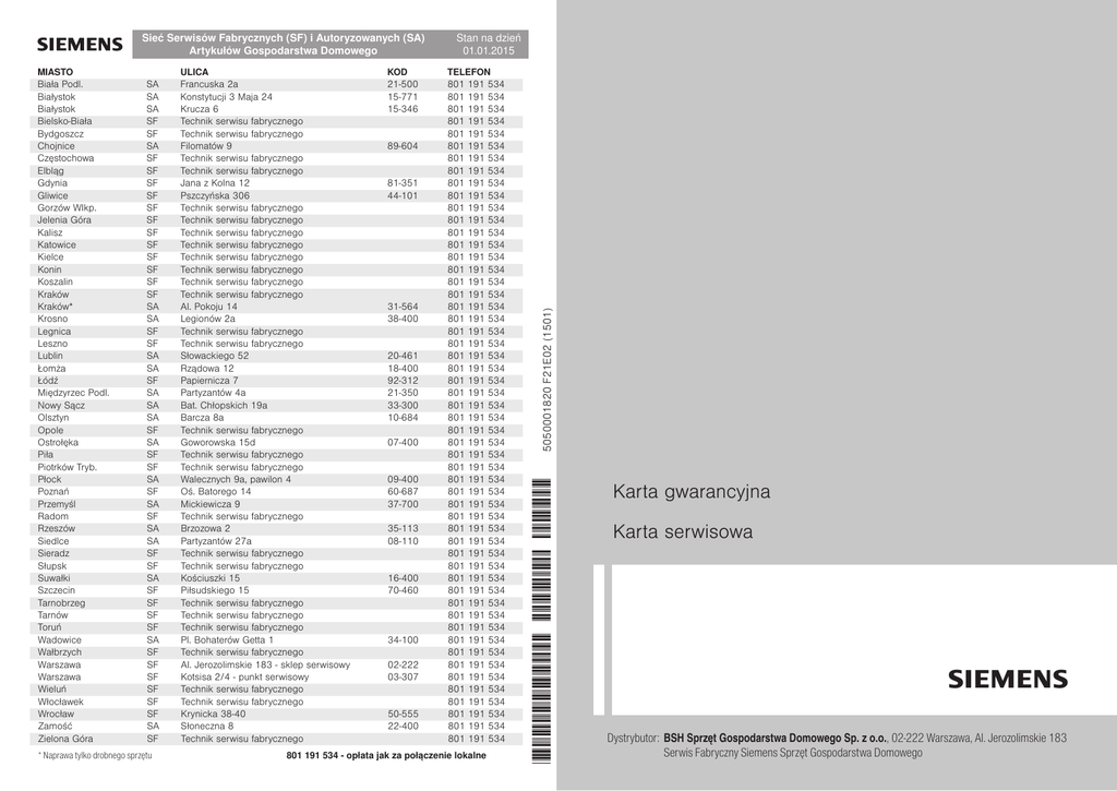 SA SA SA SF SF SA SF SF SF SF SF SF SF SF SF SF SF SF SA SA SF SF SA SA SF SA SA SA SF SA SF SF SA SF SA SF SA SA SF SF SA SF SF SF SF SA SF SF SF SF SF SF SA SF * Naprawa tylko drobnego sprzętu ULICA Francuska 2a Konstytucji 3 Maja 24 Krucza 6 Technik serwisu fabrycznego Technik serwisu fabrycznego Filomatów 9 Technik serwisu fabrycznego Technik serwisu fabrycznego Jana z Kolna 12 Pszczyńska 306 Technik serwisu fabrycznego Technik serwisu fabrycznego Technik serwisu fabrycznego Technik serwisu fabrycznego Technik serwisu fabrycznego Technik serwisu fabrycznego Technik serwisu fabrycznego Technik serwisu fabrycznego Al. Pokoju 14 Legionów 2a Technik serwisu fabrycznego Technik serwisu fabrycznego Słowackiego 52 Rządowa 12 Papiernicza 7 Partyzantów 4a Bat. Chłopskich 19a Barcza 8a Technik serwisu fabrycznego Goworowska 15d Technik serwisu fabrycznego Technik serwisu fabrycznego Walecznych 9a, pawilon 4 Oś. Batorego 14 Mickiewicza 9 Technik serwisu fabrycznego Brzozowa 2 Partyzantów 27a Technik serwisu fabrycznego Technik serwisu fabrycznego Kościuszki 15 Piłsudskiego 15 Technik serwisu fabrycznego Technik serwisu fabrycznego Technik serwisu fabrycznego Pl. Bohaterów Getta 1 Technik serwisu fabrycznego Al. Jerozolimskie 183 - sklep serwisowy Kotsisa 2/4 - punkt serwisowy Technik serwisu fabrycznego Technik serwisu fabrycznego Krynicka 38-40 Słoneczna 8 Technik serwisu fabrycznego KOD 21-500 15-771 15-346 89-604 81-351 44-101 31-564 38-400 20-461 18-400 92-312 21-350 33-300 10-684 07-400 09-400 60-687 37-700 35-113 08-110 16-400 70-460 34-100 02-222 03-307 50-555 22-400 TELEFON 801 191 534 801 191 534 801 191 534 801 191 534 801 191 534 801 191 534 801 191 534 801 191 534 801 191 534 801 191 534 801 191 534 801 191 534 801 191 534 801 191 534 801 191 534 801 191 534 801 191 534 801 191 534 801 191 534 801 191 534 801 191 534 801 191 534 801 191 534 801 191 534 801 191 534 801 191 534 801 191 534 801 191 534 801 191 534 801 191 534 801 191 534 801 191 534 801 191 534 801 191 534 801 191 534 801 191 534 801 191 534 801 191 534 801 191 534 801 191 534 801 191 534 801 191 534 801 191 534 801 191 534 801 191 534 801 191 534 801 191 534 801 191 534 801 191 534 801 191 534 801 191 534 801 191 534 801 191 534 801 191 534 801 191 534 - opłata jak za połączenie lokalne 5050001820 F21E02 (1501) MIASTO Biała Podl. Białystok Białystok Bielsko-Biała Bydgoszcz Chojnice Częstochowa Elbląg Gdynia Gliwice Gorzów Wlkp. Jelenia Góra Kalisz Katowice Kielce Konin Koszalin Kraków Kraków* Krosno Legnica Leszno Lublin Łomża Łódź Międzyrzec Podl. Nowy Sącz Olsztyn Opole Ostrołęka Piła Piotrków Tryb. Płock Poznań Przemyśl Radom Rzeszów Siedlce Sieradz Słupsk Suwałki Szczecin Tarnobrzeg Tarnów Toruń Wadowice Wałbrzych Warszawa Warszawa Wieluń Włocławek Wrocław Zamość Zielona Góra Stan na dzień 01.01.2015 *5050001820 F21E02 1412* Sieć Serwisów Fabrycznych (SF) i Autoryzowanych (SA) Artykułów Gospodarstwa Domowego Karta gwarancyjna Karta serwisowa s Dystrybutor: BSH Sprzęt Gospodarstwa Domowego Sp. z o.o., 02-222 Warszawa, Al. Jerozolimskie 183 Serwis Fabryczny Siemens Sprzęt Gospodarstwa Domowego KARTA GWARANCYJNA KARTA SERWISOWA Karta gwarancyjna jest ważna tylko z dowodem zakupu Nazwa sprzętu .................................................................. Typ, model ........................................................................... FD ....................................................................................... Data sprzedaży ............................................................... Rachunek nr ............................................................... CAŁODOBOWA OBSŁUGA TELEFONICZNA 24 godziny na dobę, 7 dni w tygodniu DYSTRYBUTOR BSH Sprzęt Gospodarstwa Domowego Sp. z o. o., Al. Jerozolimskie 183, 02-222 Warszawa, wpisana do Krajowego Rejestru Sądowego prowadzonego przez Sąd Rejonowy dla m. st. Warszawy w Warszawie, XII Wydział Gospodarczy pod nr KRS: 0000023973, NIP: 524-010-46-41, kapitał zakładowy 300 000 000 zł. 801 191 534 Centrala tel. 22 572 76 00 .................................................................................................. Zgłaszanie usterek on-line na stronie: www.siemens-home.pl pieczęć i podpis sprzedawcy WARUNKI GWARANCJI BSH Sprzęt Gospodarstwa Domowego Sp. z o. o. z siedzibą w Warszawie w Al. Jerozolimskich 183, 02-222 Warszawa (dalej „BSH”) gwarantuje sprawne działanie sprzętu w okresie 24 m-cy od daty wydania sprzętu kupującemu. Ujawnione w tym okresie wady będą usuwane bezpłatnie na terenie Rzeczpospolitej Polski przez fabryczny lub autoryzowany serwis (dalej „Warsztat Serwisowy”) według poniżej podanych zasad: 1.Niniejsza karta gwarancyjna jest ważna tylko z dowodem zakupu reklamowanego sprzętu. Zgłoszenie wady sprzętu na podstawie niniejszej gwarancji powinno nastąpić niezwłocznie, nie później niż terminie 30 dni od dnia wykrycia wady. 2.Niniejsza gwarancja nie wyłącza, nie ogranicza, ani nie zawiesza uprawnień kupującego wynikających z przepisów o rękojmi za wady rzeczy sprzedanej. 3.Warsztat Serwisowy dokona naprawy w ciągu 14 dni (roboczych) od otrzymania reklamowanego sprzętu, jeżeli klient wraz ze zgłoszeniem reklamacji sprzętu do Warsztatu Serwisowego dostarczy reklamowany sprzęt. 4.Jeżeli klient wraz ze zgłoszeniem reklamacji sprzętu do Warsztatu Serwisowego nie dostarczy reklamowanego sprzętu, Warsztat Serwisowy dokona naprawy w ciągu 21 dni (roboczych) od otrzymania zgłoszenia reklamacji pod warunkiem, że klient dostarczy reklamowany sprzęt w ciągu 7 dni (kalendarzowych) od zgłoszenia reklamacji do Warsztatu Serwisowego. Jeśli klient nie dostarczy reklamowanego sprzętu do Warsztatu Serwisowego w ciągu 7 dni (kalendarzowych), termin dokonania naprawy przez Warsztat Serwisowy będzie liczony od dnia dostarczenia reklamowanego sprzętu do Warsztatu Serwisowego zgodnie z pkt. 4 powyżej. 5.Termin usunięcia w