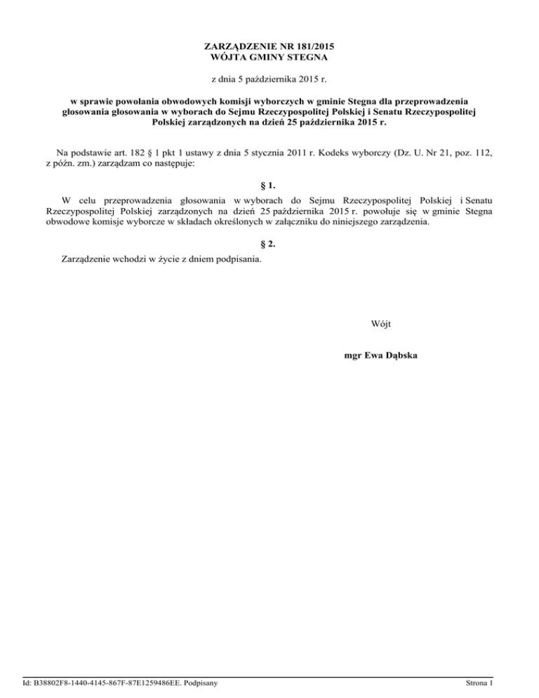 ZARZĄDZENIE NR 181/2015 WÓJTA GMINY STEGNA z dnia 5 października 2015 r. w sprawie powołania obwodowych komisji wyborczych w gminie Stegna dla przeprowadzenia głosowania głosowania w wyborach do Sejmu Rzeczypospolitej Polskiej i Senatu Rzeczypospolitej Polskiej zarządzonych na dzień 25 października 2015 r. Na podstawie art. 182 § 1 pkt 1 ustawy z dnia 5 stycznia 2011 r. Kodeks wyborczy (Dz. U. Nr 21, poz. 112, z późn. zm.) zarządzam co następuje: § 1. W celu przeprowadzenia głosowania w wyborach do Sejmu Rzeczypospolitej Polskiej i Senatu Rzeczypospolitej Polskiej zarządzonych na dzień 25 października 2015 r. powołuje się w gminie Stegna obwodowe komisje wyborcze w składach określonych w załączniku do niniejszego zarządzenia. § 2. Zarządzenie wchodzi w życie z dniem podpisania. Wójt mgr Ewa Dąbska Id: B38802F8-1440-4145-867F-87E1259486EE. Podpisany Strona 1 Załącznik do Zarządzenia Nr 181/2015 Wójta Gminy Stegna z dnia 5 października 2015 r. SKŁAD obwodowych komisji wyborczych powołanych w gminie Stegna Lp. Miejsce Nazwa podmiotu dokonującego zgłoszenia członka komisji zamieszkania Obwodowa Komisja ds. Referendum w obwodzie głosowania Nr 1 w Stegnie Urząd Gminy w Stegnie, ul. Gdańska 34 Nazwisko i imię (imiona) 1. Żak Wanda Stegna KWW ZBIGNIEWA STONOGI 2. Popielarz Ryszard Stegna KW POLSKIE STRONNICTWO LUDOWE 3. Ząbek Henryk Jan Stegna KW PRAWO I SPRAWIEDLIWOŚĆ 4. Milewicz Jarosław Stanisław Stegna KKW Zjednoczona Lewica SLD+TR+PPS+UP+Zieloni 5. Gałęziewska Elżbieta Stegna KW PLATFORMA OBYWATELSKA RP 6. Jarocka Agnieszka Małgorzata Stegna wyborca uzupełniający skład komisji 7. Suchewicz Ewa Alicja Stegna osoba wskazana przez Wójta Obwodowa Komisja ds. Referendum w obwodzie głosowania Nr 2 w Rybinie Dom Ludowy w Rybinie Nr 63 1. Wyrzykowska Bożena Rybina KWW ZBIGNIEWA STONOGI 2. Matusak Renata Tujsk KW POLSKIE STRONNICTWO LUDOWE 3. Gołębiewski Andrzej Rybina KW PRAWO I SPRAWIEDLIWOŚĆ 4. Hajdamowicz Danuta Rybina KKW Zjednoczona Lewica SLD+TR+PPS+UP+Zieloni 5. Komorowska Mirosława Barbara Rybina KW PLATFORMA OBYWATELSKA RP 6. Maćkowska Katarzyna Beata Stegna wyborca uzupełniający skład komisji 7. Tokarski Rafał Gozdawa osoba wskazana przez Wójta Obwodowa Komisja ds. Referendum w obwodzie głosowania Nr 3 w Tujsku Świetlica Wiejska w Tujsku Nr 34 1. Rodak Grzegorz Id: B38802F8-1440-4145-867F-87E1259486EE. Podpisany Stegna KWW ZBIGNIEWA STONOGI Strona 1 2. Goliszek Danuta Tujsk KW POLSKIE STRONNICTWO LUDOWE 3. Rodak Beata Halina Stegna KW PRAWO I SPRAWIEDLIWOŚĆ 4. Rutkowska Katarzyna Stegna KKW Zjednoczona Lewica SLD+TR+PPS+UP+Zieloni 5. Leończuk Teresa Świerznica wyborca uzupełniający skład komisji 6. Matusak Patryk Dawid Tujsk wyborca uzupełniający skład komisji 7. Twardowska Monika Stegna osoba wskazana przez Wójta Obwodowa Komisja ds. Referendum w obwodzie głosowania Nr 4 w Dworku Świetlica Wiejska w Dworku Nr 6 1. Trzaskowska Katarzyna Barbara Drewnica KWW ZBIGNIEWA STONOGI 2. Kukułka Magdalena Maria Dworek KW POLSKIE STRONNICTWO LUDOWE 3. Stępień Sabina Elżbieta Dworek KW PRAWO I SPRAWIEDLIWOŚĆ 4. Watkowska Renata Iwona Mikoszewo KKW Zjednoczona Lewica SLD+TR+PPS+UP+Zieloni 5. Dolińska Marzena Dworek KW PLATFORMA OBYWATELSKA RP 6. Ciechanowska Anna Ewelina Drewnica wyborca uzupełniający skład komisji 7. Karolak Magdalena Anna Dworek osoba wskazana przez Wójta Obwodowa Komisja ds. Referendum w obwodzie głosowania Nr 5 w Bronowie Świetlica Wiejska w Bronowie Nr 13b 1. Charlińska Anna Małgorzata Niedźwiedzica KWW ZBIGNIEWA STONOGI 2. Żytkowski Jerzy Piotr Bronowo KW POLSKIE STRONNICTWO LUDOWE 3. Wojciuch Mieczysław Stanisław Stegna KW PRAWO I SPRAWIEDLIWOŚĆ 4. Masłoń Marta Bronowo KKW Zjednoczona Lewica SLD+TR+PPS+UP+Zieloni 5. Duraj Bogumiła Zofia Bronowo KW PLATFORMA OBYWATELSKA RP 6. Gardynik Kamila Marta Drewnica wyborca uzupełniający skład komisji 7. Szwaczka Małgorzata Bronowo osoba wskazana przez Wójta Obwodowa Komisja ds. Referendum w obwodzie głosowania Nr 6 w Jantarze Świetlica Wiejska w Jantarze, ul. Gdańska Nr 27a 1. Bobowska Anna Id: B38802F8-1440-4145-867F-87E1259486EE. Podpisany Jantar KWW ZBIGNIEWA STONOGI Strona 2 2. Nicgorski Zdzisław Jantar KW POLSKIE STRONNICTWO LUDOWE 3. Wojciuch Krzysztof Sławomir Stegna KW PRAWO I SPRAWIEDLIWOŚĆ 4. Sendecka Aleksandra Mikoszewo KKW Zjednoczona Lewica SLD+TR+PPS+UP+Zieloni 5. Grocholska Agnieszka Magdalena Junoszyno KW PLATFORMA OBYWATELSKA RP 6. Żak Marcin Wojciech Stegna wyborca uzupełniający skład komisji 7. Cholewa Joanna Ewa Stegna osoba wskazana przez Wójta Obwodowa Komisja ds. Referendum w obwodzie głosowania Nr 7 w Mikoszewie Gimnazjum Publiczne w Mikoszewie,ul. Gdańska 29 1. Grochowalska Krystyna Zofia Drewnica KWW ZBIGNIEWA STONOGI 2. Tołczyk Krzysztof Mikoszewo KW POLSKIE STRONNICTWO LUDOWE 3. Dąbski Jakub Drewnica KW PRAWO I SPRAWIEDLIWOŚĆ 4. Drągowska Brygida Mikoszewo KKW Zjednoczona Lewica SLD+TR+PPS+UP+Zieloni 5. Pietrzak Bożena Jadwiga Mikoszewo KW PLATFORMA OBYWATELSKA RP 6. Mickiewicz Iwona Teresa Mikoszewo wyborca uzupełniający skład komisji 7. Charkiewicz Ewelina Agnieszka Stegna osoba wskazana przez Wójta Obwodowa Komisja ds. Referendum w obwodzie głosowania Nr 8 w Drewnicy Zespół Szkolno – Przedszkolnyw Drewnicy, ul. Wierzbowa 7 1. Arcabowicz Mirosława Alina Drewnica KWW ZBIGNIEWA STONOGI 2. Hudomięt Jan Przemysław KW POLSKIE STRONNICTWO LUDOWE 3. Koszelak Kamil Drewnica KW PRAWO I SPRAWIEDLIWOŚĆ 4. Gemza Paweł Stegienka KKW Zjednoczona Lewica SLD+TR+PPS+UP+Zieloni 5. Feretycka Ewa Agnieszka Mikoszewo KW PLATFORMA OBYWATELSKA RP 6. Gutkowska Agnieszka Anna Żuławki wyborca uzupełniający skład komisji 7. Mianowska Alina Czesława Jantar osoba wskazana przez Wójta Obwodowa Komisja ds. Referendum w obwodzie głosowania Nr 9 w DPS „MORS” w Stegnie Dom Pomocy Społecznej „MORS” w Stegnie, ul. Morska 11 1. Zawiślak Jadwiga Id: B38802F8-1440-4145-867F-87E12