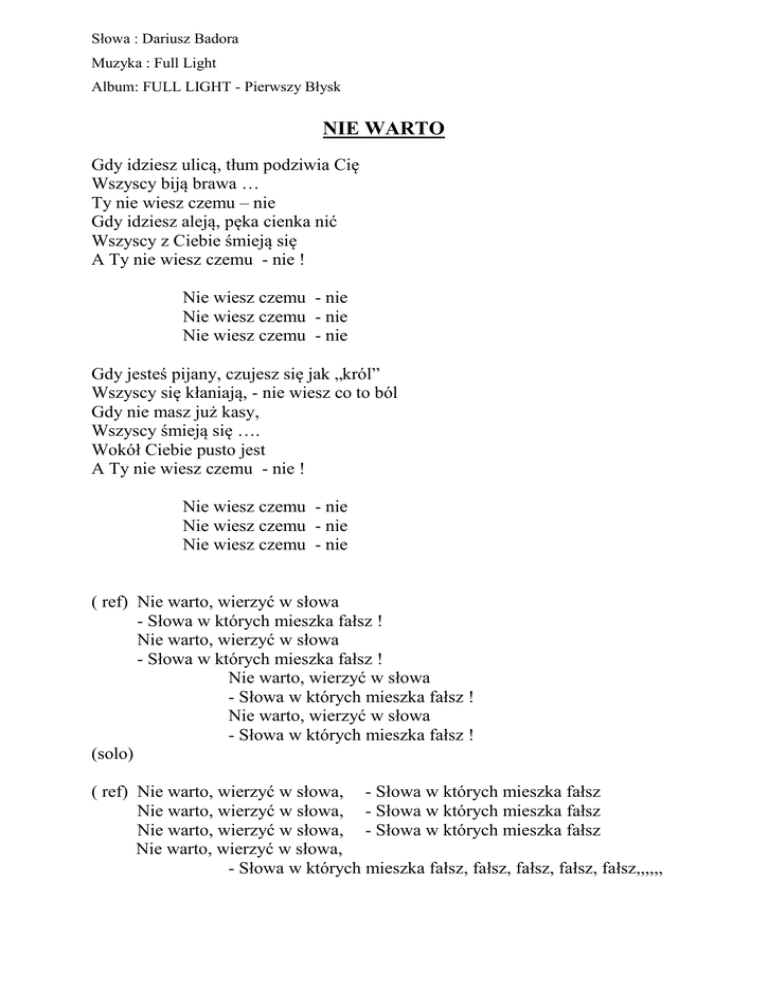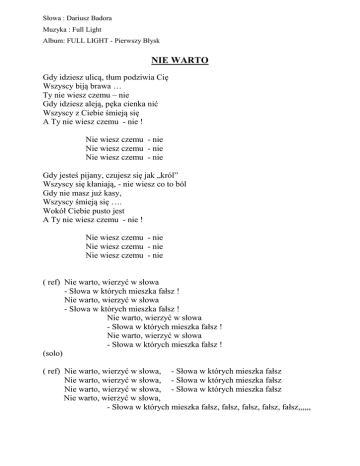 Słowa : Dariusz Badora Muzyka : Full Light Album: FULL LIGHT - Pierwszy Błysk NIE WARTO Gdy idziesz ulicą, tłum podziwia Cię Wszyscy biją brawa … Ty nie wiesz czemu – nie Gdy idziesz aleją, pęka cienka nić Wszyscy z Ciebie śmieją się A Ty nie wiesz czemu - nie ! Nie wiesz czemu - nie Nie wiesz czemu - nie Nie wiesz czemu - nie Gdy jesteś pijany, czujesz się jak „król” Wszyscy się kłaniają, - nie wiesz co to ból Gdy nie masz już kasy, Wszyscy śmieją się …. Wokół Ciebie pusto jest A Ty nie wiesz czemu - nie ! Nie wiesz czemu - nie Nie wiesz czemu - nie Nie wiesz czemu - nie ( ref) Nie warto, wierzyć w słowa - Słowa w których mieszka fałsz ! Nie warto, wierzyć w słowa - Słowa w których mieszka fałsz ! Nie warto, wierzyć w słowa - Słowa w których mieszka fałsz ! Nie warto, wierzyć w słowa - Słowa w których mieszka fałsz ! (solo) ( ref) Nie warto, wierzyć w słowa, - Słowa w których mieszka fałsz Nie warto, wierzyć w słowa, - Słowa w których mieszka fałsz Nie warto, wierzyć w słowa, - Słowa w których mieszka fałsz Nie warto, wierzyć w słowa, - Słowa w których mieszka fałsz, fałsz, fałsz, fałsz, fałsz,,,,,,