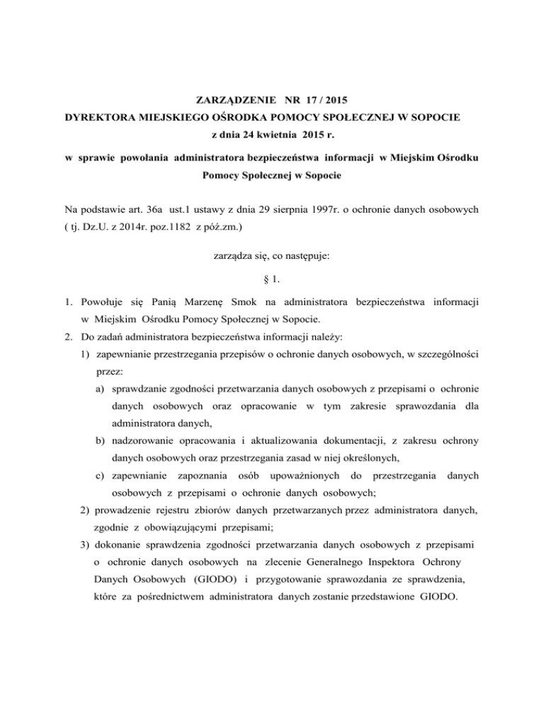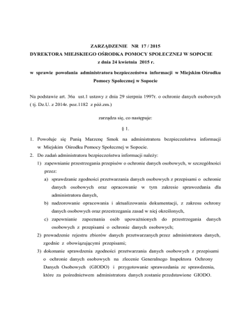ZARZĄDZENIE NR 17 / 2015 DYREKTORA MIEJSKIEGO OŚRODKA POMOCY SPOŁECZNEJ W SOPOCIE z dnia 24 kwietnia 2015 r. w sprawie powołania administratora bezpieczeństwa informacji w Miejskim Ośrodku Pomocy Społecznej w Sopocie Na podstawie art. 36a ust.1 ustawy z dnia 29 sierpnia 1997r. o ochronie danych osobowych ( tj. Dz.U. z 2014r. poz.1182 z póź.zm.) zarządza się, co następuje: § 1. 1. Powołuje się Panią Marzenę Smok na administratora bezpieczeństwa informacji w Miejskim Ośrodku Pomocy Społecznej w Sopocie. 2. Do zadań administratora bezpieczeństwa informacji należy: 1) zapewnianie przestrzegania przepisów o ochronie danych osobowych, w szczególności przez: a) sprawdzanie zgodności przetwarzania danych osobowych z przepisami o ochronie danych osobowych oraz opracowanie w tym zakresie sprawozdania dla administratora danych, b) nadzorowanie opracowania i aktualizowania dokumentacji, z zakresu ochrony danych osobowych oraz przestrzegania zasad w niej określonych, c) zapewnianie zapoznania osób upoważnionych do przestrzegania danych osobowych z przepisami o ochronie danych osobowych; 2) prowadzenie rejestru zbiorów danych przetwarzanych przez administratora danych, zgodnie z obowiązującymi przepisami; 3) dokonanie sprawdzenia zgodności przetwarzania danych osobowych z przepisami o ochronie danych osobowych na zlecenie Generalnego Inspektora Ochrony Danych Osobowych (GIODO) i przygotowanie sprawozdania ze sprawdzenia, które za pośrednictwem administratora danych zostanie przedstawione GIODO. § 2. Traci moc Zarządzenie Nr 15/08 Dyrektora Miejskiego Ośrodka Pomocy Społecznej w Sopocie z dnia 30 kwietnia 2008r. w sprawie wyznaczenia administratora bezpieczeństwa informacji w Miejskim Ośrodku Pomocy Społecznej w Sopocie. § 3. Zarządzenie wchodzi w życie z dniem podpisania z mocą obowiązującą od dnia 1 maja 2015r. DYREKTOR Miejskiego Ośrodka Pomocy Społecznej / - / mgr Anna Jarosz