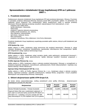 Sprawozdanie z działalności Grupy kapitałowej ATM za I półrocze 2007 r. 1. Przedmiot działalności Podstawowym obszarem działalności Grupy kapitałowej ATM jest produkcja telewizyjna i filmowa. Przychody ze sprzedaŜy produkcji telewizyjno-filmowej stanowią ponad 90% przychodów ogółem. W odróŜnieniu od większości innych krajowych firm producenckich zakres świadczonych usług w zakresie produkcji telewizyjno–filmowej obejmuje produkcję wszystkich najwaŜniejszych form telewizyjnych, w tym: – programy typu reality-show, – seriale telewizyjne i telenowele, – teleturnieje, – programy z gatunku telewizji emocjonalnej, – krótkie seriale komediowe, tzw. sitcomy, – filmy fabularne i dokumentalne, – talk-shows, makeover shows, – filmy animowane, – programy rozrywkowe, filmy reklamowe i inne formy telewizyjne. Przedmiot działalności Grupy kapitałowej uzupełniają pozostałe spółki zaleŜne, których profil działalności jest następujący: ATM System Sp. z o.o. Spółka zaleŜna w 100%, świadcząca usługi pomocnicze dla produkcji telewizyjnej i filmowej tj. usługi realizacji, dźwiękowe, montaŜowe, oświetleniowe, operatorskie, informatyczne oraz transportowe. Spółka jest integratorem całego zaplecza technicznego Grupy. ATM Investment Sp. z o.o. Spółka zaleŜna w 100%, świadcząca usługi wynajmu studia, pokoi gościnnych, pomieszczeń biurowych i magazynowych a takŜe usługi gastronomiczne. Spółka dokonuje wszelkich inwestycji związanych z nieruchomościami Grupy. Profilm Agencja Filmowa Sp. z o.o. Spółka zaleŜna w 100%, świadcząca usługi w zakresie produkcji telewizyjnej i filmowej, w szczególności w produkcji programów dziecięcych, rozrywkowych, publicystycznych, filmów dokumentalnych i reportaŜy oraz teatrów telewizji i filmów fabularnych. Agencja Usług Telewizyjnych AUT Sp. z o.o. Spółka zaleŜna w 100% od Profilm Agencja Filmowa Sp. z o.o., świadcząca usługi w zakresie wynajmu sprzętu, organizacji produkcji i zespołów produkcyjnych, realizacji filmów, programów i innych projektów telewizyjnych oraz postprodukcji filmowej i telewizyjnej. 2. Główni akcjonariusze spółki ATM Grupa S.A. Na koniec okresu sprawozdawczego, według posiadanych przez spółkę informacji, posiadającymi powyŜej 5% akcji byli: Akcjonariusz Dorota Michalak-Kurzewska i Tomasz Kurzewski Liczba akcji Procent kapitału akcjonariuszami Liczba głosów Procent głosów 1.836.000 51,00% 2.986.000 62,86% 464.000 12,89% 464.000 9,77% Zygmunt Solorz-śak wraz z podmiotami zaleŜnymi, w tym część na rachunek banku powiernika EFG Bank S.A. EFG Bank S.A. z siedzibą w Zurychu posiada 437.499 akcji stanowiących 12,15% kapitału oraz 9,21% głosów Sprawozdanie z działalności Grupy kapitałowej ATM za I półrocze 2007 r. 1/28 Na dzień sporządzenia sprawozdania, według posiadanych przez spółkę informacji, akcjonariuszami posiadającymi powyŜej 5% akcji byli: Akcjonariusz Dorota Michalak-Kurzewska i Tomasz Kurzewski Zygmunt Solorz-śak wraz z podmiotami zaleŜnymi, w tym część na rachunek banku powiernika EFG Bank S.A. EFG Bank S.A. z siedzibą w Zurychu posiada 437.499 akcji stanowiących 12,15% kapitału oraz 9,21% głosów ING Towarzystwo Funduszy Inwestycyjnych S.A. Liczba akcji Procent kapitału Liczba głosów Procent głosów 1.721.000 47,81% 2.871.000 60,44% 464.000 12,89% 464.000 9,77% 313.146 8,70% 313.146 6,59% Ponadto w dniu 06.09.2007 r. spółka otrzymała od Millennium Towarzystwo Funduszy Inwestycyjnych S.A. występującego w imieniu zarządzanych przez siebie funduszy inwestycyjnych (Millennium Funduszu Inwestycyjnego Otwartego Akcji, Millennium Funduszu Inwestycyjnego Otwartego Małych i Średnich Spółek, Millennium Funduszu Inwestycyjnego Otwartego ZrównowaŜonego, Millennium Funduszu Inwestycyjnego Otwartego Stabilnego Wzrostu) zawiadomienie, Ŝe Fundusze te według stanu na dzień 31.07.2007 r. przekroczą 5% liczby głosów na WZA spółki, pod warunkiem zarejestrowania przez sąd rejestrowy podwyŜszenia kapitału spółki w związku z emisją akcji serii D. W dniu 31.07.2007 r. zostały rozliczone w KDPW S.A. transakcje kupna praw poboru akcji serii D, które przy załoŜeniu rejestracji podwyŜszenia kapitału spowodują, Ŝe zaangaŜowanie Funduszy przekroczy 5% ogólnej liczby głosów w spółce. Jednocześnie Millennium Towarzystwo Funduszy Inwestycyjnych S.A. poinformowało, Ŝe na dzień zapisania praw do akcji serii D na rachunkach w KDPW S.A. tj. na 21.08.2007r. Fundusze posiadały prawa do akcji w liczbie, która przy załoŜeniu rejestracji podwyŜszenia kapitału będzie przekraczać 5% ogólnej liczby głosów w spółce. Na dzień 31.07.2007 r. tj. na dzień rozliczenie transakcji w KDPW S.A. Fundusze posiadały 1.410.000 praw poboru. Zapis na akcje został wykonany w oparciu o 1.409.993 praw poboru. JeŜeli podwyŜszenie kapitału zakładowego zostanie zarejestrowane, prezentowania liczba praw poboru uprawni Fundusze do 274.165 akcji, co stanowić będzie 6,3759% udziału w kapitale zakładowym oraz do 274.165 głosów z akcji, co stanowić będzie 5,0306% udziału w ogólnej liczbie głosów. Na dzień 21.08.2007r., czyli w dniu zapisania praw do akcji serii D na rachunkach w KDPW S.A. Fundusze posiadały 274.165 praw do akcji serii D, co pod warunkiem zarejestrowania podwyŜszenia kapitału uprawni do 274.165 akcji serii D, które stanowić będą taki sam udział w kapitale i w głosach jak podano powyŜej. Nie są znane zarządowi spółki Ŝadne umowy w wyniku, których mogą w przyszłości nastąpić zmiany w proporcjach posiadanych akcji przez dotychczasowych akcjonariuszy. Dorota Michalak-Kurzewska oraz Tomasz Kurzewski są posiadaczami łącznie 1150 tys. akcji serii A, które są uprzywilejowane co do głosu w taki sposób, Ŝe jedna akcja daje prawo do dwóch głosów na WZA. PoniewaŜ spółka nie posiada programu akcji pracowniczych nie istnieje równieŜ system jego kontrol