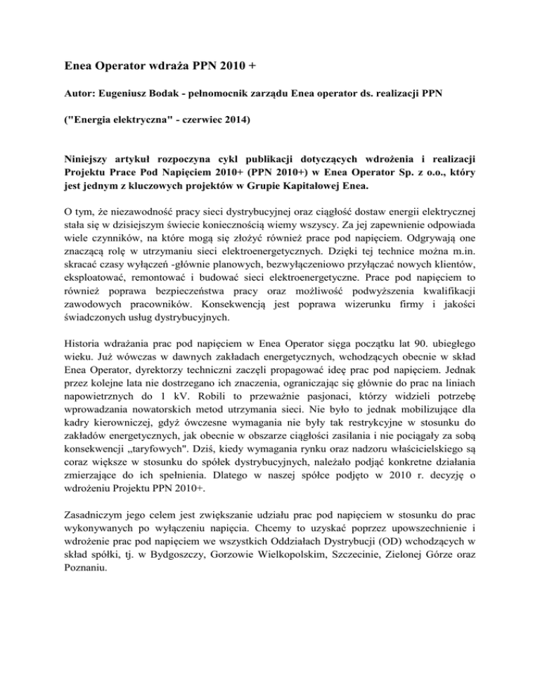 Projektu Prace Pod Napięciem 2010+ (PPN 2010+) w Enea Operator Sp. z o.o., który