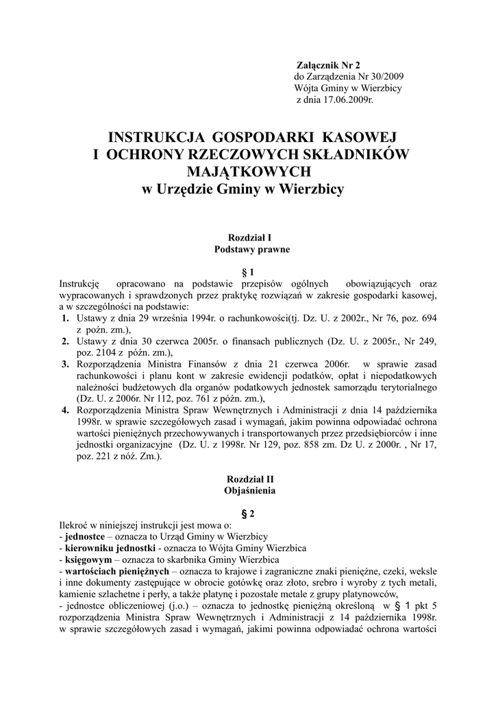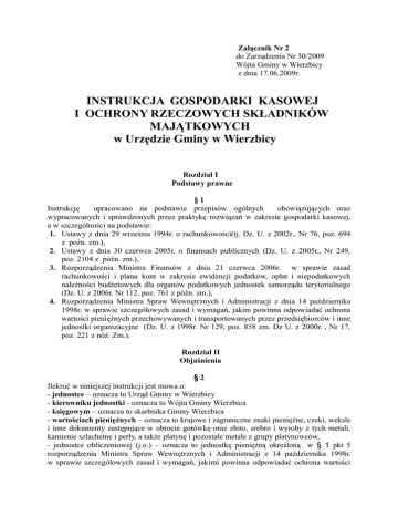 Załącznik Nr 2 do Zarządzenia Nr 30/2009 Wójta Gminy w Wierzbicy z dnia 17.06.2009r. INSTRUKCJA GOSPODARKI KASOWEJ I OCHRONY RZECZOWYCH SKŁADNIKÓW MAJĄTKOWYCH w Urzędzie Gminy w Wierzbicy Rozdział I Podstawy prawne §1 Instrukcję opracowano na podstawie przepisów ogólnych obowiązujących oraz wypracowanych i sprawdzonych przez praktykę rozwiązań w zakresie gospodarki kasowej, a w szczególności na podstawie: 1. Ustawy z dnia 29 września 1994r. o rachunkowości(tj. Dz. U. z 2002r., Nr 76, poz. 694 z poźn. zm.), 2. Ustawy z dnia 30 czerwca 2005r. o finansach publicznych (Dz. U. z 2005r., Nr 249, poz. 2104 z późn. zm.), 3. Rozporządzenia Ministra Finansów z dnia 21 czerwca 2006r. w sprawie zasad rachunkowości i planu kont w zakresie ewidencji podatków, opłat i niepodatkowych należności budżetowych dla organów podatkowych jednostek samorządu terytorialnego (Dz. U. z 2006r. Nr 112, poz. 761 z późn. zm.), 4. Rozporządzenia Ministra Spraw Wewnętrznych i Administracji z dnia 14 października 1998r. w sprawie szczegółowych zasad i wymagań, jakim powinna odpowiadać ochrona wartości pieniężnych przechowywanych i transportowanych przez przedsiębiorców i inne jednostki organizacyjne (Dz. U. z 1998r. Nr 129, poz. 858 zm. Dz U. z 2000r. , Nr 17, poz. 221 z nóź. Zm.). Rozdział II Objaśnienia §2 Ilekroć w niniejszej instrukcji jest mowa o: - jednostce – oznacza to Urząd Gminy w Wierzbicy - kierowniku jednostki - oznacza to Wójta Gminy Wierzbica - księgowym – oznacza to skarbnika Gminy Wierzbica - wartościach pieniężnych – oznacza to krajowe i zagraniczne znaki pieniężne, czeki, weksle i inne dokumenty zastępujące w obrocie gotówkę oraz złoto, srebro i wyroby z tych metali, kamienie szlachetne i perły, a także platynę i pozostałe metale z grupy platynowców, - jednostce obliczeniowej (j.o.) – oznacza to jednostkę pieniężną określoną w § 1 pkt 5 rozporządzenia Ministra Spraw Wewnętrznych i Administracji z 14 października 1998r. w sprawie szczegółowych zasad i wymagań, jakimi powinna odpowiadać ochrona wartości pieniężnych przechowywanych i transportowanych przez przedsiębiorców i inne jednostki organizacyjne. Rozdział III Kasjer §3 1. Kasjerem może być jedynie osoba posiadająca minimum średnie wykształcenie, mająca nienaganną opinię, nie karana za przestępstwa gospodarcze lub wykroczenie przeciwko mieniu oraz posiadająca pełną zdolność do czynności prawnych. 2. Przyjęcie – przekazanie kasy może nastąpić jedynie protokolarnie, w obecności komisji wyznaczonej przez kierownika jednostki. 3. Kasjer musi na dowód przyjęcia odpowiedzialności materialnej złożyć deklarację o odpowiedzialności za powierzone mienie oraz o znajomości przepisów w zakresie dokonywania operacji kasowych i transportu gotówki. 4. Kasjer powinien posiadać obowiązującą w jednostce instrukcję w sprawie gospodarki kasowej oraz wykaz osób upoważnionych do dysponowania gotówką i zatwierdzania dowodów księgowych, jak również wzory ich podpisów. Rozdział IV Pomieszczenie kasy , ochrona i transport wartości pieniężnych §4 1. Pomieszczenie przeznaczone do przechowywania wartości pieniężnych powinno być odpowiednio wydzielone i zabezpieczone. Wszystkie okna pomieszczenia kasy winny być okratowane. Drzwi wejściowe do kasy winny być wzmocnione blachą i zaopatrzone w co najmniej dwa zamki. 2. W pomieszczeniu kasy powinno znajdować się zamykane okienko, przez które kasjer dokonuje wypłaty. Powinno ono być tak zainstalowane, aby uniemożliwiło wejście jakiejkolwiek osoby do wnętrza kasy. 3. W pomieszczeniu kasy winno być zainstalowane urządzenie alarmowe. Ponadto powinno być ono wyposażone w szafę stalową do przechowywania wartości pieniężnych. §5 1. wartości pieniężne muszą być przechowywane w warunkach zapewniających należytą ochronę przed zniszczeniem, utratą lub zagarnięciem. 2. Wartości pieniężne winny być przechowywane w kasecie stalowej lub szafie stalowej przymocowanej trwale do podłoża lub ściany. §6 1. Transport wartości pieniężnych w kwocie nie przekraczającej równowartości 1 jednostki obliczeniowej może być wykonywany pieszo, , jeżeli użycie pojazdu mechanicznego nie jest uzasadnione ze względu na odległość dzielącą jednostkę od banku pełniącego jej obsługę. 2. W przypadku gdy przenoszone wartości pieniężne przekraczają równowartość 0,3 jednostki obliczeniowej, osoba transportująca jest chroniona przez co najmniej jednego pracownika, który może być uzbrojony. 3. Wartości pieniężne większe niż 1 jednostka obliczeniowa transportuje się w asyście Policji. Rozdział V Gospodarka kasowa §7 1. W kasie może być: - niezbędny zapas gotówki na bieżące wydatki, tzw. „pogotowie kasowe” w wysokości 3.000,00 zł.(Słownie: Trzy tysiące złotych). - gotówka podjęta z rachunku bankowego na pokrycie określonych rodzajowo wydatków, - gotówka pochodząca z bieżących wpływów do kasy jednostki, - gotówka przechowywana jako depozyt od osób fizycznych i prawnych. 2. Nadwyżkę gotówki znajdującą się w kasie na koniec dnia, ponad ustaloną wysokość niezbędnego zapasu, odprowadza się w dniu powstania nadwyżki, a jeżeli są warunki do odpowiedniego zabezpieczenia przechowywanej gotówki – w dniu następnym na rachunek bankowy jednostki lub na rachunki bankowe właściwe dla adresatów (odbiorców gotówki). §8 1. Podjętą z rachunku bankowego gotówkę, przeznaczona na pokrycie określonych rodzajowo wydatków jednostki należy przeznaczyć na cel określony prze jej podjęciu. Niewykorzystaną część tej gotówki (nie podjęte należności oraz zwroty wypłaconych z niej zaliczek lub nienależnie pobranych kwot) urząd może również przeznaczyć na inne cele niż określone przy podjęciu gotówki z rachunków bankowych. 2. Gotówka podjęta z rachunku bankowego na pokrycie określonych rodzajowo w