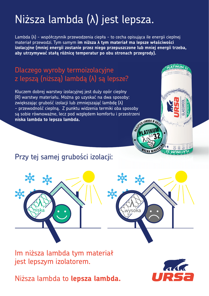 Niższa lambda (λ) jest lepsza. Lambda (λ) - współczynnik przewodzenia ciepła - to cecha opisująca ile energii cieplnej materiał przewodzi. Tym samym im niższa λ tym materiał ma lepsze właściwości izolacyjne (mniej energii zostanie przez niego przepuszczone lub mniej energii trzeba, aby utrzymywać stałą różnicę temperatur po obu stronach przegrody). Dlaczego wyroby termoizolacyjne z lepszą (niższą) lambdą (λ) są lepsze? Kluczem dobrej warstwy izolacyjnej jest duży opór cieplny (R) warstwy materiału. Można go uzyskać na dwa sposoby: zwiększając grubość izolacji lub zmniejszająć lambdę (λ) - przewodność cieplną. Z punktu widzenia termiki oba sposoby są sobie równoważne, lecz pod względem komfortu i przestrzeni niska lambda to lepsza lambda. Przy tej samej grubości izolacji: λ niska Im niższa lambda tym materiał jest lepszym izolatorem. Niższa lambda to lepsza lambda. λ wysoka Lambda a opór cieplny Opór cieplny (R) to charakterystyka cieplna jednorodnego materiału o określonej lambdzie (λ) i o określonej grubości (d). Wartość oporu termicznego wyznacza się z prostej zależności: d _ R= λ gdzie: d - grubość materiału [m] λ - współczynnik przewodzenia ciepła [W/mK] Im wyższy R tym warstwa materiału ma lepsze właściwości izolacyjne. Niższa lambda to lepsza lambda. ej λ j d d _ R = λ lepi lepi lepi ej lub lepie d _ R = λ ej Zwiększenie licznika - grubości materiału (d) powoduje pożądany wzrost oporu cieplnego (R). Ten sam efekt można uzyskać poprzez zmniejszenie mianownika - lambdy (λ) przy zachowaniu tej samej grupości materiału.
