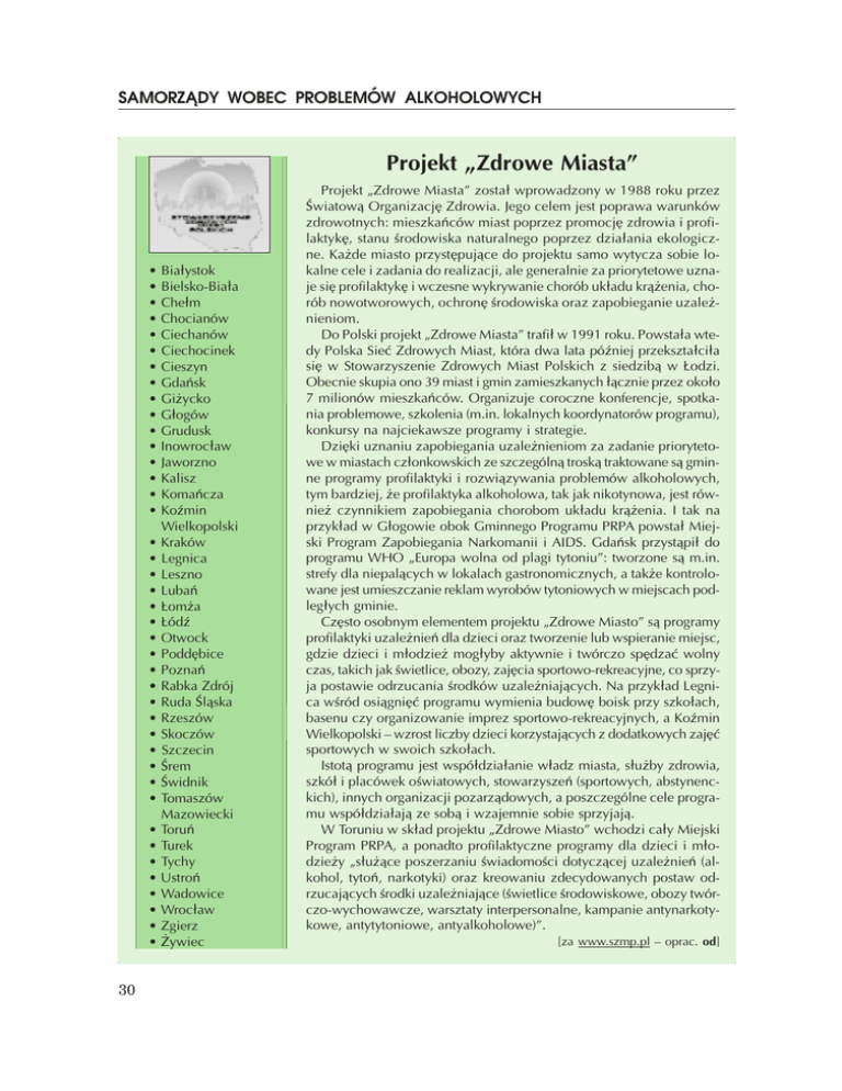 SAMORZ¥DY WOBEC PROBLEMÓW ALKOHOLOWYCH Projekt Zdrowe Miasta Bia³ystok Bielsko-Bia³a Che³m Chocianów Ciechanów Ciechocinek Cieszyn Gdañsk Gi¿ycko G³ogów Grudusk Inowroc³aw Jaworzno Kalisz Komañcza Komin Wielkopolski Kraków Legnica Leszno Lubañ £om¿a £ód Otwock Poddêbice Poznañ Rabka Zdrój Ruda l¹ska Rzeszów Skoczów Szczecin rem widnik Tomaszów Mazowiecki Toruñ Turek Tychy Ustroñ Wadowice Wroc³aw Zgierz ¯ywiec 30 Projekt Zdrowe Miasta zosta³ wprowadzony w 1988 roku przez wiatow¹ Organizacjê Zdrowia. Jego celem jest poprawa warunków zdrowotnych: mieszkañców miast poprzez promocjê zdrowia i profilaktykê, stanu rodowiska naturalnego poprzez dzia³ania ekologiczne. Ka¿de miasto przystêpuj¹ce do projektu samo wytycza sobie lokalne cele i zadania do realizacji, ale generalnie za priorytetowe uznaje siê profilaktykê i wczesne wykrywanie chorób uk³adu kr¹¿enia, chorób nowotworowych, ochronê rodowiska oraz zapobieganie uzale¿nieniom. Do Polski projekt Zdrowe Miasta trafi³ w 1991 roku. Powsta³a wtedy Polska Sieæ Zdrowych Miast, która dwa lata póniej przekszta³ci³a siê w Stowarzyszenie Zdrowych Miast Polskich z siedzib¹ w £odzi. Obecnie skupia ono 39 miast i gmin zamieszkanych ³¹cznie przez oko³o 7 milionów mieszkañców. Organizuje coroczne konferencje, spotkania problemowe, szkolenia (m.in. lokalnych koordynatorów programu), konkursy na najciekawsze programy i strategie. Dziêki uznaniu zapobiegania uzale¿nieniom za zadanie priorytetowe w miastach cz³onkowskich ze szczególn¹ trosk¹ traktowane s¹ gminne programy profilaktyki i rozwi¹zywania problemów alkoholowych, tym bardziej, ¿e profilaktyka alkoholowa, tak jak nikotynowa, jest równie¿ czynnikiem zapobiegania chorobom uk³adu kr¹¿enia. I tak na przyk³ad w G³ogowie obok Gminnego Programu PRPA powsta³ Miejski Program Zapobiegania Narkomanii i AIDS. Gdañsk przyst¹pi³ do programu WHO Europa wolna od plagi tytoniu: tworzone s¹ m.in. strefy dla niepal¹cych w lokalach gastronomicznych, a tak¿e kontrolowane jest umieszczanie reklam wyrobów tytoniowych w miejscach podleg³ych gminie. Czêsto osobnym elementem projektu Zdrowe Miasto s¹ programy profilaktyki uzale¿nieñ dla dzieci oraz tworzenie lub wspieranie miejsc, gdzie dzieci i m³odzie¿ mog³yby aktywnie i twórczo spêdzaæ wolny czas, takich jak wietlice, obozy, zajêcia sportowo-rekreacyjne, co sprzyja postawie odrzucania rodków uzale¿niaj¹cych. Na przyk³ad Legnica wród osi¹gniêæ programu wymienia budowê boisk przy szko³ach, basenu czy organizowanie imprez sportowo-rekreacyjnych, a Komin Wielkopolski wzrost liczby dzieci korzystaj¹cych z dodatkowych zajêæ sportowych w swoich szko³ach. Istot¹ programu jest wspó³dzia³anie w³adz miasta, s³u¿by zdrowia, szkó³ i placówek owiatowych, stowarzyszeñ (sportowych, abstynenckich), innych organizacji pozarz¹dowych, a poszczególne cele programu wspó³dzia³aj¹ ze sob¹ i wzajemnie sobie sprzyjaj¹. W Toruniu w sk³ad projektu Zdrowe Miasto wchodzi ca³y Miejski Program PRPA, a ponadto profilaktyczne programy dla dzieci i m³odzie¿y s³u¿¹ce poszerzaniu wiadomoci dotycz¹cej uzale¿nieñ (alkohol, tytoñ, narkotyki) oraz kreowaniu zdecydowanych postaw odrzucaj¹cych rodki uzale¿niaj¹ce (wietlice rodowiskowe, obozy twórczo-wychowawcze, warsztaty interpersonalne, kampanie antynarkotykowe, antytytoniowe, antyalkoholowe). [za www.szmp.pl oprac. od] SAMORZ¥DY WOBEC PROBLEMÓW ALKOHOLOWYCH Co dzia³o siê w Toruniu w padzierniku? Tak jak w poprzednich latach w Toruniu zosta³a zorganizowana kampania Padziernik 2001 miesi¹cem wolnym od uzale¿nieñ pod honorowym patronatem prezydenta miasta Wojciecha Grochowskiego. Przygotowa³y j¹ liczne instytucje miejskie i organizacje pozarz¹dowe. Jednak g³ówny ciê¿ar spocz¹³ na Wydziale Zdrowia i Pomocy Spo³ecznej Urzêdu Miejskiego i jego naczelniku, Zbigniewie Fiderewiczu. Ca³oæ kampanii zosta³a ujêta w Miejskim Programie Profilaktyki i Rozwi¹zywania Problemów Alkoholowych. Jej celem czytamy w okolicznociowej ulotce jest rozwój i wzmacnianie osobowoci oraz kszta³towanie zachowañ prozdrowotnych u dzieci i m³odzie¿y poprzez: wielokierunkow¹ edukacjê w zakresie szkodliwego wp³ywu narkotyków, alkoholu i tytoniu na organizm cz³owieka; bogat¹ ofertê zagospodarowania czasu wolnego; aktywne zaanga¿owanie dzieci i m³odzie¿y w tematyczne konkursy i okolicznociowe happeningi. 2 padziernika uroczysta inauguracja kampanii. Oko³o 1000 osób przemaszerowa³o z Nowego Rynku na Stary Rynek, gdzie oprócz oficjalnego wyst¹pienia wiceprezydenta miasta odby³ siê miting z programem artystycznym przeplatany wieloma konkursami. M³odzie¿ przygotowa³a na tê okazjê liczne transparenty i okrzyki przeciwko uzale¿nieniom (na przyk³ad Alkohol, narkotyki kradn¹ wolnoæ, psuj¹ m³odoæ, niszcz¹ mi³oæ, oszukuj¹, Jeli pijesz alkohol, bêdziesz s³abym uczniem w szkole). W marszu oprócz uczniów toruñskich szkó³ szli przedstawiciele w³adz miasta, organizacji zajmuj¹cych siê profilaktyk¹ i pomoc¹ charytatywn¹, radni. 6 padziernika rajd turystyczny na trasach pieszych i rowerowych w lasach podtoruñskiej Barbarki z udzia³em oko³o 600 osób. Wydzia³ Zdrowia i Pomocy Spo³ecznej Urzêdu Miejskiego i Oddzia³ Miejski PTTK zorganizowali go pod has³em Jestem wolny kocham siebie, nie chcê siê niszczyæ. Wszyscy uczestnicy dostali pami¹tkowy znaczek i talerz wojskowej grochówki, a uczestnicy konkursów rekreacyjno-sportowych nagrody. 8-12 padziernika kurs odwykowy W ci¹gu 5 dni rzucisz palenie, prowadzony przez pastora Kocio³a Adwentystów Dnia Siódmego. Wziê³o w nim udzia³ 45 osób. 18 padziernika debata m³odzie¿owa w auli Uniwersytetu im. Miko³aja Kopernika w ramach III Toruñskiego Forum Profilaktyki i Leczenia Uzale¿nieñ [*] z udzia³em ponad tysi¹ca uczniów gimnazjów i liceów. Jedno- Otwarcie kampanii na Rynku Staromiejskim czenie w auli wystawione zosta³y prace 