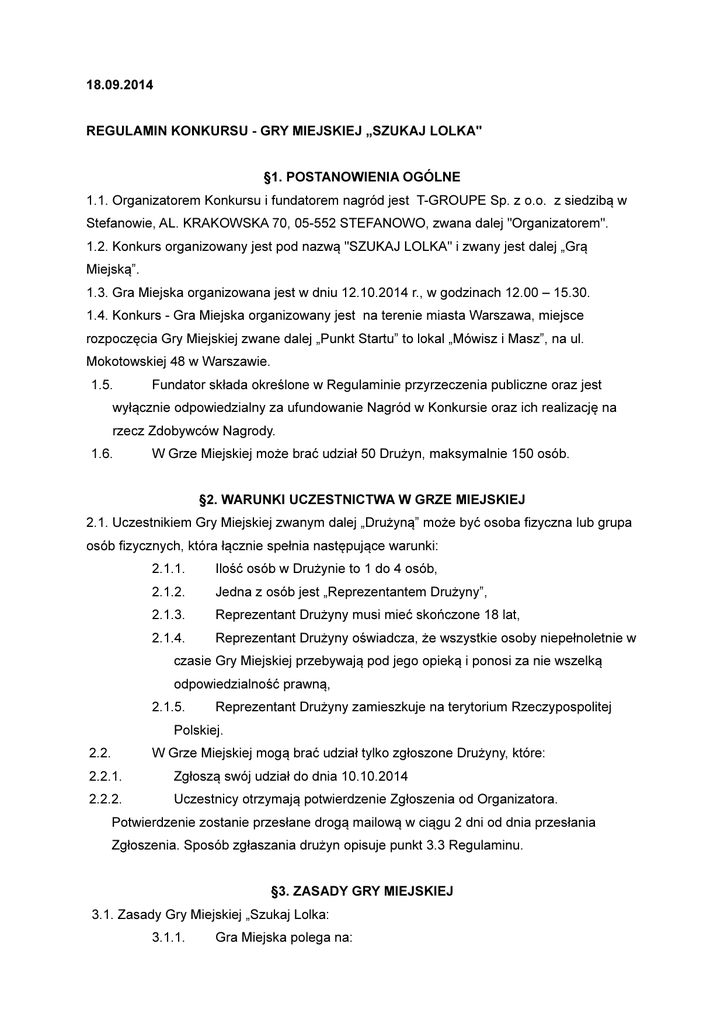 18.09.2014 REGULAMIN KONKURSU - GRY MIEJSKIEJ „SZUKAJ LOLKA" §1. POSTANOWIENIA OGÓLNE 1.1. Organizatorem Konkursu i fundatorem nagród jest T-GROUPE Sp. z o.o. z siedzibą w Stefanowie, AL. KRAKOWSKA 70, 05-552 STEFANOWO, zwana dalej "Organizatorem". 1.2. Konkurs organizowany jest pod nazwą "SZUKAJ LOLKA" i zwany jest dalej „Grą Miejską”. 1.3. Gra Miejska organizowana jest w dniu 12.10.2014 r., w godzinach 12.00 – 15.30. 1.4. Konkurs - Gra Miejska organizowany jest na terenie miasta Warszawa, miejsce rozpoczęcia Gry Miejskiej zwane dalej „Punkt Startu” to lokal „Mówisz i Masz”, na ul. Mokotowskiej 48 w Warszawie. 1.5. Fundator składa określone w Regulaminie przyrzeczenia publiczne oraz jest wyłącznie odpowiedzialny za ufundowanie Nagród w Konkursie oraz ich realizację na rzecz Zdobywców Nagrody. 1.6. W Grze Miejskiej może brać udział 50 Drużyn, maksymalnie 150 osób. §2. WARUNKI UCZESTNICTWA W GRZE MIEJSKIEJ 2.1. Uczestnikiem Gry Miejskiej zwanym dalej „Drużyną” może być osoba fizyczna lub grupa osób fizycznych, która łącznie spełnia następujące warunki: 2.1.1. Ilość osób w Drużynie to 1 do 4 osób, 2.1.2. Jedna z osób jest „Reprezentantem Drużyny”, 2.1.3. Reprezentant Drużyny musi mieć skończone 18 lat, 2.1.4. Reprezentant Drużyny oświadcza, że wszystkie osoby niepełnoletnie w czasie Gry Miejskiej przebywają pod jego opieką i ponosi za nie wszelką odpowiedzialność prawną, 2.1.5. Reprezentant Drużyny zamieszkuje na terytorium Rzeczypospolitej Polskiej. 2.2. W Grze Miejskiej mogą brać udział tylko zgłoszone Drużyny, które: 2.2.1. Zgłoszą swój udział do dnia 10.10.2014 2.2.2. Uczestnicy otrzymają potwierdzenie Zgłoszenia od Organizatora. Potwierdzenie zostanie przesłane drogą mailową w ciągu 2 dni od dnia przesłania Zgłoszenia. Sposób zgłaszania drużyn opisuje punkt 3.3 Regulaminu. §3. ZASADY GRY MIEJSKIEJ 3.1. Zasady Gry Miejskiej „Szukaj Lolka: 3.1.1. Gra Miejska polega na: 3.1.1.1. Przejściu przez Drużynę trasy, liczącej około 20 Punktów Kontrolne – od Punktu Startu do Punktu Mety. Zaczynając Grę Miejską, Drużyna otrzymuje wskazówki dotyczące tylko początkowych Punktów Kontrolnych, dalsze wskazówki otrzymuje w kolejnych Punktach Kontrolnych w różnej formie – zadań, wskazówek, map, zagadek itp. 3.1.1.2. Rozwiązaniu jak największej ilości Zadań. Zadania mają różnorodną formułę oraz są ściśle powiązanie z Punktami Kontrolnymi. 3.1.2. Rozpoczęcie Gry Miejskiej przez Drużynę zaczyna się zgłoszeniem w Punkcie Startu od godziny 12.00. 3.1.3. Każda Drużyna otrzymuje w Punkcie Startu jedną Kartę Zadań, na której wypełnia samodzielnie wyniki Zadań lub przykazuje je do wypełnienia animatorom obecnym w niektórych Punktach Kontrolnych. 3.1.4. Warunkiem klasyfikacji Drużyny do otrzymania nagród jest dojście Drużyny do Punktu Mety. Punkt Mety nie jest znany Drużynom od początku Gry Miejskiej, do Mety prowadzi jedno z Zadań poznanych w trakcie gry. 3.1.5. Przejście trasy Gry Miejskiej musi zakończyć się zgłoszeniem do Punktu Mety do godziny 15.30, niezależnie od godziny rozpoczęcia Gry Miejskiej przez Drużynę. 3.1.6. Możliwe jest pominięcie niektórych Punktów Kontrolnych lub Zadań, z tym zastrzeżeniem, że Drużyna nie otrzymuje za nie punktów oraz może nie otrzymać dalszych wskazówek co do dalszej trasy Gry Miejskiej. 3.1.7. Każda Drużyna otrzymuje 2 unikalne Hasła w zamkniętych kopertach, dzięki którym może otrzymać w dowolnym momencie Gry Miejskiej do dwóch podpowiedzi (na przykład w przypadku, gdy nie będzie w stanie znaleźć kolejnego Punktu Kontrolnego, niezbędnego do kontynuowania Gry Miejskiej). Aby otrzymać podpowiedź należy zadzwonić pod wskazany w kopercie numer telefonu komórkowego (opłata zgodna ze stawkami operatora przypisanymi do numeru telefonu osoby dzwoniącej). 3.1.8. Zachowania, które są zabronione podczas Gry Miejskiej i mogą skutkować wykluczeniem Drużyny: • korzystanie z urządzeń typu GPS oraz map elektronicznych • komunikowanie się drużyn między sobą • zachowania, które mogą zostać uznane przez Organizatora za sprzeczne z obowiązującym prawem, zasadami współżycia społecznego, dobrymi obyczajami, naruszające prawa Organizatora lub osób trzecich, naruszające dobra osobiste, obraźliwe, wulgarne lub zawierające groźby skierowane pod adresem osób trzecich, zawierające treści dyskryminujące płeć, rasę, narodowość, język, religię, nawołujące do przemocy, niebezpieczne dla osób trzecich. 3.2 Punktacja Gry Miejskiej: 3.2.1. Za każde wykonane prawidłowo Zadanie, wpisane prawidłowo w Kartę Zadań, Drużyna otrzymuje od 1 do 5 punktów, zgodnie z Kartą Punktacji, która będzie dostępna dla Drużyn Konkursowych po ukończeniu Gry Miejskiej. 3.2.2. Wykorzystanie każdego Hasła pomocniczego wiąże się z odjęciem Drużynie dziesięciu punktów. 3.2.3. Za ukończenie Gry Miejskiej w czasie poniżej 2 godzin, Drużyna otrzymuje dodatkowo 10 punktów, pod warunkiem zaliczenia przez nią wszystkich Punktów Kontrolnych. 3.3 Zgłoszenie udziału w Grze Miejskiej następuje na 2 sposoby - do wyboru: Wysłanie e-mailem Zgłoszenia na adres: [email protected] E-mail zgłoszeniowy musi zawierać następujące pozycje: imię Reprezentanta Drużyny nazwisko Reprezentanta Drużyny ilość osób w drużynie nazwa drużyny telefon kontaktowy e-mail kontaktowy oświadczenie: „Akceptuję warunki Regulaminu Gry Miejskiej „Szukaj Lolka” organizowanego przez T-GROUPE Sp. z o.o.” W temacie maila należy wpisać „ZGŁOSZENIE” 3.3.1. Wypełnienie zgłoszenia w serwisie Evenea, dostępne pod adresem: http://szukajlolka.evenea.pl/ 3.4. Zgłoszenie do Gry Miejskiej jest jednoznaczne z akceptacją niniejszego Regulaminu. 3.5. Organizator ma prawo wykluczyć Drużynę z udziału w Grze Miejskiej w przypadku naruszenia przez niego warunków Regulaminu. Decyzja O