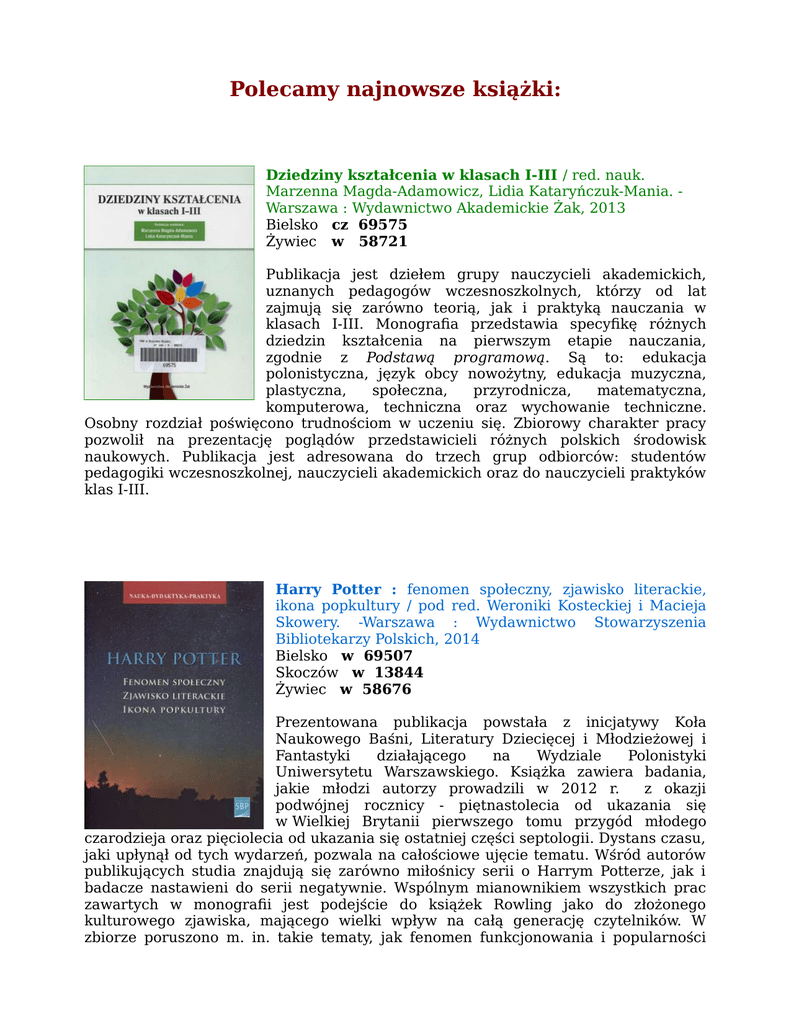 Polecamy najnowsze książki: Dziedziny kształcenia w klasach I-III / red. nauk. Marzenna Magda-Adamowicz, Lidia Kataryńczuk-Mania. Warszawa : Wydawnictwo Akademickie Żak, 2013 Bielsko cz 69575 Żywiec w 58721 Publikacja jest dziełem grupy nauczycieli akademickich, uznanych pedagogów wczesnoszkolnych, którzy od lat zajmują się zarówno teorią, jak i praktyką nauczania w klasach I-III. Monografia przedstawia specyfikę różnych dziedzin kształcenia na pierwszym etapie nauczania, zgodnie z Podstawą programową. Są to: edukacja polonistyczna, język obcy nowożytny, edukacja muzyczna, plastyczna, społeczna, przyrodnicza, matematyczna, komputerowa, techniczna oraz wychowanie techniczne. Osobny rozdział poświęcono trudnościom w uczeniu się. Zbiorowy charakter pracy pozwolił na prezentację poglądów przedstawicieli różnych polskich środowisk naukowych. Publikacja jest adresowana do trzech grup odbiorców: studentów pedagogiki wczesnoszkolnej, nauczycieli akademickich oraz do nauczycieli praktyków klas I-III. Harry Potter : fenomen społeczny, zjawisko literackie, ikona popkultury / pod red. Weroniki Kosteckiej i Macieja Skowery. -Warszawa : Wydawnictwo Stowarzyszenia Bibliotekarzy Polskich, 2014 Bielsko w 69507 Skoczów w 13844 Żywiec w 58676 Prezentowana publikacja powstała z inicjatywy Koła Naukowego Baśni, Literatury Dziecięcej i Młodzieżowej i Fantastyki działającego na Wydziale Polonistyki Uniwersytetu Warszawskiego. Książka zawiera badania, jakie młodzi autorzy prowadzili w 2012 r. z okazji podwójnej rocznicy - piętnastolecia od ukazania się w Wielkiej Brytanii pierwszego tomu przygód młodego czarodzieja oraz pięciolecia od ukazania się ostatniej części septologii. Dystans czasu, jaki upłynął od tych wydarzeń, pozwala na całościowe ujęcie tematu. Wśród autorów publikujących studia znajdują się zarówno miłośnicy serii o Harrym Potterze, jak i badacze nastawieni do serii negatywnie. Wspólnym mianownikiem wszystkich prac zawartych w monografii jest podejście do książek Rowling jako do złożonego kulturowego zjawiska, mającego wielki wpływ na całą generację czytelników. W zbiorze poruszono m. in. takie tematy, jak fenomen funkcjonowania i popularności Harrego Pottera w dyskursie naukowym, wpływ lektury na zachowania i kształtowanie wzorców osobowych u dzieci młodzieży, zjawisko tworzenia portalu internetowego będącego dopełnieniem powieściowej serii. Jak tłumaczyć dzieciom matematykę : poradnik nie tylko dla rodziców / Danuta Zaremba. - Gliwice : Wydawnictwo Helion, 2014 Bielsko w 69510 Żywiec w 58722 Książka Danuta Zaremby jest próbą przedstawienia matematyki w inny, nieszablonowy sposób, do jakiego przywykliśmy w toku własnego nauczania. Zwykle proces nauczania królowej nauk jawi się nam jako zmuszanie uczniów do zapamiętywania sztucznych definicji, twierdzeń, reguł i wzorów, rozwiązywanie trudnych zadań według podanych schematów. Autorka książki przekonuje, że matematykę można dzieciom przybliżyć. Należy tylko nawiązać do własnych doświadczeń dziecka, pozwolić mu posługiwać się potocznym językiem, a przede wszystkim odwoływać się do zdrowego rozsądku. Poradnik przeznaczony jest dla rodziców dzieci, które uczęszczają do szkół podstawowych i gimnazjów. Poleca się go również nauczycielom, którzy szukają nowych inspiracji i nieszablonowych pomysłów na prowadzenie zajęć matematycznych. Nadzieja w życiu ludzi / Małgorzata Kościelska ; [publ. napisana we współaut. Karoliny Głogowskiej et al.]. Warszawa : Difin, 2013 Bielsko cz 69662 Żywiec w 58682 Omawiana książka poświęcona jest roli ludzkiej nadziei w sytuacjach trudnych, zagrażających życiu, zdrowiu, wolności, miłości i innym wartościom. Monografia jest owocem współpracy Małgorzaty Kościelskiej, która jest psychologiem klinicznym i psychoterapeutą, z grupą studentów i doktorantów psychologii. Trzy pierwsze rozdziały mają charakter teoretyczny i przedstawiają psychologiczne pojęcie nadziei, jej osadzenie w strukturze funkcjonowania człowieka i jego relacji ze światem oraz próbę określenia znaczenia nadziei dla zdrowia, rozwoju i aktywności człowieka. Kolejne rozdziały przedstawiają badania o charakterze jakościowym – studia przypadków i historie ludzkie z interpretacją psychologiczną. Koncentrują się one wokół takich tematów, jak rola nadziei w życiu rodziców dzieci chorych, w sieroctwie społecznym, opuszczeniu przez bliską osobę, w chorobie psychicznej, alkoholizmie, uzależnieniu od narkotyków, utracie sprawności, przeniesieniu się do domu opieki społecznej. Wyniki badań jednoznacznie wskazują na ogromne znaczenie nadziei i jej prorozwojową rolę w życiu ludzi. Nowe gry i zabawy pobudzające wszystkie zmysły / Andrea Erkert ; [przekł. Edyta Brudnik]. - Kielce : Wydawnictwo Jedność, cop. 2013. Bielsko w 68860 Książka zawiera propozycje wielu praktycznych gier i zabaw ułatwiających poznawanie świata na pomocą wszystkich zmysłów. Pokazuje, jak można wspierać u dzieci w przedziale wiekowym 3-10 lat rozwój wszystkich narządów zmysłów. Edukacja polisensoryczna przyśpiesza przyswajanie nowej wiedzy oraz zdobywanie i utrwalanie umiejętności. Autorka zaprasza dzieci do ciekawych zabaw, w których mogą wyrażać zdziwienie, do podsłuchiwania odgłosów, wąchania, próbowania różnych smaków, dotykania przedmiotów, poznawania własnego ciała oraz odczuwania. Dla większej przejrzystości zaproponowane zabawy podzielono w książce na rozdziały, z których każdy poświęcony jest konkretnemu zmysłowi: słuchu, wzroku, dotyku, węchu i smaku, percepcji kinestetycznej oraz równowagi. W dobie królowania telewizora i komputera w życiu naszych dzieci propozycje przedstawione w książce ukazują nowe możliwości rozwijania zaniedbywanych dziś sfer percepcji dotykowej i ruchowej, a także zmysłu równowagi oraz spr