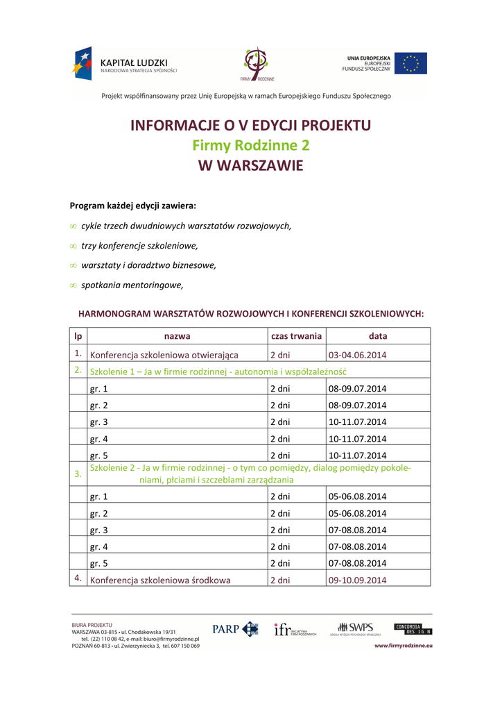 INFORMACJE O V EDYCJI PROJEKTU Firmy Rodzinne 2 W WARSZAWIE Program każdej edycji zawiera: • cykle trzech dwudniowych warsztatów rozwojowych, • trzy konferencje szkoleniowe, • warsztaty i doradztwo biznesowe, • spotkania mentoringowe, HARMONOGRAM WARSZTATÓW ROZWOJOWYCH I KONFERENCJI SZKOLENIOWYCH: lp nazwa czas trwania data 1. Konferencja szkoleniowa otwierająca 2 dni 03-04.06.2014 2. Szkolenie 1 – Ja w firmie rodzinnej - autonomia i współzależność gr. 1 2 dni 08-09.07.2014 gr. 2 2 dni 08-09.07.2014 gr. 3 2 dni 10-11.07.2014 gr. 4 2 dni 10-11.07.2014 gr. 5 2 dni 10-11.07.2014 Szkolenie 2 - Ja w firmie rodzinnej - o tym co pomiędzy, dialog pomiędzy pokole3. niami, płciami i szczeblami zarządzania gr. 1 2 dni 05-06.08.2014 gr. 2 2 dni 05-06.08.2014 gr. 3 2 dni 07-08.08.2014 gr. 4 2 dni 07-08.08.2014 gr. 5 2 dni 07-08.08.2014 2 dni 09-10.09.2014 4. Konferencja szkoleniowa środkowa 5. Szkolenie 3 - Ja w firmie rodzinnej - menedżer jako animator zmiany gr. 1 2 dni 07-08.10.2014 gr. 2 2 dni 07-08.10.2014 gr. 3 2 dni 09-10.10.2014 gr. 4 2 dni 09-10.10.2014 gr. 5 2 dni 09-10.10.2014 2 dni 04-05.11.2014 6. Konferencja szkoleniowa zamykająca WARSZTATY I DORADZTWO BIZNESOWE: Zarówno warsztaty biznesowe jak i doradztwo mają charakter interaktywny - jego uczestnicy mają znaczący wpływ zarówno na treści poruszane podczas spotkań jak i na ich terminy. Zakres tematyczny warsztatów i doradztwa będzie wynikać z potrzeb szkoleniowych jego uczestników. Proponowany przez nas zakres tematyczny: 1. Zintegrowane strategie biznesu i rodziny wg met. FBS (Family @Business Strategy) 2. Definiowanie wartości rodzinnych – warsztat autorski 3. Zarządzanie procesem sukcesji 4. Kreowanie marki rodzinnej opartej na wartościach 5. Kreatywne techniki w biznesie z uwzględnieniem specyfiki firm rodzinnych 6. Wygrywające strategie rynkowe 7. Równowaga życiowa. Radzenie sobie ze stresem. Zarządzanie sobą w czasie. Zarządzanie zadaniami 8. Komunikacja w firmie i rodzinie ; asertywność szefa 9. Rozwiązywanie konfliktów w firmie rodzinnej; negocjacje i mediacje rodzinne. Współpraca i budowanie efektywnych zespołów 10. Zarządzanie innowacją w firmie rodzinnej 11. Efektywne zarządzanie, delegowanie zadań 12. Negocjacje biznesowe. 13. Wprowadzanie zmiany; metody radzenia sobie z oporem, narzędzia aktywowania kreatywności i aktywności w sytuacji zmiany. Zakres tematyczny może się zmienić w zależności od potrzeb uczestników projektu. Budujemy sieć i markę firm rodzinnych w Polsce. Dołącz do nas