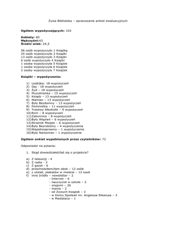 Żywa Biblioteka – opracowanie ankiet ewaluacyjnych Ogółem wypożyczających: 103 Kobiety: 60 Mężczyźni:43 Średni wiek: 24,5 56 osób wypożyczyło 1 Książkę 24 osób wypożyczyło 2 Książki 13 osób wypożyczyło 3 Książki 6 osób wypożyczyło 4 Książki 1 osoba wypożyczyła 5 Książek 1 osoba wypożyczyła 6 Książek 2 osoby wypożyczyły 7 Książek Książki – wypożyczenia: 1) Lesbijka: 18 wypożyczeń 2) Gej - 18 wypożyczeń 3) Żyd – 18 wypożyczeń 4) Muzułmanka – 15 wypożyczeń 5) Ksiądz – 13 wypożyczeń 6) Niemiec – 13 wypożyczeń 7) Były Bezdomny – 13 wypożyczeń 8) Feministka – 11 wypożyczeń 9) Trzeźwy Alkoholik – 9 wypożyczeń 10) Rom – 8 wypożyczeń 11) Zakonnica – 8 wypożyczeń 12) Były Więzień – 6 wypożyczeń 13) Strażnik Miejski – 6 wypożyczeń 14) Były Bezrobotny – 4 wypożyczenia 15) Niepełnosprawny – 1 wypożyczenie 16) Były Narkoman – 1 wypożyczenie Ogółem ankiet wypełnionych przez czytelników: 72 Odpowiedzi na pytania: 1. Skąd dowiedziałeś/łaś się o projekcie? a) b) c) d) e) f) Z telewizji - 4 Z radia - 3 Z gazet - 6 przechodziłem/łam obok – 12 osób z ulotek, plakatów w mieście – 12 osob inne źródło – newsletter – 2 - Internet – 6 - nauczyciel w szkole – 2 - znajomi – 26 - mama – 2 - od Żywych Książek – 2 - w Domu Spotkań im. Angelusa Silesiusa – 3 - w Mediatece – 1 2. Czy podoba Ci się pomysł naszego projektu? (1 – w ogóle mi się nie podoba, 5 – jestem pod wrażeniem) Ogółem 72 ankiety: 1) 2) 3) 4) 5) 1 2 3 4 5 – – – – – 0 0 0 7 65 3. Co myślisz o doborze Książek i katalogu stereotypów, który zaproponowaliśmy? (1- w ogóle mi się nie podoba, 5 – jestem pod wrażeniem) Ogółem 69 ankiet: 1) 2) 3) 4) 5) 1 2 3 4 5 –0 –0 –0 - 31 – 38 4. Jaka Książka, Twoim zdaniem, powinna znaleźć się jeszcze w naszej Żywej Bibliotece? Sportowiec, Znana Osobistość, Były Morderca, Polityk, Lekarz, który dokonuje aborcji, Podróżnik, Ateista, Filozof, Sędzia, Detektyw, Pielęgniarka, Były Terrorysta, Chińczyk, Hindus, Organizator Żywej Biblioteki, Przeciętny Polak/Polka, Świadek Jehowy, Kobieta po aborcji, Pracoholik, Policjant, Nauczyciel, Była Prostytutka, Czech, Wieczny Student, Anorektyczka, Rasista, Rolnik, Blondynka, Metal, Dorosłe Dziecko Alkoholika, Poeta, Malarz, Psycholog, Lekarz – onkolog, Żołnierz z Iraku, Transwestyta, Samotna matka z dzieckiem, Wszechpolak, Chuligan, Rosjanin, Osoba Bezpłodna, Singiel, Indianin, Dziecko z Domu Dziecka, „Babcia klozetowa”, Student Prawa, Amerykanin, Rastaman, Kominiarz, Anglik, Aktor, Psycholog, Milioner, Niewidomy, Francuz, Skinhead, Sprzątaczka, Katolik 5. Czego nowego nauczyłeś/łaś się podczas czytania Książki: 1) przełamywania lodów w rozmowie z obcymi osobami 2) nie patrzenia na stereotypy 3) przyglądania się z innej perspektywy 4) dowiedziałem się faktów dotyczących islamu 5) dowiedziałem się o życiu 6) przełamywanie mitów, nowe spojrzenie na wiele spraw 7) nauczyłem się słuchać 8) nauczyłam się, że warto rozmawiać o rzeczach, których dotąd nie znałam 9) poznałam inny punkt widzenia 10) doceniania własnego życia 11) Zweryfikowałam niektóre opinie i poglądy 12) Poznałem argumenty drugiej strony 13) dowiedziałam się czym naprawdę jest feminizm 14) Dowiedziałem się sporo o islamie 15) Rozwinięcie świadomości innej kultury, tolerancji i otwartości 16) Wiele dowiedziałam się o Romach 17) Dowiedziałem się o ludzkich problemach 18) Potwierdziłem swoją wiedzę na temat bezzasadności stereotypów 19) Inność jest ciekawa i niezwykła, z drugiej strony to ja mogę być „inna” dla tych osób 20) Dużo informacji 21) Nauczyłem się swobodnej osoby z ludźmi w jakiś sposób ode mnie innymi 22) Otwartości 23) Potrzebuję co najmniej 3 stron A4, aby odpowiedzieć na to pytanie. 24) o Romach 25) Poznałam nową kulturę 26) Przestałam wierzyć w popularne stereotypy 27) Odbyłam ciekawą rozmowę, co dziś jest rzadko praktykowane – zwykłe spotkania dla inteligentnej rozmowy 28) Nowe spojrzenie na stare sprawy 29) Przełamanie stereotypów 30) Dowiedziałam się dlaczego Niemcy mówią wiele rzeczy wprost 31) Dowiedziałem się, że życie nie oszczędza nikogo 32) Nauczyłam się innego postrzegania ludzi, wartości 33) Cennej wiedzy, której nie ma w książkach 34) Poszerzyłem wiedzę na temat Książki, którą wypożyczyłem 35) Prowadzenia rozmowy z drugą osobą 36) Potwierdzili mój pogląd, że Niemcy nie spotykają się z nietolerancją 37) Dowiedziałam się sporo rzeczy na temat Niemiec 38) Przekonałem się, że trzeba inaczej i ze wszystkich stron patrzeć na świat 39) Dostałam parę ważnych odpowiedzi na nurtujące mnie od pewnego czasu pytania 40) Otwarcie na nowe perspektywy 41) Dostałem dobre wskazówki jak być trzeźwym człowiekiem 42) Poznałem stanowisko i poglądy młodej osoby pochodzenia żydowskiego 43) Całkowicie zmieniłam poglądy na temat gejów (na pozytywne) 44) Nauczyłem się, że Ziemia jest tak duża, ze wystarczy miejsca dla wszystkich 45) Poszerzenie wiedzy o bezdomności. 46) Pomoc w decyzji związanej z własnym życiem 47) Byłam otwarta od początku 48) Rozmawiałam dość długo, w związku z czym musze to wszystko przemyśleć, bo nasunęło mi się wiele refleksji 49) Teraz wiem, że stereotypy opierają się na niewiedzy, ludzie budują sobie obraz nie znając kogoś. Ale w rzeczywistości trzeba poznać drugiego człowieka, aby wyrobić sobie o nim jakieś zdanie 50) Obaliłam stereotypy 51) Nauczyłam się „nie oceniać książki po okładce” 52) Nauczyłam się bardzo dużo – i wymiernych i niewymiernych informacji z kontaktu z autentycznym człowiekiem 53) Zauważyłem totalnie inne rzeczy, takie na które nie zwracałam uwagi 54) Dowiedziałam się wielu rzeczy i rzeczywiście niektórzy obalili moje stereotypy 6. Czy, Twoim dlaczego? 1) 2) 3