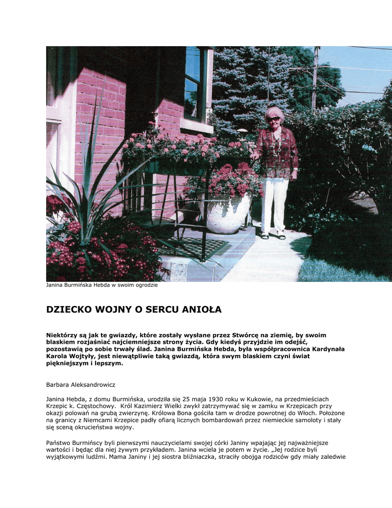 Janina Burmińska Hebda w swoim ogrodzie DZIECKO WOJNY O SERCU ANIOŁA Niektórzy są jak te gwiazdy, które zostały wysłane przez Stwórcę na ziemię, by swoim blaskiem rozjaśniać najciemniejsze strony życia. Gdy kiedyś przyjdzie im odejść, pozostawią po sobie trwały ślad. Janina Burmińska Hebda, była współpracownica Kardynała Karola Wojtyły, jest niewątpliwie taką gwiazdą, która swym blaskiem czyni świat piękniejszym i lepszym. Barbara Aleksandrowicz Janina Hebda, z domu Burmińska, urodziła się 25 maja 1930 roku w Kukowie, na przedmieściach Krzepic k. Częstochowy. Król Kazimierz Wielki zwykł zatrzymywać się w zamku w Krzepicach przy okazji polowań na grubą zwierzynę. Królowa Bona gościła tam w drodze powrotnej do Włoch. Położone na granicy z Niemcami Krzepice padły ofiarą licznych bombardowań przez niemieckie samoloty i stały się sceną okrucieństwa wojny. Państwo Burmińscy byli pierwszymi nauczycielami swojej córki Janiny wpajając jej najważniejsze wartości i będąc dla niej żywym przykładem. Janina wciela je potem w życie. „Jej rodzice byli wyjątkowymi ludźmi. Mama Janiny i jej siostra bliźniaczka, straciły obojga rodziców gdy miały zaledwie kilka lat. Ich niewiele starsza siostra przejęła obowiązki rodziców i wychowała je. W tamtych czasach nie było sierocińców ani też żadnych ośrodków pomocy dla sierot. Dzieci, które straciły rodziców były pozostawione na pastwę losu. Silniejsze przetrwały, te słabsze straciły życie. Polska była wówczas pod okupacją i szcześliwcem był ten kto przeżył kolejny dzień” – mówi mąż Janiny od 37 lat, Stanley Hebda. Wychowane przez starszą siostrę bliżniaczki wyrosły na wspaniałe kobiety i założyły rodziny. Dawny zamek w Krzepicach k. Częstochowy Rodzice Janiny Jak wspomina Janina, zanim wyszła za mąż, jej mama Anna udzieliła jej wiele cennych rad w sferze życia małżeńskiego, rodzinnego i w społeczeństwie. Wszystkie te rady Janina wzięła sobie głęboko do serca, okazały się one niebywale przydatne w późniejszym jej życiu. Ojciec Janiny był człowiekiem światowym, pozdróżował wiele po Europie Zachodniej w poszukiwaniu lepszej pracy. Podczas swoich podróży zgłębiał wiedzę w szkołach i uczył się obcych języków. Kiedy już zarobił pokaźną sumę pieniędzy, wrócił do swojej rodzinnej wioski, zakupił gospodarstwo, wybudował dom i ożenił się z ubogą sierotą, Janiny mamą. „Wielu nie mogło wtedy zrozumieć dlaczego zamożny i przystojny młodzieniec wybrał sobie na żonę sierotę skoro mógł się ożenić z jakąś bogatą panną. To świadczy o tym jakim był człowiekiem” – twierdzi Hebda. Zamek w Krzepicach dziś Ojciec Janiny, choćby był najbardziej zapracowany czy to we własnym gospodarstwie czy w biznesie, który prowadził, zawsze znalazł czas dla swoich dzieci - czterech synów i czterech córek. W każdą niedzielę cała rodzina zbierała się w izbie i przy jego akompaniamencie na skrzypcach, śpiewała patriotyczne pieśni. Bywało, że cała wieś schodziła się do nich, by wspólnie spędzić czas przy muzyce i skromnym, ale z serca ofiarowanym posiłku. Jakże pięknie te radosne niedziele wspomina w swoim wierszu „Tata”, który w Wielkim Konkursie Poezji zorganizowanym przez JPII Polish American Poets Academy otrzymał wyróżnienie, Janina Burmińska Hebda. Pamiętam te dni kiedy byłam mała i jak do ciebie z wyciągniętymi rękami leciałam, byś mnie objął. Nie było we mnie lęku, nie było obawy, że coś mi się stanie, bo ty mnie kryłeś w swoich ramionach. Dni płynęły beztrosko, wolno i wesoło. Tyle było śmiechu, radości i szczęścia, gdy na skrzypkach grywałeś swym dzieciom do tańca. Cała wieś się schodziła dzielić z nami szczęście. Młodzież w tany się puszcza, matki pięką placki. Ty wygrywasz na skrzypcach walce i oberki. A gdy księżyc wychylił swoją twarz srebrzystą i dzwon na Anioł Pański odezwał się z wieży, tyś zdjął czapkę – w modlitwie przewodzisz młodzieży. Potem sadzasz każdego za stołem, czym chata bogata, tym rada – dla wszystkich wystarczy, w tym domu pożywi się każdy – nawet pies kulawy. Gość w dom, Bóg w dom – często nam mówiłeś, więc przed nikim nigdy jedzenia nie kryłe. Nawet wtedy, gdy wróg nam wszystkim pozabierał. Jestem ci, Tato, wdzięczna za życia naukę, za wiarę, dobry przykład i za szczodrą rękę, którą każdego darzyłeś. Jak w życiu, tak w śmierci być przy mnie pragnąłeś. Tuliłam się w twoich ramionach, gdy mnie opuszczałeś, aż z żalu zasnęłam. Podobno sen jest bratem śmierci, śmierć jest matką życia, z niej wyrasta lilia co wszystkich zachwyca. Na jej śnieżnych płatkach odszedłeś w zaświaty. Dziś żyjesz w moim sercu, z nieba na mnie patrzysz. Cieszysz się moim szczęściem, a czasem zapłaczesz. Dziękuję ci, Tato. Czasy wojny i okupacji Dzień1 września 1939 r. zmienił wszystko. Gospodarstwo Burmińskich znajdujące się na granicy z Niemcami, stało się celem ataku wroga. 9-letnia Janina jest naocznym świadkiem straszliwej krzywdy wyrządzanej przez najeźdźców polskim dzieciom i ich rodzicom. Dała temu wyraz w wierszu „Matka zagłodzonych”, opowiadającym wstrząsającą, prawdziwą historię Marii Dary, kresowej matki. Jej mąż ułan, uczestnik Cudu nad Wisłą, został zamordowany przez bolszewików w swoim majątku k. Stanisławowa, który otrzymał za swoje zasługi dla Polski. Trzy ich córeczki zmarły z głodu w drodze na Sybir, dwaj synowie bliźniacy zdołali uciec. Zapisali się do Armii Andersa i obaj zginęli pod Monte Cassino. Ich matka, która w czasach dzieciństwa mieszkała po sąsiedzku z Janiną, przeżyła Sybir i osobiście opowiedziała Janinie swoją tragiczną historię. Oto wiersz autorstwa Janiny Burmińskiej Hebdy pt. „Matka zagłodzonych” O wpół do czwartej nad ranem Gdy księżyc już pr