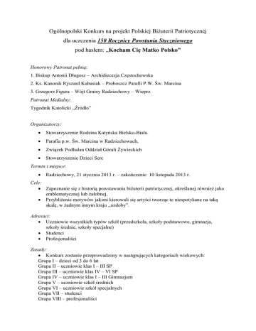 Ogólnopolski Konkurs na projekt Polskiej Biżuterii Patriotycznej dla uczczenia 150 Rocznicy Powstania Styczniowego pod hasłem: ,,Kocham Cię Matko Polsko” Honorowy Patronat pełnią: 1. Biskup Antonii Długosz – Archidiecezja Częstochowska 2. Ks. Kanonik Ryszard Kubasiak – Proboszcz Parafii P.W. Św. Marcina 3. Grzegorz Figura – Wójt Gminy Radziechowy – Wieprz Patronat Medialny; Tygodnik Katolicki ,,Źródło” Organizatorzy: Stowarzyszenie Rodzina Katyńska Bielsko-Biała. Parafia p.w. Św. Marcina w Radziechowach, Związek Podhalan Oddział Górali Żywieckich Stowarzyszenie Dzieci Serc Termin i miejsce: Radziechowy, 21 stycznia 2013 r. – zakończenie 10 listopada 2013 r. Cele: Zapoznanie się z historią powstawania biżuterii patriotycznej, określanej również jako emblematycznej lub żałobnej, Przybliżenie motywów jakimi kierowali się artyści tworząc te niespotykane na taką skalę, w żadnym innym kraju ,,ozdoby”. Adresaci: Uczniowie wszystkich typów szkół (przedszkola, szkoły podstawowe, gimnazja, szkoły średnie, szkoły specjalne) Studenci Profesjonaliści Zasady: Konkurs zostanie przeprowadzony w następujących kategoriach wiekowych: Grupa I – dzieci od 3 do 6 lat Grupa II – uczniowie klas I – III SP Grupa III – uczniowie klas IV – VI SP Grupa IV – uczniowie klas I – III Gimnazjum Grupa V – uczniowie szkół średnich Grupa VI – uczniowie szkół specjalnych Grupa VII – studenci Grupa VIII – profesjonaliści Organizatorzy zastrzegają sobie prawo do tworzenia dodatkowych kategorii w trakcie trwania konkursu. Prace nadsyłane na konkurs powinny być wykonane samodzielnie, z materiałów pospolitych, tanich i dostępnych tak, by całość przedmiotu cechowała prostota, ozdobę zaś stanowiły niemal wyłącznie patriotyczne symbole i napisy. Dzięki takiemu wykonaniu biżuteria pełniła rolę propagatora idei niepodległościowych, będąc jednocześnie ozdobą. Wyniki poznamy oglądając najlepsze prace zgłoszone na konkurs. Zwycięskie i wyróżnione projekty trafią na wystawę, na której zaprezentowana zostanie zarówno historyczna biżuteria patriotyczna oraz inspirowane nią współczesne propozycje. Konkurs potrwa do 29 września 2013 r. Wernisaż wystawy będzie miał miejsce 10 listopada 2013 r. w Świetlicy w Radziechowach. Autorzy wyróżnionych prac otrzymają nagrody. Już dzisiaj zapraszamy na tę uroczystość – obowiązujący ubiór to ,,żałobny strój” Prace konkursowe wraz z wypełnionym formularzem zgłoszeniowym (zał. 1) należy złożyć w siedzibie Stowarzyszenia Dzieci Serc na ul. Abramskiej 2 w Radziechowach lub przesłać pocztą na adres: Stowarzyszenie Dzieci Serc ul. Abramskiej 2, 34 – 381 Radziechowy Biżuteria patriotyczna pojawiła się u schyłku XVIII w. i trwała z przerwami, i w różnych formach do czasów współczesnych – znany nam ,,opornik’ Kiedyś wyrażała opór wobec zaborców i nie chcianych władz, noszenie miało podkreślać i manifestować uczucia patriotyczne. Również i ,,czarna sukienka” miała swój wydźwięk patriotyczny, co znalazło odzwierciedlenie w pieśniach, któż z nas wie że za noszenie tej sukni groziła kara chłosty? Czy dzisiaj biżuteria patriotyczna ma szansę zaistnienia we współczesnych kanonach mody? Czy dzieci i młodzież chętnie podejmą się wykonania takiej pracy? Czy nauczyciele, wychowawcy, lub rodzice zachęcą młode pokolenie do poznania tej przemilczanej, zapomnianej, a jakże wyjątkowej historii naszej ojczyzny? PW, Znak Polski Walczącej wyłoniony w konkursie na znak dla Organizacji Małego Sabotażu „Wawer” w 1942 jego autorką była Anna Smoleńska Znak kotwicy SW, jako symbol oporu „Solidarności Walczącej” symbol nadziei i wierności tradycji Polski Walczącej Każdy, kto weźmie udział w tym konkursie, bez względu na jego wynik, już będzie ZWYCIĘZCĄ – wiadomo bowiem, że jeśli kogoś kochamy, to chcemy o nim wiedzieć jak najwięcej, a jeśli kocham Polskę, swoją Ojczyznę to chętnie poznamy tę część Jej historii. Powodzenia Czekamy również na Wasze zgłoszenia do pomocy przy realizacji tego konkursu – to tak jakbyśmy odrabiali zaległą lekcję historii. Koniecznie dołącz do nas. Opowiedz nam, moja Ojczyzno jak matka dzieciom ciekawym, o latach znaczonych blizną na wiekach chwały i sławy…. Biel śniegu i żar czerwieni i orły dumne piastowskie, to wieczne symbole tej ziemi najbliższe sercu, bo polskiej. Wytłumacz nam, tak jak umiesz, skąd czerwień i biel sztandarów. Niech ludzie żyją tu w dumie, że taki wydał ich naród. Janusz Szczepkowski „Opowiedz nam Ojczyzno” Literatura W. Bigoszewska: Polski pierścień patriotyczny w historii. "Kurier Polski" (w:) dodatek "Kolekcjoner Polski", maj - grudzień 1973 F. Jaworski: Pierścienie historyczne polskie. Lwów; 1912 G. Kieniewiczowa: Pamiątki powstań narodowych. Warszawa; 1988 [email protected] Zał. 1 formularz zgłoszeniowy: Imię i nazwisko autora Adres zamieszkania Nazwa i adres szkoły/firmy Telefon kontaktowy Wiek Klasa – wypełniają uczniowie Rodzaj i nr dokumentu potwierdzającego kwalifikacje zawodowe, przez kogo wydany/ profesjonaliści Kilka zdań o sobie Nazwa pracy konkursowej Opis pracy konkursowej Dla ,,P” przekaz dziecka spisany przez opiekuna pracy w przypadku zestawu lub kompletach podać liczbę przedmiotów. Użyte w pracy materiały (próba). masa Dodatkowe informacje/ opiekun pracy Regulamin Konkursu &1 Nagrody I. Jury przyzna nagrody i wyróżnienia (rzeczowe lub książkowe) a nauczycielom, lub opiekunom prac, honorowe – dyplomy. II. Laureaci konkursu, w tym uczniowie wraz z opiekunami zostaną zaproszeni na wernisaż wystawy, który będzie miał miejsce 10 listopada 2013 r. w Świetlicy w Radziechowach III. Decyzja Jury, co do podziału i formy nagród będzie nieodwołalna (nie podlega weryfikacji lub zaskarżeniu) i zostanie przedstawiona w formie publicznie ogłoszonego komu
