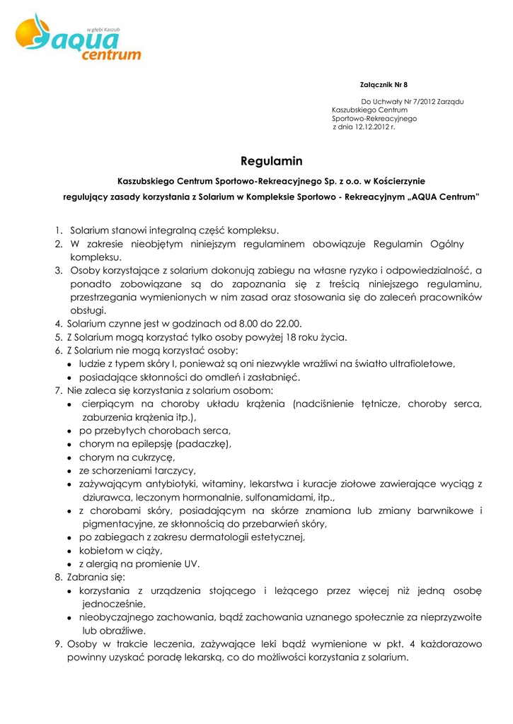 Regulamin korzystania z Solarium AQUA Centrum w Kościerzynie
