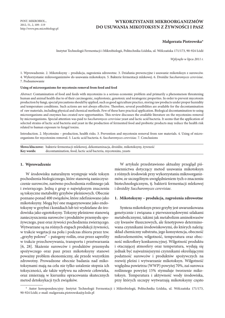 POST. MIKROBIOL., 2012, 51, 2, 109–119 http://www.pm.microbiology.pl WYKORZYSTANIE MIKROORGANIZMÓW DO USUWANIA MIKOTOKSYN Z ŻYWNOŚCI I PASZ Małgorzata Piotrowska* Instytut Technologii Fermentacji i Mikrobiologii, Politechnika Łódzka, ul. Wólczańska 171/173, 90-924 Łódź Wpłynęło w lipcu 2011 r. 1. Wprowadzenie. 2. Mikotoksyny – produkcja, zagrożenia zdrowotne. 3. Działania prewencyjne i usuwanie mikotoksyn z surowców. 4. Wykorzystanie mikroorganizmów do usuwania mikotoksyn. 5. Bakterie fermentacji mlekowej. 6. Drożdże Saccharomyces cerevisiae. 7. Podsumowanie Using of microorganisms for mycotoxin removal from food and feed Abstract: Contamination of food and feeds with mycotoxins is a serious economic problem and primarily a phenomenon threatening human and animal health due to of their carcinogenic, nephrotoxic, genotoxic and teratogenic properties. In order to prevent mycotoxin production by fungi, special precautions should by applied, such as good agriculture practice, storing raw products under proper humidity and temperature conditions. Such actions are not always effective. Therefore, several possibilities are available for the decontamination of raw materials, including physical and chemical methods. Few of these have practical application. Biological decontamination to using microorganisms and enzymes has created new opportunities. This review discusses the available literature on the mycotoxins removal by microorganisms. Special attention was paid to Saccharomyces cerevisiae yeast and lactic acid bacteria. It seems that the application of selected strains of lactic acid bacteria and yeast in the production of fermented food and probiotic products may reduce the health risk related to human exposure to fungal toxins. Introduction. 2. Mycotoxins – production, health risks. 3. Prevention and mycotoxin removal from raw materials. 4. Using of microorganisms for mycotoxins removal. 5. Lactic acid bacteria. 6. Saccharomyces cerevisiae. 7. Conclusions Słowa kluczowe: bakterie fermentacji mlekowej, dekontaminacja, drożdże, mikotoksyny, żywność Key words: decontamination, food, lactic acid bacteria, mycotoxins, yeasts 1. Wprowadzenie W środowisku naturalnym występuje wiele toksyn pochodzenia biologicznego, które stanowią zanieczyszczenie surowców, zarówno pochodzenia roślinnego jak i zwierzęcego. Jedną z grup o największym znaczeniu są toksyczne metabolity grzybów pleśniowych. Obecnie poznano ponad 400 związków, które zdefiniowano jako mikotoksyny. Mogą być one magazynowane jako endotoksyny w grzybni i konidiach lub też wydzielane do środowiska jako egzotoksyny. Toksyny pleśniowe stanowią zanieczyszczenia surowców i produktów przemysłu spożywczego, pasz oraz żywości pochodzenia zwierzęcego. Wytwarzane są na różnych etapach produkcji żywności, w trakcie wegetacji na polu i podczas zbioru przez tzw. „grzyby polowe” – patogeny roślin, oraz przez saprofity w trakcie przechowywania, transportu i przetwarzania [6, 28]. Skażenie surowców i produktów przemysłu spożywczego oraz pasz przez mikotoksyny stanowi poważny problem ekonomiczny, ale przede wszystkim zdrowotny. Prowadzone obecnie badania nad mikotoksynami mają na celu nie tylko ustalenie stopnia ich toksyczności, ale także wpływu na zdrowie człowieka, oraz zmierzają w kierunku opracowania skutecznych metod detoksykacji tych związków. W artykule przedstawiono aktualny przegląd piśmiennictwa dotyczący metod usuwania mikotoksyn z różnych środowisk przy wykorzystaniu mikroorganizmów, ze szczególnym uwzględnieniem tych o znaczeniu biotechnologicznym, tj. bakterii fermentacji mlekowej i drożdży Saccharomyces cerevisiae. 1. Mikotoksyny – produkcja, zagrożenia zdrowotne Synteza mikotoksyn przez grzyby jest uwarunkowana genetycznie i związana z pierwszorzędowymi szlakami metabolicznymi, takimi jak metabolizm aminokwasów czy kwasów tłuszczowych, ale fenotypowo determinowana czynnikami środowiskowymi, do których należą: skład chemiczny substratu, jego konsystencja, obecność mikroelementów, wilgotność, temperatura oraz obecność mikroflory konkurencyjnej. Wilgotność produktu i otaczającej atmosfery oraz temperatura, wydają się jednak być najważniejszymi czynnikami określającymi podatność surowców i produktów spożywczych na rozwój pleśni i wytwarzanie mikotoksyn. Wilgotność względna powietrza (WWP) powyżej 70%, zaś surowca roślinnego powyżej 15% stymuluje tworzenie mikotoksyn. Temperatura i aktywność wody środowiska, przy których szczepy wytwarzają mikotoksyny często * Autor korespondencyjny: Instytut Technologii Fermentacji i Mikrobiologii, Politechnika Łódzka, ul. Wólczańska 171/173, 90-924 Łódź; e-mail: [email protected] 110 MAŁGORZATA PIOTROWSKA Tabela I Mikotoksyny i grzyby toksynotwórcze Mikotoksyna Surowiec Gatunek Aflatoksyny Zboża, orzechy, przyprawy, suszone owoce Aspergillus flavus, A. parasiticus, A. nomius Ochratoksyna A Zboża, suszone owoce, wino, kawa, przy- Aspergillus alutaceus, A. melleus, A. ochraceus, A. carbonarius, A.niger, prawy, żywność pochodzenia zwierzęcego A. ostianus, Penicillium verrucosum var. cyclopium, P. verrucosum var. verrucosum, P. commune, P. nordicum, P. purpurescens, P. variabile Fumonizyny Zboża i produkty zbożowe Fusarium verticillioides, F. proliferatum, F. subglutinans Trichoteceny Zboża i produkty zbożowe Fusarium sporotrichioides, F. poae, F. equiseti, F. culmorum, F. graminearum Patulina Owoce i przetwory owocowe Aspergillus chevalieri, A. clavatus, A. terreus, Penicillium cyclopium, P. expansum, P. patulum, Byssochlamys fulva, B. nivea Zearalenon Zboża i przetwory zbożowe Fusarium cerealis, F. culmorum, F. equiseti, F. graminearum Alternariol Owoce, warzywa, zboża Alternaria alternata, A. brassicae, A. tenuissima, A. tomato są inne niż wartości tych parametrów optymalne dla wzrostu grzybni [67]. Uprawiane w Polsce rośliny są w większo