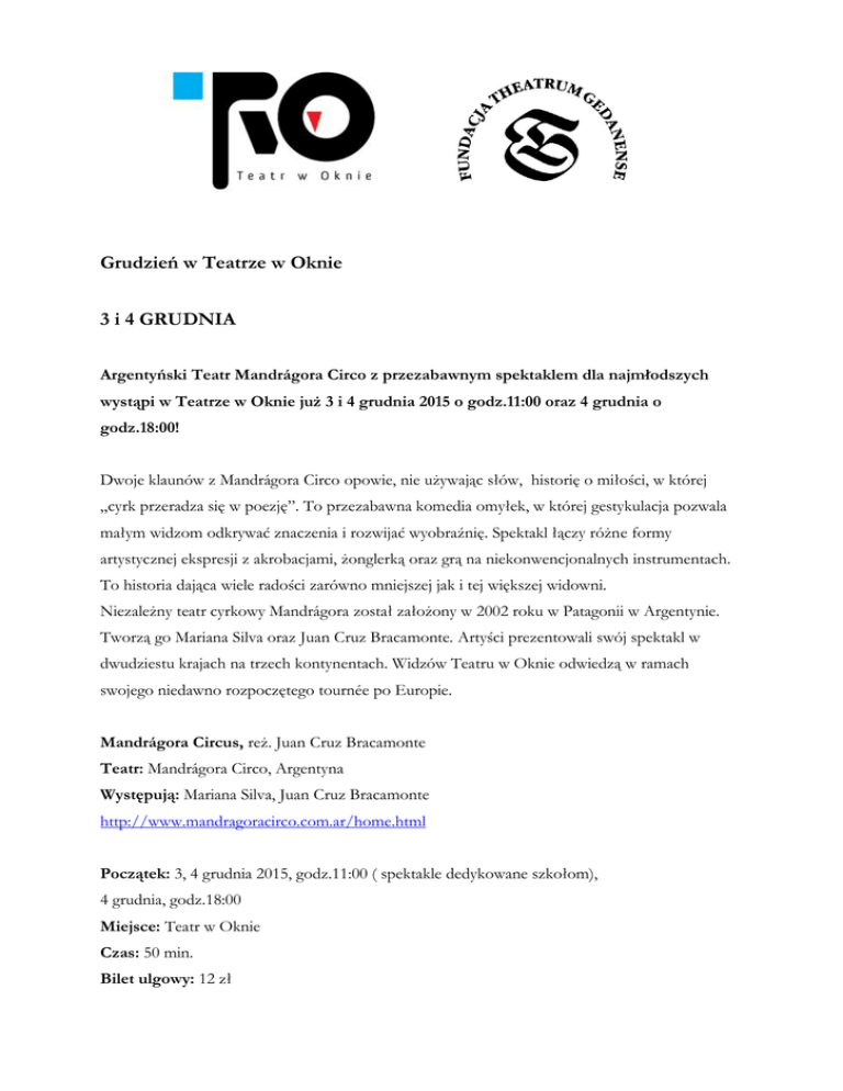 Grudzień w Teatrze w Oknie 3 i 4 GRUDNIA Argentyński Teatr Mandrágora Circo z przezabawnym spektaklem dla najmłodszych wystąpi w Teatrze w Oknie już 3 i 4 grudnia 2015 o godz.11:00 oraz 4 grudnia o godz.18:00! Dwoje klaunów z Mandrágora Circo opowie, nie używając słów, historię o miłości, w której „cyrk przeradza się w poezję”. To przezabawna komedia omyłek, w której gestykulacja pozwala małym widzom odkrywać znaczenia i rozwijać wyobraźnię. Spektakl łączy różne formy artystycznej ekspresji z akrobacjami, żonglerką oraz grą na niekonwencjonalnych instrumentach. To historia dająca wiele radości zarówno mniejszej jak i tej większej widowni. Niezależny teatr cyrkowy Mandrágora został założony w 2002 roku w Patagonii w Argentynie. Tworzą go Mariana Silva oraz Juan Cruz Bracamonte. Artyści prezentowali swój spektakl w dwudziestu krajach na trzech kontynentach. Widzów Teatru w Oknie odwiedzą w ramach swojego niedawno rozpoczętego tournée po Europie. Mandrágora Circus, reż. Juan Cruz Bracamonte Teatr: Mandrágora Circo, Argentyna Występują: Mariana Silva, Juan Cruz Bracamonte http://www.mandragoracirco.com.ar/home.html Początek: 3, 4 grudnia 2015, godz.11:00 ( spektakle dedykowane szkołom), 4 grudnia, godz.18:00 Miejsce: Teatr w Oknie Czas: 50 min. Bilet ulgowy: 12 zł Bilet dla rodzica z dzieckiem: 18 zł Bilet normalny: 18zł Bilet grupowy: 10 zł (grupa od 15 osób) Opiekun grupy: wstęp bezpłatny 5 GRUDNIA Monodram "POTOK" w Teatrze w Oknie już 5 grudnia o godz.19:00 ! Chciałbym Was serdecznie zaprosić na spotkanie pożegnalne z powodu mojego przejścia do „Kraju”. ON Jakaś krawędź. Stojący na niej On wychyla się do przodu. Właśnie podjął bardzo ważną decyzję w swoim życiu. Chce przedostać się do „Kraju”. Jednak z jakiegoś powodu On ma coraz większy problem z tym, by zrobić ten ostateczny krok. Moment przełomu staje się przykrym rytuałem niemożności. Czy to jest w ogóle możliwe? Czym jest upragniony „Kraj”? Czy istnieje naprawdę? * Spektakl dla widzów pełnoletnich Reżyseria: Wojciech Jaworski, Mariusz Babicki Tekst: Mariusz Babicki Realizacja dźwięku: Tomasz Kaczorowski On: Wojciech Jaworski Początek: 5 grudnia 2015, godz. 19:00 Miejsce: Teatr w Oknie Cena biletów: 18 zł normalny, 14 zł ulgowy 12 GRUDNIA Już 12 grudnia o godz.18:00 TwO zaprasza na „Kąpiel w dźwiękach gongów i mis”. Będzie to niezwykła podróż do wnętrza siebie, a to wszystko dzięki mistycznym dźwiękom gongów, mis, dzwonków i ocean drum. Taka kąpiel w dźwiękach umożliwi osiągnięcie stanu wyciszenia i głębokiego relaksu, usunięcie bloków energetycznych, pozbycie się napięć mięśniowych, likwidację negatywnych wzorców oraz lepsze odczuwanie własnego ciała. Polecamy zabrać ze sobą koc oraz matę. Początek: 12 grudnia 2015, godz. 18:00 Miejsce: Teatr w Oknie Prowadzenie: Joanna Materek Czas: 1h 30 min Bilety: 25 zł Ze względu na ograniczoną ilość miejsc, konieczna jest wcześniejsza rezerwacja na e-mail: [email protected] lub tel. 58 322 04 14. Płatności można dokonać wyłącznie gotówką w Teatrze w Oknie, przed seansem. Prosimy o punktualne przybycie. 13 GRUDNIA Już 13 grudnia o godz. 13:00 w Teatrze w Oknie zagości „Pchła Szachrajka” w reż. Adama Dzieciniaka z Teatru Czwarte Miasto! Zapraszamy na bajkę o zawadiackich przygodach psotnej Pchły, które bawią dzieci od blisko 70 lat. Spektakl jest wspaniałą propozycją dla najmłodszych, młodych a także dorosłych widzów na przeżycie niepowtarzalnej przygody teatralnej, utrzymanej w komediowo-kabaretowej atmosferze, przepełnionej słownym i sytuacyjnym humorem. Młodzi oraz dorośli widzowie, biorąc czynny udział w przedstawieniu i mając bezpośredni wpływ na rozwój wydarzeń scenicznych, z pewnością będą się świetnie bawić. Tekst: Jan Brzechwa Scenariusz i reżyseria : Adam Dzieciniak Obsada: Jeremiasz Gzyl, Mateusz Deskiewicz / Dariusz Majchrzak Scenografia i kostiumy : Magdalena Kurek Oprawa muzyczna : Sebastian Ślusarczyk Opieka artystyczna : Dariusz Majchrzak Spektakl przeznaczony jest dla dzieci od 4 lat do 100 lat. Początek: 13 grudnia 2015, godz. 13:00 Miejsce: Teatr w Oknie Cena biletów: 30 zł normalny, 20 zł ulgowy SPRZEDAŻ I REZERWACJA BILETÓW: Teatr w Oknie, Ul. Długa 50/51 Gdańsk Sprzedaż biletów na 20 minut przed wydarzeniami, płatność gotówką. Rezerwacje pod numerem: 58 322 04 14 oraz e-mailem: [email protected] Kontakt: Dorota Sentkowska - Koordynator Teatru w Oknie [email protected] tel.: + 48 58 322 04 14 |+ 48 533 333 855