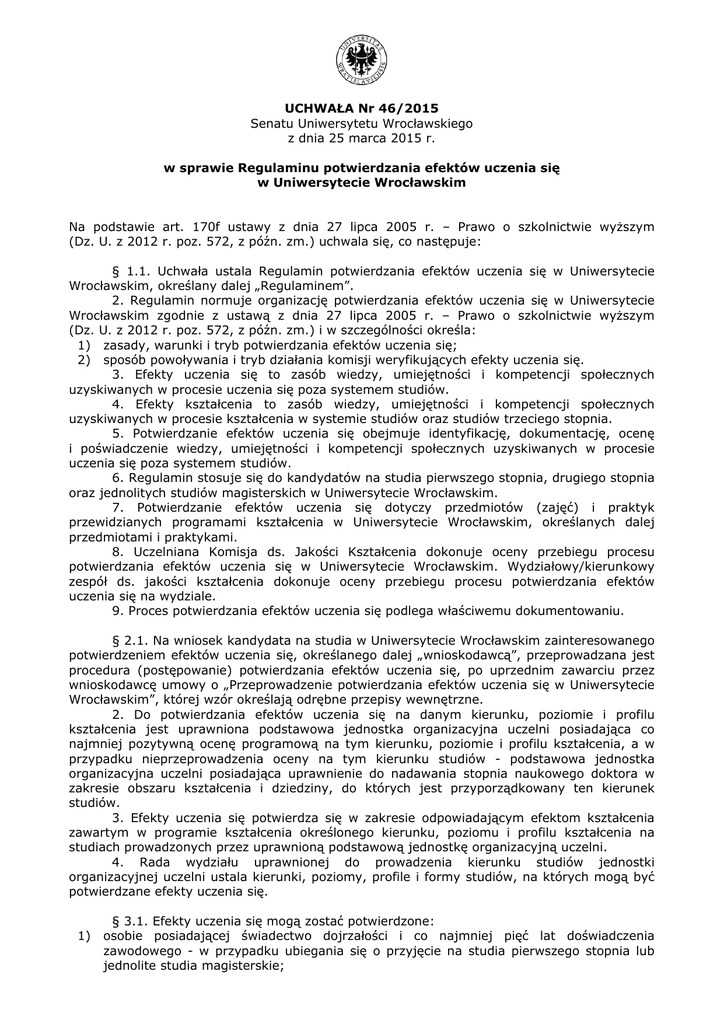 UCHWAŁA Nr 46/2015 Senatu Uniwersytetu Wrocławskiego z dnia 25 marca 2015 r. w sprawie Regulaminu potwierdzania efektów uczenia się w Uniwersytecie Wrocławskim Na podstawie art. 170f ustawy z dnia 27 lipca 2005 r. – Prawo o szkolnictwie wyższym (Dz. U. z 2012 r. poz. 572, z późn. zm.) uchwala się, co następuje: § 1.1. Uchwała ustala Regulamin potwierdzania efektów uczenia się w Uniwersytecie Wrocławskim, określany dalej „Regulaminem”. 2. Regulamin normuje organizację potwierdzania efektów uczenia się w Uniwersytecie Wrocławskim zgodnie z ustawą z dnia 27 lipca 2005 r. – Prawo o szkolnictwie wyższym (Dz. U. z 2012 r. poz. 572, z późn. zm.) i w szczególności określa: 1) zasady, warunki i tryb potwierdzania efektów uczenia się; 2) sposób powoływania i tryb działania komisji weryfikujących efekty uczenia się. 3. Efekty uczenia się to zasób wiedzy, umiejętności i kompetencji społecznych uzyskiwanych w procesie uczenia się poza systemem studiów. 4. Efekty kształcenia to zasób wiedzy, umiejętności i kompetencji społecznych uzyskiwanych w procesie kształcenia w systemie studiów oraz studiów trzeciego stopnia. 5. Potwierdzanie efektów uczenia się obejmuje identyfikację, dokumentację, ocenę i poświadczenie wiedzy, umiejętności i kompetencji społecznych uzyskiwanych w procesie uczenia się poza systemem studiów. 6. Regulamin stosuje się do kandydatów na studia pierwszego stopnia, drugiego stopnia oraz jednolitych studiów magisterskich w Uniwersytecie Wrocławskim. 7. Potwierdzanie efektów uczenia się dotyczy przedmiotów (zajęć) i praktyk przewidzianych programami kształcenia w Uniwersytecie Wrocławskim, określanych dalej przedmiotami i praktykami. 8. Uczelniana Komisja ds. Jakości Kształcenia dokonuje oceny przebiegu procesu potwierdzania efektów uczenia się w Uniwersytecie Wrocławskim. Wydziałowy/kierunkowy zespół ds. jakości kształcenia dokonuje oceny przebiegu procesu potwierdzania efektów uczenia się na wydziale. 9. Proces potwierdzania efektów uczenia się podlega właściwemu dokumentowaniu. § 2.1. Na wniosek kandydata na studia w Uniwersytecie Wrocławskim zainteresowanego potwierdzeniem efektów uczenia się, określanego dalej „wnioskodawcą”, przeprowadzana jest procedura (postępowanie) potwierdzania efektów uczenia się, po uprzednim zawarciu przez wnioskodawcę umowy o „Przeprowadzenie potwierdzania efektów uczenia się w Uniwersytecie Wrocławskim”, której wzór określają odrębne przepisy wewnętrzne. 2. Do potwierdzania efektów uczenia się na danym kierunku, poziomie i profilu kształcenia jest uprawniona podstawowa jednostka organizacyjna uczelni posiadająca co najmniej pozytywną ocenę programową na tym kierunku, poziomie i profilu kształcenia, a w przypadku nieprzeprowadzenia oceny na tym kierunku studiów - podstawowa jednostka organizacyjna uczelni posiadająca uprawnienie do nadawania stopnia naukowego doktora w zakresie obszaru kształcenia i dziedziny, do których jest przyporządkowany ten kierunek studiów. 3. Efekty uczenia się potwierdza się w zakresie odpowiadającym efektom kształcenia zawartym w programie kształcenia określonego kierunku, poziomu i profilu kształcenia na studiach prowadzonych przez uprawnioną podstawową jednostkę organizacyjną uczelni. 4. Rada wydziału uprawnionej do prowadzenia kierunku studiów jednostki organizacyjnej uczelni ustala kierunki, poziomy, profile i formy studiów, na których mogą być potwierdzane efekty uczenia się. 1) § 3.1. Efekty uczenia się mogą zostać potwierdzone: osobie posiadającej świadectwo dojrzałości i co najmniej pięć lat doświadczenia zawodowego - w przypadku ubiegania się o przyjęcie na studia pierwszego stopnia lub jednolite studia magisterskie; 2) osobie posiadającej tytuł zawodowy licencjata lub równorzędny i co najmniej trzy lata doświadczenia zawodowego po ukończeniu studiów pierwszego stopnia - w przypadku ubiegania się o przyjęcie na studia drugiego stopnia; 3) osobie posiadającej tytuł zawodowy magistra lub równorzędny i co najmniej dwa lata doświadczenia zawodowego po ukończeniu studiów drugiego stopnia albo jednolitych studiów magisterskich - w przypadku ubiegania się o przyjęcie na kolejny kierunek studiów pierwszego lub drugiego stopnia lub jednolite studia magisterskie. 2. W przypadku absolwentów kolegiów nauczycielskich, nauczycielskich kolegiów języków obcych oraz kolegiów pracowników służb społecznych przystępujących do potwierdzenia efektów uczenia się nie jest wymagane spełnienie warunku pięcioletniego doświadczenia zawodowego. 3. W wyniku potwierdzenia efektów uczenia się można zaliczyć studentowi nie więcej niż 50% punktów ECTS przypisanych do danego programu kształcenia określonego kierunku, poziomu i profilu kształcenia. 4. Liczba studentów na danym kierunku, poziomie i profilu kształcenia, którzy zostali przyjęci na studia na podstawie najlepszych wyników uzyskanych w wyniku potwierdzenia efektów uczenia się, nie może być większa niż 20% ogólnej liczby studentów na tym kierunku, poziomie i profilu kształcenia. § 4. 1. Wykaz przedmiotów i praktyk objętych potwierdzaniem efektów uczenia się na wydziale dziekan przedstawia do uchwalenia radzie wydziału na wniosek komisji, o której mowa w § 5. 2. Wykaz, o którym mowa w ust. 1, rada wydziału uchwala nie później niż do dnia 31 stycznia roku poprzedzającego rok akademicki, od którego będzie stosowane potwierdzanie efektów uczenia się na wydziale. 3. Wykaz, o którym mowa w ust. 1, po przyjęciu przez Senat staje się załącznikiem do uchwały Senatu Uniwersytetu Wrocławskiego ustalającej warunki, tryb oraz termin rozpoczęcia i zakończenia rekrutacji, w tym prowadzonej w drodze elektronicznej, dla poszczególnych kierunków studiów. 4. Wzór wykazu, o którym mowa w ust. 1, określa rektor w drodze zarządzenia. § 5.1. Decyzje w sprawa