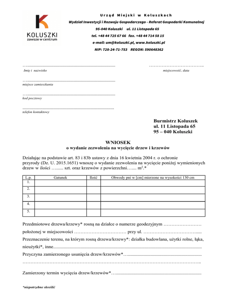 Urząd Miejski w Koluszkach Wydział Inwestycji i Rozwoju Gospodarczego - Referat Gospodarki Komunalnej 95-040 Koluszki ul. 11 Listopada 65 tel. +48 44 725 67 66 fax. +48 44 714 58 15 e-mail: [email protected], www.koluszki.pl NIP: 728-24-71-753 REGON: 590648362 ….......................................................................... Imię i nazwisko …………………………….. miejscowość, data ….......................................................................... miejsce zamieszkania ….......................................................................... kod pocztowy ............................................................................. telefon kontaktowy Burmistrz Koluszek ul. 11 Listopada 65 95 – 040 Koluszki WNIOSEK o wydanie zezwolenia na wycięcie drzew i krzewów Działając na podstawie art. 83 i 83b ustawy z dnia 16 kwietnia 2004 r. o ochronie przyrody (Dz. U. 2015.1651) wnoszę o wydanie zezwolenia na wycięcie poniżej wymienionych drzew w ilości …...... szt. oraz krzewów z powierzchni….... m2.* L.p. 1. Gatunek Ilość Obwody pni w [cm] mierzone na wysokości 130 cm 2. 3. 4. 5. Przedmiotowe drzewa/krzewy* rosną na działce o numerze geodezyjnym …………………… położonej w miejscowości …………………………… przy ul. ……………………………..... Przeznaczenie terenu, na którym rosną drzewa/krzewy*: działka budowlana, użytki rolne, łąka, nieużytki*, inne............................................................................................................................. Przyczyna zamierzonego usunięcia drzew/krzewów*….............................................................. ………………………………………………………………………………………………….. Zamierzony termin wycięcia drzew/krzewów*…........................................................................ *niepotrzebne skreślić Oświadczam, że jestem świadoma/y odpowiedzialności karnej za podanie fałszywych danych (art. 233 Kodeksu karnego) i że posiadam tytuł prawny władania przedmiotową nieruchomością (wpisać jaki: własność, współwłasność, wieczyste użytkowanie, współużytkowanie, dzierżawa, zarząd, trwały zarząd, administracja oraz inne, dające się udokumentować). ……………………….…………………………………………………………………………. ………………………………………. Czytelny podpis Załączniki: 1. Mapa z zaznaczonymi drzewami/krzewami. 2. Zdjęcia drzew/krzewów. 3. Pisemna zgoda właściciela nieruchomości * 4. Pełnomocnictwo i dowód uiszczenia opłaty skarbowej w wys. 17 zł (lub podanie podstawy prawnej zwolnienia z opłaty skarbowej) – dotyczy tylko wnioskodawcy działającego przez pełnomocnika Pouczenie: I. Wniosek o wydanie zezwolenia powinien zawierać: 1. imię, nazwisko i adres albo nazwę i siedzibę posiadacza i właściciela nieruchomości; 2. nazwę gatunku drzewa/drzew lub krzewu; 3. obwód pnia drzewa mierzonego na wysokości 130 cm; a w przypadku gdy na tej wysokości drzewo: a) posiada kilka pni - obwód każdego z tych pni, b) nie posiada pnia - obwód pnia bezpośrednio poniżej korony drzewa 4. przeznaczenie terenu, na którym rośnie drzewo/a/ lub krzew; 5. przyczynę i termin zamierzonego usunięcia drzewa/drzew lub krzewu; 6. wielkość powierzchni, z której zostaną usunięte krzewy ; 7. rysunek lub mapę określającą usytuowanie drzewa lub krzewu w stosunku do granic nieruchomości i obiektów budowlanych istniejących lub budowanych na tej nieruchomości. Jeżeli wniosek nie czyni zadość powyższym wymaganiom należy z mocy art. 64 § 2 KPA wezwać wnoszącego do usunięcia braków w terminie 7 dni z pouczeniem, że nieusunięcie tych braków spowoduje pozostawienie wniosku bez rozpatrzenia. II. Zezwolenia na usunięcie drzew lub krzewów nie wymagają: 1. drzewa, których obwód pnia na wysokości 5 cm nie przekracza: a) 35 cm - w przypadku topoli, wierzb, kasztanowca zwyczajnego, klonu jesionolistnego, klonu srebrzystego, robinii akacjowej oraz platanu klonolistnego b) 25 cm – w przypadku pozostałych drzew 2. krzewy, których wiek nie przekracza 10 lat 3. drzewa lub krzewy na plantacjach lub w lasach w rozumieniu ustawy o lasach 4. drzewa owocowe Wyrażam zgodę na przetwarzanie moich danych osobowych dla potrzeb Urzędu Miejskiego w Koluszkach zgodnie z ustawą z dnia 29 sierpnia 1997 r. o ochronie danych osobowych ( DZ. U. z 2014 r., poz. 1182 ze zm.). *nie jest wymagana gdy na wniosku widnieją czytelne podpisy wszystkich właścicieli