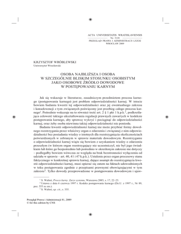 ACTA UNIVERSITATIS WRATISLAVIENSIS ———————— No 3128 ———————— PRZEGLĄD PRAWA I ADMINISTRACJI LXXXI WROCŁAW 2009 KRZYSZTOF WRÓBLEWSKI Uniwersytet Wrocławski OSOBA NAJBLIŻSZA I OSOBA W SZCZEGÓLNIE BLISKIM STOSUNKU OSOBISTYM JAKO OSOBOWE ŹRÓDŁO DOWODOWE W POSTĘPOWANIU KARNYM Jak się wskazuje w literaturze, zasadniczym przedmiotem procesu karnego (postępowania karnego) jest problem odpowiedzialności karnej. W istocie bowiem badaniu kwestii tej odpowiedzialności oraz jej ewentualnego zakresu i konsekwencji z tym związanych poświęcony jest przebieg całego procesu karnego1. Pośrednio wskazuje na to również treść art. 2 § 1 pkt 1 k.p.k.2, podkreślająca celowość takiego ukształtowania regulacji prawnych zawartych w kodeksie postępowania karnego, aby sprawcę wykryć i pociągnąć do odpowiedzialności karnej, oraz żeby osoba niewinna takiej odpowiedzialności nie poniosła. Badanie kwestii odpowiedzialności karnej nie może przybrać formy dowolnego rozstrzygania przez właściwy organ o zdarzeniu i związanej z nim odpowiedzialności bez posiadania wiedzy o istotnych dla rozstrzygnięcia okolicznościach potwierdzonych w zebranym w sprawie materiale dowodowym. Rozstrzyganie o odpowiedzialności karnej wiąże się bowiem z uzyskaniem wiedzy o zdarzeniu przeszłym (w którym organ rozstrzygający nie uczestniczył, nie był jego świadkiem lub które go bezpośrednio lub pośrednio w określonym zakresie nie dotyczy – podlegałby bowiem wówczas ze względu na brak bezstronności wyłączeniu od udziału w sprawie – art. 40, 41 i 47 k.p.k.). Ustalenie przez organ procesowy stanu faktycznego w konkretnej sprawie karnej, dające asumpt do rozstrzygnięcia kwestii odpowiedzialności karnej, musi opierać się zatem na faktach udowodnionych w toku postępowania zgodnie z przepisami prawnymi obowiązującymi w tym zakresie3. Tylko dowody przeprowadzone w postępowaniu dowodowym i ujaw1 S. Waltoś, Proces karny. Zarys systemu, Warszawa 2003, s. 17, 22–23. Ustawa z dnia 6 czerwca 1997 r. Kodeks postępowania karnego (Dz.U. z 1997 r., Nr 89, poz. 555 ze zm.). 3 S. Waltoś, op. cit., s. 335. 2 Przegląd Prawa i Administracji 81, 2009 © for this edition by CNS 108 KRZYSZTOF WRÓBLEWSKI nione na ich podstawie w toku rozprawy głównej okoliczności stanowić mogą podstawę wyroku (art. 410 k.p.k.). Wszystkie natomiast przeprowadzone dowody powinny być, zgodnie z art. 7 k.p.k., oceniane przez organ procesowy swobodnie, co implikuje konieczność badania pod względem wpływu na rozstrzygnięcie zarówno poszczególnych dowodów, jak i ich wzajemnych korelacji. Ocena taka powinna znaleźć swe odzwierciedlenie w uzasadnieniu faktycznym wydanego przez sąd wyroku (art. 424 k.p.k.). W szczególności chodzi o ocenę wiarygodności przeprowadzonych dowodów. W tym kontekście duże znaczenie mają dowody pochodzące od osobowych źródeł dowodowych. To bowiem z tym rodzajem źródeł wiąże się dodatkowe zagadnienie związane z motywami leżącymi u podstaw składania zeznań określonej treści. Poznanie przez organ procesowy rzeczywistych motywów zeznań (szczerych – prawdziwych, zgodnych z posiadaną wiedzą lub z nią niezgodnych, nieszczerych – fałszywych4) ma w związku z tym ogromne znaczenie dla oceny ich wartości dowodowej. To zaś możliwe jest po dokładnym rozpoznaniu cech świadka, jego osobowości, warunków życiowych i możliwych dla niego konsekwencji złożenia określonego zeznania5. Wymienione okoliczności nabierają wyjątkowego znaczenia w przypadku pewnej grupy osobowych źródeł dowodowych, a mianowicie grupy osób najbliższych i osób w szczególnie bliskim stosunku osobistym (zwanych wspólnie w dalszej części pracy osobami bliskimi). Kategoria osoby najbliższej ujęta została przez ustawodawcę w formę definicji legalnej w art. 115 § 11 k.k.6 Zgodnie z powołanym przepisem prawnym osobą najbliższą jest małżonek, wstępny, zstępny, rodzeństwo, powinowaty w tej samej linii lub stopniu, osoba pozostająca w stosunku przysposobienia oraz jej małżonek, a także osoba pozostająca we wspólnym pożyciu. Poza osobą pozostającą we wspólnym pożyciu, przynależność do grupy podmiotów z art. 115 § 11 k.k. determinowana jest zatem przez istnienie pomiędzy oskarżonym (podejrzanym) a osobowym źródłem dowodowym oznaczonego stosunku prawnego o charakterze prawnorodzinnym. Kategoria osoby w szczególnie bliskim stosunku osobistym nie została przez ustawodawcę zdefiniowana. W związku z tym należy uznać, że podobnie jak w przypadku osoby pozostającej we wspólnym pożyciu, decydujące znaczenie dla uznania przynależności do tej grupy będzie miało istnienie pomiędzy powołanymi osobami kwalifikowanego stosunku społecznego. Przy czym w wypadku wspólnego pożycia za istotne i niezbędne elementy uznaje się wspólne pożycie zarówno 4 M. Ciosek, K. Kmiecik, Psychologia kliniczna. Wprowadzenie do psychologii sądowo-penitencjarnej, Gdańsk 1987, s. 95–96. 5 M. Ciosek, Psychologia sądowa i penitencjarna, Warszawa 2003, s. 91. 6 Ustawa z dnia 6 czerwca 1997 r. Kodeks karny (Dz.U. z 1997 r., Nr 88, poz. 553 ze zm.). Przegląd Prawa i Administracji 81, 2009 © for this edition by CNS OSOBOWE ŹRÓDŁO DOWODOWE W POSTĘPOWANIU KARNYM 109 psychiczne, fizyczne, jak i wspólnotę ekonomiczną7. A za osobę pozostającą we wspólnym pożyciu uważa się osobę będącą w związku co do istoty takim samym jak małżeński, tyle tylko, że pozbawionym węzła prawnego8. Za osobę w szczególnie bliskim stosunku osobistym natomiast uznaje się osobę nienależącą do grupy osób najbliższych, którą jednak z oskarżonym (podejrzanym) łączy podobna do osób najbliższych relacja o charakterze szczególnie bliskim i osobistym. Istnienie takiego stosunku podlegało będzie ocenie organu procesowego w okolicznościach konkretnej sprawy9. Za wyróżnieniem wskazanej grupy podmiotów prze
