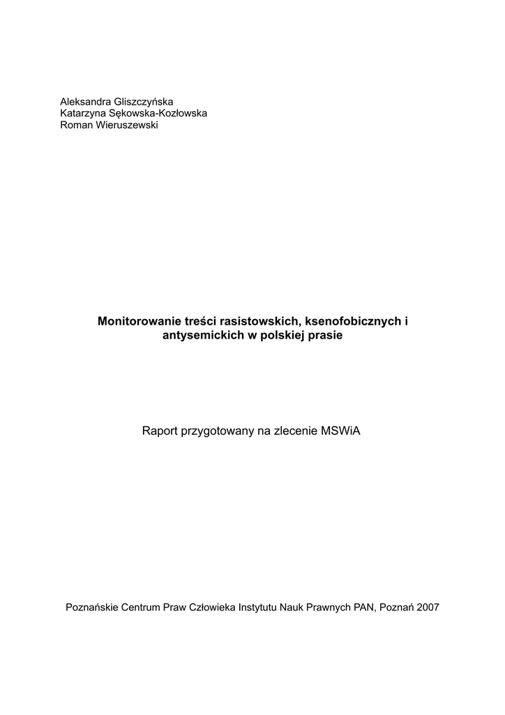 Aleksandra Gliszczyńska Katarzyna Sękowska-Kozłowska Roman Wieruszewski Monitorowanie treści rasistowskich, ksenofobicznych i antysemickich w polskiej prasie Raport przygotowany na zlecenie MSWiA Poznańskie Centrum Praw Człowieka Instytutu Nauk Prawnych PAN, Poznań 2007 Struktura raportu: Część I Założenia metodologiczne 1. Cel i podstawy przyjętych założeń……………………………… .. str. 5 2. Rekonstrukcja roboczych definicji………………………………… str. 9 Część II Raport cząstkowy 1. Informacja na temat źródeł………………………………………… str. 14 2. Wybrane cytaty wraz z komentarzem……………………………... str. 16 3. Wstępne wnioski………………………………………………………str. 45 4. Rekomendacje…………………………………………………..…… str. 51 2 Wprowadzenie Celem monitorowania wybranych publikacji i wydawnictw ukazujących się w Polsce pod kątem występujących w nich treści rasistowskich, ksenofobicznych i antysemickich jest określenie skali i postaci tego zjawiska w Polsce. Monitorowanie treści rasistowskich, ksenofobicznych i antysemickich stanowi jednocześnie realizację jednego z zadań wyznaczonych do przeprowadzenia m.in. przez MSWiA w Krajowym Programie Przeciwdziałania Dyskryminacji Rasowej, Ksenofobii i Związanej z Nimi Nietolerancji, jak również zaleceń zawartych w szeregu dokumentów międzynarodowych. Obowiązek monitorowania treści będących przedmiotem raportu zawarty jest m. in. w Deklaracji i Planie Działania Światowej Konferencji przeciwko Rasizmowi, Dyskryminacji Rasowej, Ksenofobii i Pokrewnym Formom Nietolerancji 1 oraz w większości zaleceń dotyczących ogólnej polityki Europejskiej Komisji przeciwko Rasizmowi i Nietolerancji (ECRI), będącej organem Rady Europy.2 Raport wpisuje się również w powszechnie przyjęte dziś wśród wspólnoty międzynarodowej przekonanie, iż wszelkie przejawy rasizmu, ksenofobii i antysemityzmu stanowią naruszenie zasad wolności i demokracji, a zwalczanie tych negatywnych zjawisk jest integralnym elementem systemu ochrony i promocji fundamentalnych praw człowieka. Prezentowany raport składa się z dwóch głównych części. Pierwsza część zawiera założenia metodologiczne, na których opierali się autorzy raportu Światowa Konferencja przeciwko Rasizmowi, Dyskryminacji Rasowej, Ksenofobii i Pokrewnym Formom Nietolerancji odbyła się w Durbanie, w Republice Południowej Afryki, w dniach 31 sierpnia – 7 września 2001 r., http://www.un.org/WCAR/. 1 Teksty dziewięciu z jedenastu przyjętych dotychczas zaleceń dotyczących polityki ogólnej ECRI opublikowane zostały w języku polskim w Biuletynie Biura Informacji Rady Europy, nr 4/2005. 2 3 podczas monitorowania i klasyfikowania wybranych treści. Sformułowanie założeń metodologicznych było elementem niezwykle istotnym ze względu na konieczność uzyskania rzetelnych rezultatów i przedstawienia wniosków, było również właściwe ze względu na brak wiążących prawnie definicji treści rasistowskich, ksenofobicznych i antysemickich. Drugą, zasadniczą część stanowi cząstkowy raport z pierwszej fazy monitoringu, trwającej od 16 listopada 2007 r. do 15 grudnia 2007 r. W raporcie cząstkowym zawarto: a) informacje na temat źródeł - wybranych tytułów prasowych, z których pochodzą zakwalifikowane przez autorów jako materiał badawczy treści (informacje na temat wydawcy, nakładu, redakcji oraz miejsca zakupu danego tytułu) wraz z uzasadnieniem dokonanego wyboru źródeł; b) wybrane cytaty zawierające treści rasistowskie, ksenofobiczne i antysemickie, wraz z krótkim komentarzem ukazującym kontekst użytych sformułowań, jak również podstawy zakwalifikowania ich do danej kategorii w odniesieniu do przyjętych założeń metodologicznych. Treści zostały sklasyfikowane z zachowaniem podziału na tytuły prasowe, w których zostały opublikowane; c) wnioski cząstkowe – wstępne z monitoringu, wraz ze wskazaniem w zakresie konieczności prowadzenia dalszych analiz i monitorowania. Dodatkowo, wymienione zostały tytuły publikacji książkowych, które zdaniem autorów raportu, powinny zostać poddane szczegółowej analizie pod względem występujących w nich treści rasistowskich, ksenofobicznych i antysemickich, wraz z uzasadnieniem dokonanego wyboru tytułów. Część I Założenia metodologiczne 4 1. Cel i podstawy przyjętych założeń Przedstawiając zarys kryteriów przyjętych na potrzeby niniejszego badania należy wyjść od podstawowego założenia, iż wolność wyrażania poglądów gwarantowana przez art. 54 Konstytucji RP nie jest wolnością absolutną. Zarówno na gruncie międzynarodowych standardów praw człowieka, jak i ustawodawstw krajowych, nie budzi wątpliwości zasadność wyłączenia spod „parasola ochronnego” zasady wolności słowa wypowiedzi o charakterze rasistowskim, ksenofobicznym i antysemickim3. Co więcej, na państwach ciąży obowiązek penalizacji czynów polegających na propagowaniu poglądów tej treści oraz ścigania ich sprawców. W Zaleceniu nr 1 dotyczącym ogólnej polityki Europejskiej Komisji przeciwko Rasizmowi i Nietolerancji czytamy, iż: „w zgodzie ze zobowiązaniami podjętymi przez państwo na podstawie stosownych instrumentów międzynarodowych, a w szczególności z artykułem 10 i 11 Europejskiej Konwencji o Ochronie Praw Człowieka, ustne, pisemne, audiowizualne wypowiedzi, a także inne formy ekspresji włączając media elektroniczne, podżegające do nienawiści, dyskryminacji czy przemocy wobec rasowych, etnicznych czy religijnych grup lub przeciwko ich członkom, na podstawie tego, że przynależą oni do takiej grupy, są prawnie sklasyfikowane jako przestępstwa karne, które mogą także obejmować produkcję, dystrybucję i przechowywanie w celu dystrybucji tych materiałów”.4 Europejski Trybunał Praw Człowieka 