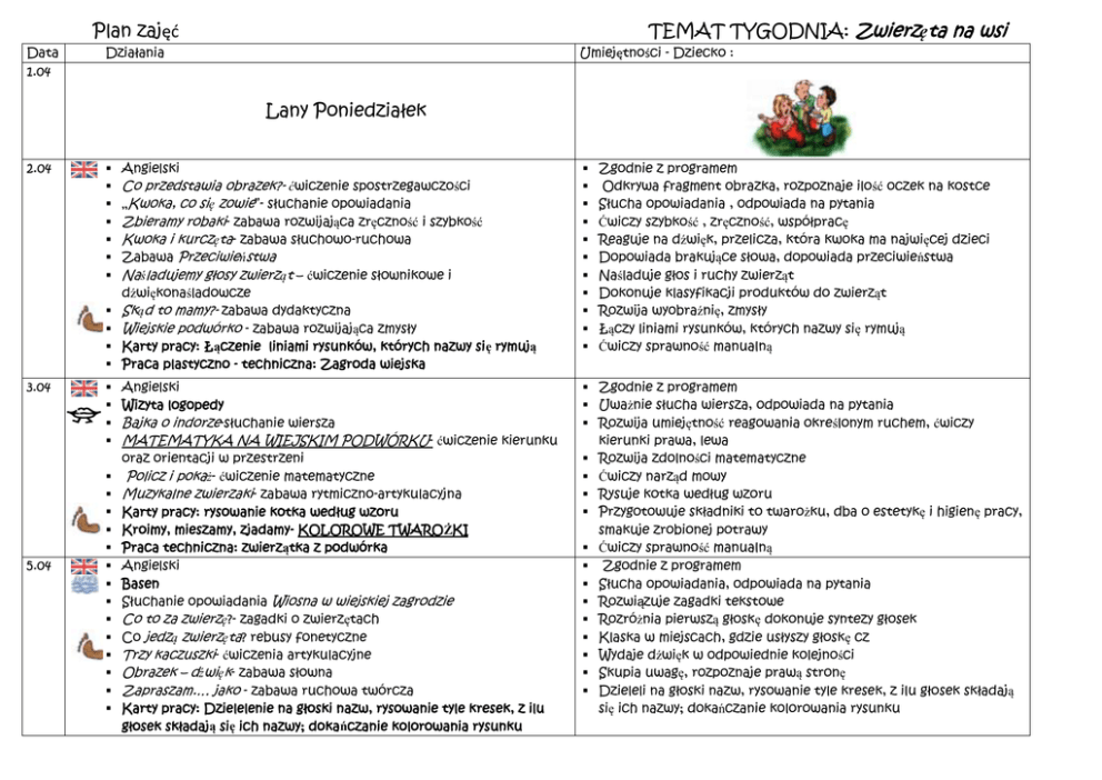 Plan zajęć TEMAT TYGODNIA: Zwierzęta na wsi Lany Poniedziałek