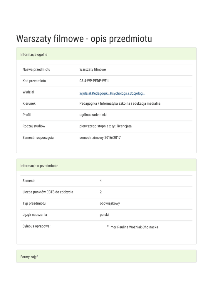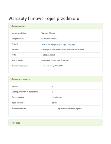 Warszaty filmowe - opis przedmiotu Informacje ogólne Nazwa przedmiotu Warszaty filmowe Kod przedmiotu 03.4-WP-PEDP-WFIL Wydział Wydział Pedagogiki, Psychologii i Socjologii Kierunek Pedagogika / Informatyka szkolna i edukacja medialna Profil ogólnoakademicki Rodzaj studiów pierwszego stopnia z tyt. licencjata Semestr rozpoczęcia semestr zimowy 2016/2017 Informacje o przedmiocie Semestr 4 Liczba punktów ECTS do zdobycia 2 Typ przedmiotu obowiązkowy Język nauczania polski Sylabus opracował Formy zajęć mgr Paulina Woźniak-Chojnacka Forma zajęć Laboratorium Liczba godzin Liczba godzin Liczba godzin w Liczba godzin w Forma w semestrze w tygodniu semestrze tygodniu zaliczenia (stacjonarne) (stacjonarne) (niestacjonarne) (niestacjonarne) 30 2 18 1,2 Zaliczenie na ocenę Cel przedmiotu Zapoznanie studentów z różnymi formatami plików wideo, konwersja plików. Nabycie przez studentów umiejętności i kompetencji w zakresie tworzenia filmów i scenariuszy, przechwytywania obrazu dźwięku z nośników oraz obróbki i montażu materiałów wideo. Przygotowanie do samodzielnego studiowania zagadnień w zakresie tworzenia filmów. Wymagania wstępne Umiejętność korzystania ze standardowego oprogramowania środowiska Windows oraz zasobów komputera. Zakres tematyczny 1. Wprowadzenie w podstawy tworzenia filmu, organizacja pracy na planie filmowym, podstawowe pojęcia (kadr, ujęcie, scena, sekwencja, wątek). 2. Scenariusz filmowy, scenopis, storyboard. 3. Podstawowe metody kompozycji kadru, zasada złotego podziału, kadrowanie, zasada trójkąta, oś kontaktu. 4. Plany filmowe i perspektywy. 5. Kąty widzenia kamery, ruch kamery. 6. Rodzaje filmów wideo, przenoszenie materiału z kamery do komputera. 7. Podstawy montażu nieliniowego, time code. 8. Obróbka materiału wideo (importowanie plików, dzielenie, łączenie, efekty), authoring, zapisanie filmu na dysk. Metody kształcenia Zajęcia o charakterze praktycznym, pokaz, metoda projektu, zajęcia produkcyjne, praca w grupach. Efekty kształcenia i metody weryfikacji osiągania efektów kształcenia Opis efektu Symbole Metody weryfikacji Forma zajęć efektów Student wymienia podstawy sztuki K_W09 Odpowiedź ustna; scenopisarstwa, reżyserii, sztuki K_W19 sprawdzian z operatorskiej oraz montażu; klasyfikuje K_W20 progami sprzęt wideo; zna formaty zapisu wideo Laboratorium punktowymi. oraz podstawy montażu; zna i rozumie podstawy prawa autorskiego. Samodzielnie przygotowuje scenariusz K_U04 filmowy. Przechwytuje obraz i dźwięk z K_U14 Ocena prac Laboratorium Ocena prac Laboratorium nośników oraz stosuje programy do montażu materiałów audiowideo. Student jest kreatywny w realizacjach K_K02 projektów filmowych. Warunki zaliczenia Warunkiem zaliczenia przedmiotu jest aktywna praca studenta podczas zajęć, wykonanie zadanych projektów (zgodność z tematem, struktura pracy, poprawny język, odpowiedni i twórczy dobór literatury; część praktyczna, np. film zgodny z przyjętymi założeniami). Laboratoria Pozytywne zaliczenie wszystkich podlegających ocenie zadań i prac. Ocena końcowa jest średnią arytmetyczną wszystkich ocen cząstkowych. Ocena końcowa Ocena końcowa jest oceną z laboratorium (średnia arytmetyczna wszystkich ocen). Obciążenie pracą Obciążenie pracą Studia Studia niestacjonarne stacjonarne (w godz.) (w godz.) Godziny kontaktowe (udział w zajęciach; konsultacjach; egzaminie, itp.) 35 23 Samodzielna praca studenta (przygotowanie do: zajęć, kolokwium, 25 37 Łącznie 60 60 Punkty ECTS Studia Studia niestacjonarne egzaminu; studiowanie literatury przygotowanie: pracy pisemnej, projektu, prezentacji, raportu, wystąpienia; itp.) stacjonarne Zajęcia z udziałem nauczyciela akademickiego 1 1 Zajęcia bez udziału nauczyciela akademickiego 1 1 Łącznie 2 2 Literatura podstawowa 1. Danowski B., Komputerowy montaż wideo. Ćwiczenia praktyczne, Wyd. Helion, Gliwice 2006. 2. Kingdon T., Sztuka reżyserii filmowej, Wyd. Wojciech Marzec, Warszawa 2007. 3. Mascelli J. V., 5 tajników warsztatu filmowego, Wyd. Wojciech Marzec, Warszawa 2007. 4. Russin R. U., Downs W. M., Jak napisać scenariusz filmowy, Wyd. Wojciech Marzec, Warszawa 2005. 5. Świerk G., Madurski Ł., Multimedia. Obróbka dźwięku i filmów. Podstawy, Wyd. Helion, Gliwice 2004. Literatura uzupełniająca 1. Andrejew P., Dąbal W., Kompendium terminologii filmowej, Wyd. Aero Scope, Warszawa 2005. 2. Arijon D., Gramatyka języka filmowego, Wyd. Wojciech Marzec, Warszawa 2008. 3. Brown b., Światło w filmie, Wyd. Wojciech Marzec, Warszawa 2009. 4. Gdula M., Adobe Premiere Pro. Ćwiczenia, Wyd. Helion, Gliwice 2004. 5. Hunter L., Kurs pisania scenariuszy, Wydawnictwo Fimowe, 2013. 6. Karpiński M., Scenariusz: niedoskonałe odbicie filmu, Wyd. Rabid, Kraków 2004. 7. Murch W., W mgnieniu oka. Sztuka montażu filmowego, Wyd. Wojciech Marzec, Warszawa 2006. 8. Paul J., 100 sposobów na cyfrowe wideo, Wyd. Helion, Gliwice 2006. 9. Reisz K., Millar G., Technika montażu filmowego, Wyd. Wojciech Marzec, Warszawa 2014. 10. Schabenbeck M., Format scenariusza filmowego, Wyd. Wojciech Marzec, Warszawa 2008. 11. Simon M., Storyboard - Ruch w Sztuce Filmowej, Wyd. Wojciech Marzec, Warszawa 2010. 12. Wrotek W., Ulead Video Studio 11 pl. Pierwsze starcie, Wyd. Helion, Gliwice 2008. 13. Zonn l., Matula J., O montażu w filmie, Wyd. Centrum Animacji Kultury, 2001. Uwagi Zmodyfikowane przez dr Jacek Jędryczkowski (ostatnia modyfikacja: 14-07-2016 20:06)