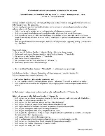 Ulotka dołączona do opakowania: informacja dla pacjenta Calcium Sandoz + Vitamin D3, 500 mg + 440 IU, tabletki do rozgryzania i żucia Calcium + Cholecalciferolum Należy uważnie zapoznać się z treścią ulotki przed zastosowaniem leku, ponieważ zawiera ona informacje ważne dla pacjenta. Lek ten należy zawsze stosować dokładnie tak, jak to opisano w ulotce dla pacjenta lub według zaleceń lekarza lub farmaceuty. - Należy zachować tę ulotkę, aby w razie potrzeby móc ją ponownie przeczytać. - Jeśli potrzebna jest rada lub dodatkowa informacja, należy zwrócić się do farmaceuty. - Jeśli u pacjenta wystąpią jakiekolwiek objawy niepożądane, w tym wszelkie możliwe objawy niepożądane niewymienione w ulotce, należy powiedzieć o tym lekarzowi lub farmaceucie. Patrz punkt 4. - Jeśli po upływie miesiąca nie nastąpiła poprawa lub pacjent czuje się gorzej, należy skontaktować się z lekarzem. Spis treści ulotki 1. Co to jest lek Calcium Sandoz + Vitamin D3 i w jakim celu się go stosuje 2. Informacje ważne przed zastosowaniem leku Calcium Sandoz + Vitamin D3 3. Jak stosować lek Calcium Sandoz + Vitamin D3 4. Możliwe działania niepożądane 5. Jak przechowywać lek Calcium Sandoz + Vitamin D3 6. Zawartość opakowania i inne informacje 1. Co to jest lek Calcium Sandoz + Vitamin D3 i w jakim celu się go stosuje Lek Calcium Sandoz + Vitamin D3 zawiera substancje czynne - wapń i witaminę D3. Lek jest suplementem wapnia i witaminy D3. Lek Calcium Sandoz + Vitamin D3 stosowany jest - w celu zapobiegania i leczenia niedoboru wapnia i witaminy D3 u osób w podeszłym wieku; - jako uzupełnienie witaminy D i wapnia we wspomagającym leczeniu osteoporozy (kruchości kości). 2. Informacje ważne przed zastosowaniem leku Calcium Sandoz + Vitamin D3 Kiedy nie stosować leku Calcium Sandoz + Vitamin D3 jeśli pacjent ma uczulenie na wapń, witaminę D3 lub na którykolwiek z pozostałych składników tego leku (wymienionych w punkcie 6). jeśli pacjent ma duże stężenie wapnia we krwi (hiperkalcemia). jeśli pacjent wydala w moczu duże ilości wapnia (hiperkalciuria). jeśli u pacjenta stwierdzono nadczynność przytarczyc (hiperparatyroidyzm). jeśli pacjent choruje na raka szpiku kostnego (szpiczak). jeśli pacjent choruje na raka, który dał przerzuty do kości. jeśli pacjent ma ograniczone ruchy kończyn (długotrwałe unieruchomienie), któremu towarzyszy hiperkalcemia i (lub) hiperkalciuria. jeśli u pacjenta stwierdzono kamicę nerkową. jeśli w nerkach pacjenta stwierdzono obecność złogów wapnia (wapnica nerek). jeśli pacjent przyjmuje za duże ilości witaminy D (hiperwitaminoza D). jeśli pacjent ma ciężkie zaburzenia czynności nerek. jeśli pacjent ma mniej niż 18 lat. 1 DE/H/37420/001/IB/003 Ostrzeżenia i środki ostrożności Przed rozpoczęciem przyjmowania leku Calcium Sandoz + Vitamin D3 należy omówić to z lekarzem lub farmaceutą, jeśli którakolwiek z poniższych informacji dotyczy pacjenta: długotrwałe leczenie Podczas długotrwałego leczenia należy regularnie kontrolować stężenie wapnia we krwi i w moczu oraz badać czynność nerek. Jest to szczególnie ważne u pacjentów ze skłonnością do powstawania kamieni nerkowych. W zależności od wyników badań lekarz może zmniejszyć dawkę leku lub przerwać leczenie. Jeśli pacjent przyjmuje lek dostępny bez recepty, po miesiącu stosowania trzeba skonsultować się z lekarzem. jednoczesne stosowanie glikozydów naparstnicy lub tiazydowych leków moczopędnych z powodu problemów z sercem W takim wypadku należy systematycznie kontrolować stężenie wapnia we krwi i w moczu oraz badać czynność nerek, zwłaszcza u osób w podeszłym wieku. W zależności od wyników badań lekarz może zmniejszyć dawkę leku lub przerwać leczenie. zaburzenia czynności nerek Pacjenci z zaburzeniami czynności nerek powinni szczególnie ostrożnie stosować lek Calcium Sandoz + Vitamin D3. Dotyczy to zwłaszcza osób, które przyjmują również leki zawierające glin, gdyż kwas cytrynowy zawarty w leku Calcium Sandoz + Vitamin D3 może zwiększać wchłanianie glinu. Należy sprawdzać stężenie wapnia we krwi i w moczu. Pacjenci z ciężkimi zaburzeniami czynności nerek powinni przyjmować witaminę D w innej postaci niż cholekalcyferol. dodatkowe przyjmowanie preparatów wapnia i witaminy D W takim wypadku konieczna jest kontrola lekarza, który zaleci częste badanie stężenia wapnia we krwi i w moczu. sarkoidoza (zaburzenie układu odpornościowego, które może dotyczyć wątroby, płuc, skóry lub węzłów chłonnych) Pacjenci z sarkoidozą powinni zachować szczególną ostrożność podczas stosowania leku Calcium Sandoz + Vitamin D3. Istnieje ryzyko zbyt silnego działania leku, a w konsekwencji przedawkowania wapnia. Konieczne jest kontrolowanie stężenia wapnia we krwi i w moczu. unieruchomienie i osteoporoza W takim wypadku należy zachować szczególną ostrożność, gdyż możliwe jest zwiększenie stężenia wapnia we krwi. Jeśli lek przyjmowany jest z powodu osteoporozy, należy skontrolować stężenie wapnia we krwi przed rozpoczęciem leczenia. Dzieci i młodzież Leku Calcium Sandoz + Vitamin D3 nie wolno stosować u dzieci i młodzieży w wieku poniżej 18 lat (patrz wyżej punkt „Kiedy nie stosować leku Calcium Sandoz + Vitamin D3”). Calcium Sandoz + Vitamin D3 a inne leki Należy powiedzieć lekarzowi lub farmaceucie o wszystkich lekach przyjmowanych przez pacjenta obecnie lub ostatnio, a także o lekach, które pacjent planuje stosować. Jeśli pacjent jest jednocześnie leczony glikozydami naparstnicy (glikozydy nasercowe pochodzące z naparstnicy), mogą wystąpić zaburzenia rytmu serca. Dlatego konieczne jest ścisłe monitorowanie stanu pacjenta, w tym badanie EKG i pomiar stężenia wapnia we krwi. Jeśli pacjent przyjmuje jednocześnie tiazydowe leki moczopędne, należy systematycznie kontrolować stężenie wapnia we krwi, gdyż leki