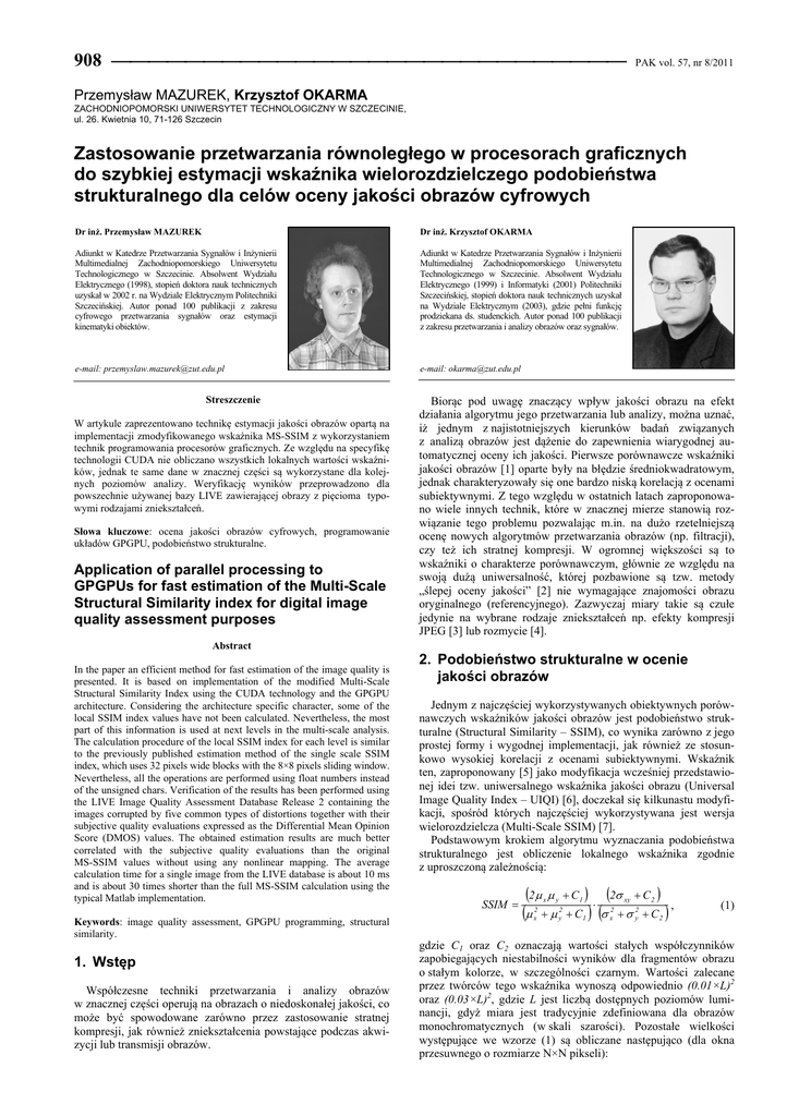 908 PAK vol. 57, nr 8/2011 Przemysław MAZUREK, Krzysztof OKARMA ZACHODNIOPOMORSKI UNIWERSYTET TECHNOLOGICZNY W SZCZECINIE, ul. 26. Kwietnia 10, 71-126 Szczecin Zastosowanie przetwarzania równoległego w procesorach graficznych do szybkiej estymacji wskaźnika wielorozdzielczego podobieństwa strukturalnego dla celów oceny jakości obrazów cyfrowych Dr inż. Przemysław MAZUREK Dr inż. Krzysztof OKARMA Adiunkt w Katedrze Przetwarzania Sygnałów i Inżynierii Multimedialnej Zachodniopomorskiego Uniwersytetu Technologicznego w Szczecinie. Absolwent Wydziału Elektrycznego (1998), stopień doktora nauk technicznych uzyskał w 2002 r. na Wydziale Elektrycznym Politechniki Szczecińskiej. Autor ponad 100 publikacji z zakresu cyfrowego przetwarzania sygnałów oraz estymacji kinematyki obiektów. Adiunkt w Katedrze Przetwarzania Sygnałów i Inżynierii Multimedialnej Zachodniopomorskiego Uniwersytetu Technologicznego w Szczecinie. Absolwent Wydziału Elektrycznego (1999) i Informatyki (2001) Politechniki Szczecińskiej, stopień doktora nauk technicznych uzyskał na Wydziale Elektrycznym (2003), gdzie pełni funkcję prodziekana ds. studenckich. Autor ponad 100 publikacji z zakresu przetwarzania i analizy obrazów oraz sygnałów. e-mail: [email protected] e-mail: [email protected] Streszczenie W artykule zaprezentowano technikę estymacji jakości obrazów opartą na implementacji zmodyfikowanego wskaźnika MS-SSIM z wykorzystaniem technik programowania procesorów graficznych. Ze względu na specyfikę technologii CUDA nie obliczano wszystkich lokalnych wartości wskaźników, jednak te same dane w znacznej części są wykorzystane dla kolejnych poziomów analizy. Weryfikację wyników przeprowadzono dla powszechnie używanej bazy LIVE zawierającej obrazy z pięcioma typowymi rodzajami zniekształceń. Słowa kluczowe: ocena jakości obrazów cyfrowych, programowanie układów GPGPU, podobieństwo strukturalne. Application of parallel processing to GPGPUs for fast estimation of the Multi-Scale Structural Similarity index for digital image quality assessment purposes Biorąc pod uwagę znaczący wpływ jakości obrazu na efekt działania algorytmu jego przetwarzania lub analizy, można uznać, iż jednym z najistotniejszych kierunków badań związanych z analizą obrazów jest dążenie do zapewnienia wiarygodnej automatycznej oceny ich jakości. Pierwsze porównawcze wskaźniki jakości obrazów [1] oparte były na błędzie średniokwadratowym, jednak charakteryzowały się one bardzo niską korelacją z ocenami subiektywnymi. Z tego względu w ostatnich latach zaproponowano wiele innych technik, które w znacznej mierze stanowią rozwiązanie tego problemu pozwalając m.in. na dużo rzetelniejszą ocenę nowych algorytmów przetwarzania obrazów (np. filtracji), czy też ich stratnej kompresji. W ogromnej większości są to wskaźniki o charakterze porównawczym, głównie ze względu na swoją dużą uniwersalność, której pozbawione są tzw. metody „ślepej oceny jakości” [2] nie wymagające znajomości obrazu oryginalnego (referencyjnego). Zazwyczaj miary takie są czułe jedynie na wybrane rodzaje zniekształceń np. efekty kompresji JPEG [3] lub rozmycie [4]. Abstract In the paper an efficient method for fast estimation of the image quality is presented. It is based on implementation of the modified Multi-Scale Structural Similarity Index using the CUDA technology and the GPGPU architecture. Considering the architecture specific character, some of the local SSIM index values have not been calculated. Nevertheless, the most part of this information is used at next levels in the multi-scale analysis. The calculation procedure of the local SSIM index for each level is similar to the previously published estimation method of the single scale SSIM index, which uses 32 pixels wide blocks with the 8×8 pixels sliding window. Nevertheless, all the operations are performed using float numbers instead of the unsigned chars. Verification of the results has been performed using the LIVE Image Quality Assessment Database Release 2 containing the images corrupted by five common types of distortions together with their subjective quality evaluations expressed as the Differential Mean Opinion Score (DMOS) values. The obtained estimation results are much better correlated with the subjective quality evaluations than the original MS-SSIM values without using any nonlinear mapping. The average calculation time for a single image from the LIVE database is about 10 ms and is about 30 times shorter than the full MS-SSIM calculation using the typical Matlab implementation. Keywords: image quality assessment, GPGPU programming, structural similarity. 1. Wstęp Współczesne techniki przetwarzania i analizy obrazów w znacznej części operują na obrazach o niedoskonałej jakości, co może być spowodowane zarówno przez zastosowanie stratnej kompresji, jak również zniekształcenia powstające podczas akwizycji lub transmisji obrazów. 2. Podobieństwo strukturalne w ocenie jakości obrazów Jednym z najczęściej wykorzystywanych obiektywnych porównawczych wskaźników jakości obrazów jest podobieństwo strukturalne (Structural Similarity – SSIM), co wynika zarówno z jego prostej formy i wygodnej implementacji, jak również ze stosunkowo wysokiej korelacji z ocenami subiektywnymi. Wskaźnik ten, zaproponowany [5] jako modyfikacja wcześniej przedstawionej idei tzw. uniwersalnego wskaźnika jakości obrazu (Universal Image Quality Index – UIQI) [6], doczekał się kilkunastu modyfikacji, spośród których najczęściej wykorzystywana jest wersja wielorozdzielcza (Multi-Scale SSIM) [7]. Podstawowym krokiem algorytmu wyznaczania podobieństwa strukturalnego jest obliczenie lokalnego wskaźnika zgodnie z uproszczoną zależnością: SSIM 2 x 2 x y 2 y 2 C , C C C1 1 xy 2 x 2 2 y (1) 2 gdzie C1 oraz C2 oznaczają wartości stałych współczynników zapobiegających niestabilności 