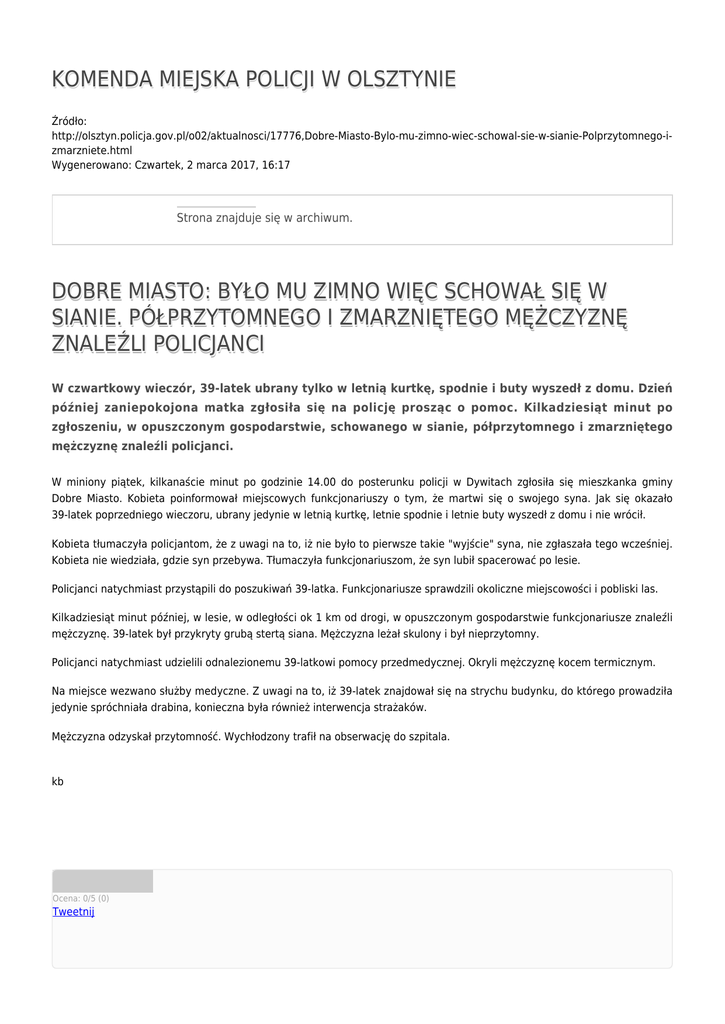 KOMENDA MIEJSKA POLICJI W OLSZTYNIE Źródło: http://olsztyn.policja.gov.pl/o02/aktualnosci/17776,Dobre-Miasto-Bylo-mu-zimno-wiec-schowal-sie-w-sianie-Polprzytomnego-izmarzniete.html Wygenerowano: Czwartek, 2 marca 2017, 16:17 Strona znajduje się w archiwum. DOBRE MIASTO: BYŁO MU ZIMNO WIĘC SCHOWAŁ SIĘ W SIANIE. PÓŁPRZYTOMNEGO I ZMARZNIĘTEGO MĘŻCZYZNĘ ZNALEŹLI POLICJANCI W czwartkowy wieczór, 39-latek ubrany tylko w letnią kurtkę, spodnie i buty wyszedł z domu. Dzień później zaniepokojona matka zgłosiła się na policję prosząc o pomoc. Kilkadziesiąt minut po zgłoszeniu, w opuszczonym gospodarstwie, schowanego w sianie, półprzytomnego i zmarzniętego mężczyznę znaleźli policjanci. W miniony piątek, kilkanaście minut po godzinie 14.00 do posterunku policji w Dywitach zgłosiła się mieszkanka gminy Dobre Miasto. Kobieta poinformował miejscowych funkcjonariuszy o tym, że martwi się o swojego syna. Jak się okazało 39-latek poprzedniego wieczoru, ubrany jedynie w letnią kurtkę, letnie spodnie i letnie buty wyszedł z domu i nie wrócił. Kobieta tłumaczyła policjantom, że z uwagi na to, iż nie było to pierwsze takie "wyjście" syna, nie zgłaszała tego wcześniej. Kobieta nie wiedziała, gdzie syn przebywa. Tłumaczyła funkcjonariuszom, że syn lubił spacerować po lesie. Policjanci natychmiast przystąpili do poszukiwań 39-latka. Funkcjonariusze sprawdzili okoliczne miejscowości i pobliski las. Kilkadziesiąt minut później, w lesie, w odległości ok 1 km od drogi, w opuszczonym gospodarstwie funkcjonariusze znaleźli mężczyznę. 39-latek był przykryty grubą stertą siana. Mężczyzna leżał skulony i był nieprzytomny. Policjanci natychmiast udzielili odnalezionemu 39-latkowi pomocy przedmedycznej. Okryli mężczyznę kocem termicznym. Na miejsce wezwano służby medyczne. Z uwagi na to, iż 39-latek znajdował się na strychu budynku, do którego prowadziła jedynie spróchniała drabina, konieczna była również interwencja strażaków. Mężczyzna odzyskał przytomność. Wychłodzony trafił na obserwację do szpitala. kb Ocena: 0/5 (0) Tweetnij
