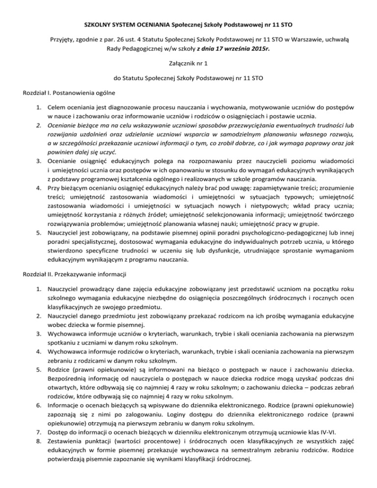SZKOLNY SYSTEM OCENIANIA Społecznej Szkoły Podstawowej nr 11 STO Przyjęty, zgodnie z par. 26 ust. 4 Statutu Społecznej Szkoły Podstawowej nr 11 STO w Warszawie, uchwałą Rady Pedagogicznej w/w szkoły z dnia 17 września 2015r. Załącznik nr 1 do Statutu Społecznej Szkoły Podstawowej nr 11 STO Rozdział I. Postanowienia ogólne 1. Celem oceniania jest diagnozowanie procesu nauczania i wychowania, motywowanie uczniów do postępów w nauce i zachowaniu oraz informowanie uczniów i rodziców o osiągnięciach i postawie ucznia. 2. Ocenianie bieżące ma na celu wskazywanie uczniowi sposobów przezwyciężania ewentualnych trudności lub rozwijania uzdolnień oraz udzielanie uczniowi wsparcia w samodzielnym planowaniu własnego rozwoju, a w szczególności przekazanie uczniowi informacji o tym, co zrobił dobrze, co i jak wymaga poprawy oraz jak powinien dalej się uczyć. 3. Ocenianie osiągnięć edukacyjnych polega na rozpoznawaniu przez nauczycieli poziomu wiadomości i umiejętności ucznia oraz postępów w ich opanowaniu w stosunku do wymagań edukacyjnych wynikających z podstawy programowej kształcenia ogólnego i realizowanych w szkole programów nauczania. 4. Przy bieżącym ocenianiu osiągnięć edukacyjnych należy brać pod uwagę: zapamiętywanie treści; zrozumienie treści; umiejętność zastosowania wiadomości i umiejętności w sytuacjach typowych; umiejętność zastosowania wiadomości i umiejętności w sytuacjach nowych i nietypowych; wkład pracy ucznia; umiejętność korzystania z różnych źródeł; umiejętność selekcjonowania informacji; umiejętność twórczego rozwiązywania problemów; umiejętność planowania własnej nauki; umiejętność pracy w grupie. 5. Nauczyciel jest zobowiązany, na podstawie pisemnej opinii poradni psychologiczno-pedagogicznej lub innej poradni specjalistycznej, dostosować wymagania edukacyjne do indywidualnych potrzeb ucznia, u którego stwierdzono specyficzne trudności w uczeniu się lub dysfunkcje, utrudniające sprostanie wymaganiom edukacyjnym wynikającym z programu nauczania. Rozdział II. Przekazywanie informacji 1. Nauczyciel prowadzący dane zajęcia edukacyjne zobowiązany jest przedstawić uczniom na początku roku szkolnego wymagania edukacyjne niezbędne do osiągnięcia poszczególnych śródrocznych i rocznych ocen klasyfikacyjnych ze swojego przedmiotu. 2. Nauczyciel danego przedmiotu jest zobowiązany przekazać rodzicom na ich prośbę wymagania edukacyjne wobec dziecka w formie pisemnej. 3. Wychowawca informuje uczniów o kryteriach, warunkach, trybie i skali oceniania zachowania na pierwszym spotkaniu z uczniami w danym roku szkolnym. 4. Wychowawca informuje rodziców o kryteriach, warunkach, trybie i skali oceniania zachowania na pierwszym zebraniu z rodzicami w danym roku szkolnym. 5. Rodzice (prawni opiekunowie) są informowani na bieżąco o postępach w nauce i zachowaniu dziecka. Bezpośrednią informację od nauczyciela o postępach w nauce dziecka rodzice mogą uzyskać podczas dni otwartych, które odbywają się co najmniej 4 razy w roku szkolnym; o zachowaniu dziecka – podczas zebrań rodziców, które odbywają się co najmniej 4 razy w roku szkolnym. 6. Informacje o ocenach bieżących są wpisywane do dziennika elektronicznego. Rodzice (prawni opiekunowie) zapoznają się z nimi po zalogowaniu. Loginy dostępu do dziennika elektronicznego rodzice (prawni opiekunowie) otrzymują na pierwszym zebraniu w danym roku szkolnym. 7. Dostęp do informacji o ocenach bieżących w dzienniku elektronicznym otrzymują uczniowie klas IV-VI. 8. Zestawienia punktacji (wartości procentowe) i śródrocznych ocen klasyfikacyjnych ze wszystkich zajęć edukacyjnych w formie pisemnej przekazuje wychowawca na semestralnym zebraniu rodziców. Rodzice potwierdzają pisemnie zapoznanie się wynikami klasyfikacji śródrocznej. 9. Bieżące ocenianie zachowania w klasach IV-VI dokonywane jest w „Dziennikach zachowania” z uwzględnieniem „Warunków, sposobów i kryteriów oceniania zachowania”, będących załącznikiem do szkolnego systemu oceniania (załącznik nr 1). Przekazywanie informacji rodzicom (prawnym opiekunom) przez wychowawców klas IV-VI o bieżącej punktacji z zachowania odbywa się w formie i trybie ustalonych z rodzicami (prawnymi opiekunami) na pierwszym zebraniu w danym roku szkolnym. 10. Wychowawcy informują rodziców o bieżącym zachowaniu ich dziecka na zebraniach rodziców; w klasach IV - VI w formie pisemnej na koniec I semestru, wskazując zachowania pozytywne i zachowania, które wymagają poprawy. 11. Rok szkolny dzieli się na dwa semestry. Termin zakończenia I semestru podaje dyrektor szkoły, publikując plan pracy szkoły na stronie internetowej szkoły i wywieszając informacje na tablicy ogłoszeń. 12. O przewidywanych śródrocznych i rocznych ocenach klasyfikacyjnych niedostatecznych nauczyciele informują ucznia w formie ustnej i rodzica w formie pisemnej na miesiąc przed klasyfikacją śródroczną i roczną. 13. Termin klasyfikacji śródrocznej i rocznej wynika z organizacji roku szkolnego ustalonej przez MEN. Szczegółowe terminy posiedzeń klasyfikacyjnych rad pedagogicznych dyrektor szkoły ogłasza na początku roku szkolnego i wywiesza na tablicy ogłoszeń. 14. Nauczyciele poszczególnych zajęć edukacyjnych oraz wychowawca informują ucznia i rodziców (opiekunów prawnych) o przewidywanych klasyfikacyjnych ocenach semestralnej śródrocznych i rocznych i przewidywanej śródrocznej i rocznej ocenie klasyfikacyjnej zachowania na tydzień przed posiedzeniem rady klasyfikacyjnej w formie zapisu przewidywanej oceny w dzienniku elektronicznym. 15. Nauczyciele wystawiają klasyfikacyjne oceny śródroczne i roczne co najmniej na jeden dzień przed posiedzeniem klasyfikacyjnych rad pedagogicznych. Rozdział III. Ocenianie efektów nauczania w klasach I-III 1. W klasach I-III stosowana jest ocena opisowa. 2. Ocenianie bieżące jest dokonywane w d