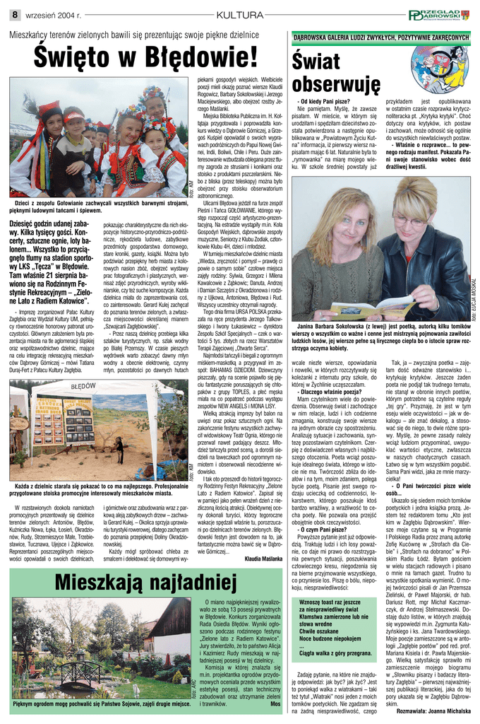 8 wrzesieƒ 2004 r. KULTURA foto: KM Âwi´to w B∏´dowie! Dzieci z zespo∏u Go∏owianie zachwycali wszystkich barwnymi strojami, pi´knymi ludowymi taƒcami i Êpiewem. Dziesi´ç godzin udanej zabawy. Kilka tysi´cy goÊci. Koncerty, sztuczne ognie, loty balonem... Wszystko to przyciàgn´∏o t∏umy na stadion sportowy LKS „T´cza” w B∏´dowie. Tam w∏aÊnie 21 sierpnia bawiono si´ na Rodzinnym Festynie Rekreacyjnym – „Zielone Lato z Radiem Katowice”. foto: KM - Imprez´ zorganizowa∏ Pa∏ac Kultury Zag∏´bia oraz Wydzia∏ Kultury UM, pe∏niàcy równoczeÊnie honorowy patronat uroczystoÊci. G∏ównym za∏o˝eniem by∏a prezentacja miasta na tle aglomeracji Êlàskiej oraz wspó∏zawodnictwo dzielnic, majàce na celu integracj´ rekreacyjnà mieszkaƒców Dàbrowy Górniczej – mówi Tatiana Duraj-Fert z Pa∏acu Kultury Zag∏´bia. pokazujàc charakterystyczne dla nich ekspozycje historyczno-przyrodniczo-podró˝nicze, r´kodzie∏a ludowe, zabytkowe przedmioty gospodarstwa domowego, stare kroniki, gazety, ksià˝ki. Mo˝na by∏o podziwiaç przepi´kny herb miasta z kolorowych nasion zbó˝, obejrzeç wystawy prac fotograficznych i plastycznych, wernisa˝ zdj´ç przyrodniczych, wyroby wikliniarskie, czy te˝ suche kompozycje. Ka˝da dzielnica mia∏a do zaprezentowania coÊ, co zainteresowa∏o. Gerard Kulej zach´ca∏ do poznania terenów zielonych, a zw∏aszcza miejscowoÊci okreÊlanej mianem „Szwajcarii Zag∏´biowskiej”. - Przez naszà dzielnic´ przebiega kilka szlaków turystycznych, np. szlak wodny po Bia∏ej Przemszy. W czasie pieszych w´drówek warto zobaczyç dawny m∏yn wodny a obecnie elektrowni´, czynny m∏yn, pozosta∏oÊci po dawnych hutach Ka˝da z dzielnic stara∏a si´ pokazaç to co ma najlepszego. Profesjonalnie przygotowane stoiska promocyjne interesowa∏y mieszkaƒców miasta. W rozstawionych dooko∏a namiotach promocyjnych prezentowa∏y si´ dzielnice terenów zielonych: Antoniów, B∏´dów, Kuêniczka Nowa, ¸´ka, ¸osieƒ, Okradzionów, Rudy, Strzemieszyce Ma∏e, Trzebies∏awice, Tucznawa, Ujejsce i Zàbkowice. Reprezentanci poszczególnych miejscowoÊci opowiadali o swoich dzielnicach, i górnictwie oraz zabudowania wraz z parkowà alejà zabytkowych drzew – zachwala Gerard Kulej. – Okolica sprzyja uprawianiu turystyki rowerowej, dlatego zach´cam do poznania przepi´knej Doliny Okradzionowskiej. Ka˝dy móg∏ spróbowaç chleba ze smalcem i delektowaç si´ domowymi wy- piekami gospodyƒ wiejskich. Wielbiciele poezji mieli okazj´ poznaç wiersze Klaudii Rogowicz, Barbary Soko∏owskiej i Jerzego Maciejewskiego, albo obejrzeç rzeêby Jerzego MaÊlanki. Miejska Biblioteka Publiczna im. H. Ko∏∏àtaja przygotowa∏a i poprowadzi∏a konkurs wiedzy o Dàbrowie Górniczej, a GrzegoÊ KuÊpiel opowiada∏ o swoich wyprawach podró˝niczych do Papui Nowej Gwinei, Indii, Boliwii, Chile i Peru. Du˝e zainteresowanie wzbudza∏a oblegana przez t∏umy zagroda ze strusiami i konikami oraz stoisko z produktami pszczelarskimi. Niebo z bliska (przez teleskopy) mo˝na by∏o obejrzeç przy stoisku obserwatorium astronomicznego. Ulicami B∏´dowa jeêdzi∏ na furze zespó∏ PieÊni i Taƒca GO¸OWIANIE, którego wyst´p rozpoczà∏ cz´Êç artystyczno-prezentacyjnà. Na estradzie wystàpi∏y m.in. Ko∏a Gospodyƒ Wiejskich, dàbrowskie zespo∏y muzyczne, Seniorzy z Klubu Zodiak, cz∏onkowie Klubu 4H, dzieci i m∏odzie˝. W turnieju mieszkaƒców dzielnic miasta „Wiedza, zr´cznoÊç i pomys∏ – prawd´ ci powie o samym sobie” czo∏owe miejsca zaj´∏y rodziny: Sylwia, Grzegorz i Milena Kawalcowie z Zàbkowic; Danuta, Andrzej i Damian Szcz´Êni z Okradzionowa i rodziny z Ujkowa, Antoniowa, B∏´dowa i Rud. Wszyscy uczestnicy otrzymali nagrody. Tego dnia firma URSA POLSKA przekaza∏a na r´ce prezydenta Jerzego Talkowskiego i Iwony ¸ukasiewicz – dyrektora Zespo∏u Szkó∏ Specjalnych – czek o wartoÊci 5 tys. z∏otych na rzecz Warsztatów Terapii Zaj´ciowej „Otwarte Serca”. Najm∏odsi taƒczyli i biegali z ogromnym miÊkiem-maskotkà a przygrywa∏ im zespó∏: BAHAMAS DZIECIOM. Dziewczyny piszcza∏y, gdy na scenie pojawi∏o si´ pi´ciu fantastycznie poruszajàcych si´ ch∏opaków z grupy TOPLES, a p∏eç m´ska mia∏a na co popatrzeç podczas wyst´pu zespo∏ów NEW ANGELS i MONA LISY. Wielkà atrakcjà imprezy by∏ balon na uwi´zi oraz pokaz sztucznych ogni. Na zakoƒczenie festynu wszystkich zachwyci∏ widowiskowy Teatr Ognia, którego nie przerwa∏ nawet padajàcy deszcz. M∏odzie˝ taƒczy∏a przed scenà, a doroÊli siedzieli na ∏aweczkach pod ogromnym namiotem i obserwowali niecodzienne widowisko. I tak oto przeszed∏ do historii tegoroczny Rodzinny Festyn Rekreacyjny „Zielone Lato z Radiem Katowice”. Zapisa∏ si´ w pami´ci jako pe∏en wra˝eƒ dzieƒ z niezliczonà iloÊcià atrakcji. Obiektywnej oceny dokonali turyÊci, którzy tegoroczne wakacje sp´dzali w∏aÊnie tu, porozrzucani po dzielnicach terenów zielonych. B∏´dowski festyn jest dowodem na to, jak fantastycznie mo˝na bawiç si´ w Dàbrowie Górniczej... Klaudia MaÊlanka foto: ARC Mieszkajà naj∏adniej Pi´knym ogrodem mog´ pochwaliç si´ Paƒstwo Sojowie, zaj´li drugie miejsce. O miano najpi´kniejszej rywalizowa∏o ze sobà 13 posesji prywatnych w B∏´dowie. Konkurs zorganizowa∏a Rada Osiedla B∏´dów. Wyniki og∏oszono podczas rodzinnego festynu „Zielone lato z Radiem Katowice”. Jury stwierdzi∏o, ˝e to paƒstwo Alicja i Kazimierz Rudy mieszkajà w naj∏adniejszej posesji w tej dzielnicy. Komisja w której znalaz∏a si´ m.in. projektantka ogrodów przydomowych ocenia∏a przede wszystkim estetyk´ posesji, stan techniczny zabudowaƒ oraz utrzymanie zieleni i trawników. Mos DÑBROWSKA GALERIA LUDZI ZWYK¸YCH, POZYTYWNIE ZAKR¢CONYCH Âwiat obserwuj´ - Od kiedy Pani pisze? Nie pami´tam. MyÊl´, ˝e zawsze pisa∏am. W mieÊcie, w którym si´ urod