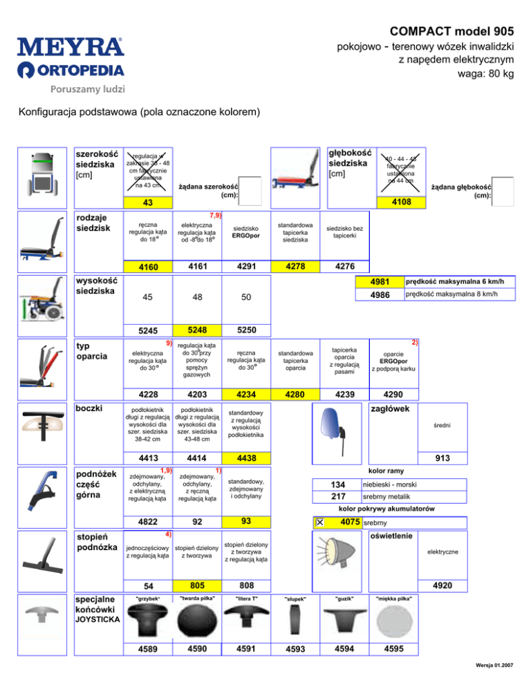 COMPACT model 905 pokojowo - terenowy wózek inwalidzki z napędem elektrycznym waga: 80 kg Konfiguracja podstawowa (pola oznaczone kolorem) szerokość siedziska [cm] regulacja w zakrasie 38 - 48 cm fabrycznie ustawiona na 43 cm 43 rodzaje siedzisk wysokość siedziska boczki 4108 ręczna regulacja kąta do 18 elektryczna regulacja kąta od -8 do 18 siedzisko ERGOpor standardowa tapicerka siedziska siedzisko bez tapicerki 4160 4161 4291 4278 4276 45 48 50 5248 5250 9) regulacja kąta żądana głębokość (cm): 4981 prędkość maksymalna 6 km/h 4986 prędkość maksymalna 8 km/h 2) elektryczna regulacja kąta do 30 do 30 przy pomocy sprężyn gazowych ręczna regulacja kąta do 30 standardowa tapicerka oparcia tapicerka oparcia z regulacją pasami oparcie ERGOpor z podporą karku 4228 4203 4234 4280 4239 4290 podłokietnik podłokietnik długi z regulacją długi z regulacją wysokości dla wysokości dla szer. siedziska szer. siedziska 43-48 cm 38-42 cm 4413 podnóżek część górna żądana szerokość (cm): 40 - 44 - 48 fabrycznie ustawiona na 44 cm 7,9) 5245 typ oparcia głębokość siedziska [cm] 4414 1,9) zdejmowany, odchylany, z elektryczną regulacją kąta zagłówek standardowy z regulacją wysokości podłokietnika średni 4438 913 1) zdejmowany, odchylany, z ręczną regulacją kąta kolor ramy standardowy, zdejmowany i odchylany 134 217 niebieski - morski srebrny metalik kolor pokrywy akumulatorów 4822 stopień podnózka specjalne końcówki 92 93 4075 4) jednoczęściowy stopień dzielony z regulacją kąta z tworzywa srebrny oświetlenie stopień dzielony z tworzywa z regulacją kąta elektryczne 54 805 808 4920 "grzybek" "twarda piłka" "litera T" "słupek" "guzik" "miękka piłka" 4589 4590 4591 4593 4594 4595 JOYSTICKA Wersja 01.2007 COMPACT model 905 pokojowo - terenowy wózek inwalidzki z napędem elektrycznym waga: 80 kg sterowanie rozmiar kół z regulacją długości i wysokości z regulacją długości, odchylane 4566 4655 elektronika VSI 4859 4860 4850 dla praworęcznych dla leworęcznych 1) nie z kodem 54 - jednoczęściowy stopień podnóżka 2) tylko z kodem 4291 (siedzenie ERGOpor) tworzy kompletne siedzisko typu ERGOpor 3) nie z kodem 4646 - stolik terapeutyczny 4) nie z kodem 4719 - pomoc do pokonywania krawężników 7) nie z kodem 5245 - wysokość siedziska 45 cm 9) tylko z kodem 4863 - moduł sterujący dodatkowego wyposażenia elektrycznego 10) tylko z kodem 4696 - akumulatory standardowe 11) moduł sterowania montowany seryjnie z tyłu podłokietnika tylko dla osoby towarzyszącej osoby towarzyszącej z wyłączeniem pierwszego 4766 4789 4900 4901 koła tylne napędowe, pompowane 12 1/2 x 2 1/4" koła tylne napędowe, pełne 12 1/2 x 2 1/4" koła przednie 8" pompowane koła przednie 8" pełne koła przednie 9" pełne koła przednie 9" pompowane 4356 4357 4326 4316 4332 4333 akumulatory i ładowarki 824 11) dodatkowe dla z regulacją długości z regulacją długości i wysokości, odchylane 10) 40 Ah żelowe 56 Ah żelowe ładowarka 24V / 6A ładowarka 24V / 8A dla akumulatorów 56Ah 4696 4721 4686 4697 poduszka siedzeniowa 4501 nadkola kół tylnych 4714 prędkościomierz 4565 licznik czasu pracy napędu 4719 pomoc do pokonywania krawężników 4596 lusterka wsteczne 4861 lusterko wsteczne lewe 4613 pas biodrowy z zapięciem 4862 lusterko wsteczne prawe 4616 uchwyt na kule i laski 4863 moduł sterujący dodatkowych opcji elektrycznych 4646 stolik terapeutyczny z plexi 4689 pas miednicowy zapinany na rzepy Zamawiający (Kommision): 3) grubość 6 cm tekstylna 1) Kod, miejscowość: Tel. kontaktowy: Ulica: Osoba zamawiająca: Uwagi Data Wersja 01.2007