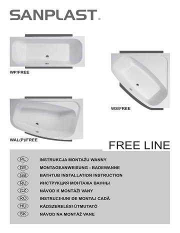 WP/FREE WS/FREE WAL(P)/FREE PL DE GB RU CZ RO HU SK FREE LINE WP/FREE, WS/FREE, WAL(P)/FREE A 2 4 WS/FREE ~100 ~0,20L ~0,15L 3 L 1 WP/FREE (L L ~0,3L ~0,3L ~100 ~100 L ~0,3L WAL(P)/FREE 170) ~100 WP/FREE (L<170) ~1/5L ~0,3L L 2 ~1/5L 0 10 20 2 575 B 10 10 0 10 0 0 10 0 1 8 600 II 3 I WP/FREE WS/FREE C WAL/FREE WAP/FREE 7 5 2 6 3 1 4 3 ES IST EMPFOHLEN ZU REINIGEN MIT: Waschmitteln zur Reinigung der sanitären Anlagen aus Acryl Geschirrspüllmitteln. ES IST VERBOTEN ZU REINIGEN MIT: Waschmitteln, die die Oberfläche kratzen, alkalischen Waschmitteln, z.B.: Soda Säuren, z.B.: Schwefelsäure, Salzsäure. KLEINE REPARATUREN: Kratzer (nicht grösser als 0,2mm) beseitigt man durch das Schleifen der Oberfläche mit einem wasserrechten Schleifpapier Nr. 400, und dann mit dem Schleifpapier Nr. 600 und 800. Danach soll man die Oberfläche mit einer Polierpaste polieren, bis zum Erreichen des Glanzes. In der Situation wenn die Acryloberfläche matt wird, soll man sie mit der obergenannten Polierpaste polieren, bis zum Erreichen des Glanzes. MONTAGE: Die Badewanne soll so montiert werden, damit sie auch einfach demontiert werden könnte, also auf solche Art und Weise, damit man sie im Falle einer Beschädigung demontieren könnte, ohne gleichzeitig den Fliesenbelag zu beschädigen. Die Badewanne soll man zum Fliesenbelag zuschieben und abdichten. GEBRAUCH: Achtung! Während des Bades besonders mit Anwendung von Seife, Schampoo, Badeöl usw. wird die Duschwannenoberfläche sehr glitschig! Achtung: Der Hersteller behält sich das Recht vor, technische Änderungen und Farbenänderungen in den Produkten einzuführen. RECOMMENDED CLEANING: With special agents for sanitary equipment clearing, with washing liquids. IT IS FORBIDDEN TO CLEAN WITH: Abrasive agents, alcalic agents, acids, e.g. sulphuric acid, hydrochloric acid. SMALL REPAIRS: Scratches (not bigger than 0,2mm) can be removed by polishing the surface with waterproof abrasive paper no 400, then with abrasive paper no 600 and 800, until the scratches are completely removed. The surface then should be polished with an abrasive compound used for car lacquer to restore its shine. In case the acrylic surface looks mat, it is recommended to polish it with an abrasive compound until it looks shiny again. INSTALLATION: Bathtub should be installed in a way which enables an easy dismantling in case of failure, so that the tiles were not damaged. The bathtub should be sealed at glazing. OPERATION: Attention! During wetting, especially when using soap, shampoo, bath oil, etc., most of the shower trays spray's surface becomes very slippery! Notice: The producer reserves the right to introduce changes of technical parameters and colours of described elements. РЕКОМЕНДУЕТСЯ ЧИСТИТЬ: Жидкостями для мытья акриловой сантехники, жидкостями для мытья кухонной посуды. ЗАПРЕЩАЕТСЯ ЧИСТИТЬ: Средствами, царапающими поверхность, щелочными средствами, напр. содой, кислотами, напр. серной, соляной. МЕЛКИЕ РЕМОНТЫ: Царапины (не более 0,2 мм) можно удалить, шлифуя поверхность водостойкой наждачной бумагой № 400, а затем бумагой № 600 и 800, до момента удаления царапин. Затем следует полировать поверхность полировальной пастой, используемой для полирования лакированных поверхностей автомобиля, до момента получения блеска. В случае потери блеска поверхности акрила, рекомендуется полировать поверхность с помощью вышеуказанной полировальной пасты, до момента получения эффекта блеска. МОНТАЖ: Ванну следует установить таким образом, чтобы обеспечить легкий демонтаж, чтобы в случае повреждения можно было ее демонтировать без повреждения кафеля. Ванную следует придвинуть к кафелю и герметизировать. ЭКСПУЛАТАЦИЯ: Внимание! Во время купания, особенно с применением мыла, шампунья, масла для купания и т.д. поверхность большинства душевых поддонов становится очень скользкой! Внимание: Производитель оставляет за собой право изменять технические характеристики и цветовую гамму указанных элементов. DOPORUČENÉ ČISTÍCÍ PROSTŘEDKY: Tekuté prostředky na čistění akrylových sanitačních zařízení, tekuté čistící prostředky na kuchyňský nádobí. ZAKAZUJE SE ČISTIT: Prostředky, které můžou poškrábat povrch, alkalickými prostředky jako soda, kyselinami, např. sírovou, solní. DROBNÉ OPRAVY: Škrábance (menší než 0,2 mm) můžete odstranit přebroušením vodovzdorným brusným papírem č. 400, a následně papírem č. 600 a 800, až kým neodstraníte škrábance. Povrch poté vyleštěte leštící pastou používanou na leštění lakovaných povrchů automobilů až kým se neleskne. Zmatněný akrylový povrch leštěte leštící pastou až kým se neleskne. MONTÁŽ: Vanu zamontujte způsobem, který umožňuje její lehkou demontáž aby jste ji v případě poškození mohli demontovat bez narušení smaltování. Vanu přisuňte ke glazuře a utěsněte. PROVOZ: Pozor! Po navlhčení, především s použitím mýdla, šampónu, koupelov