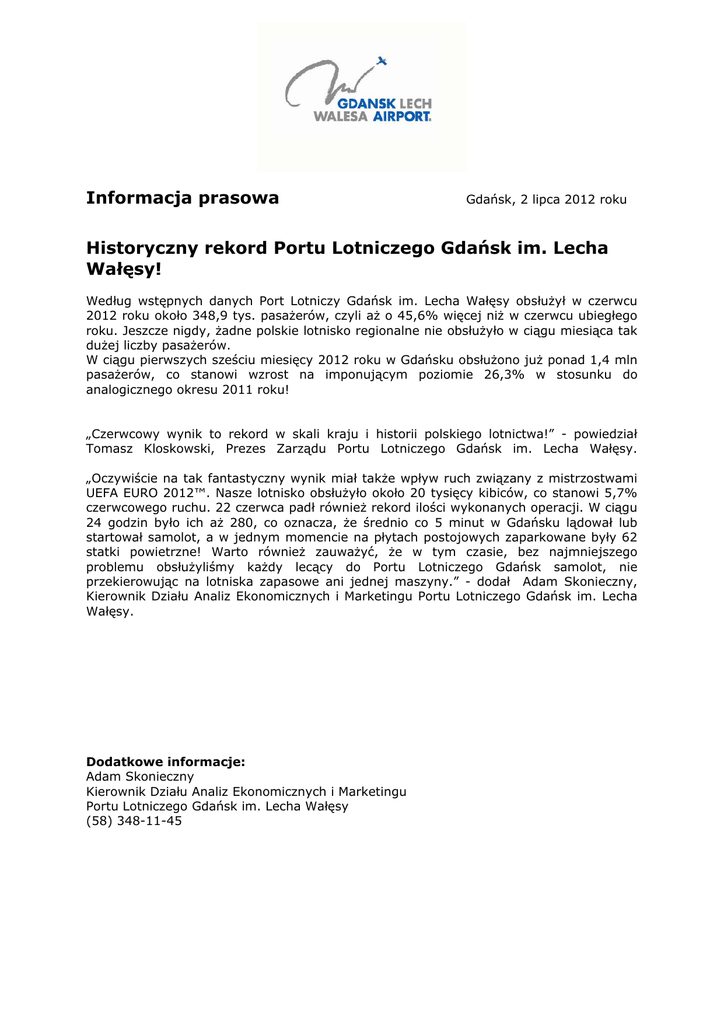 Informacja prasowa Gdańsk, 2 lipca 2012 roku Historyczny rekord Portu Lotniczego Gdańsk im. Lecha Wałęsy! Według wstępnych danych Port Lotniczy Gdańsk im. Lecha Wałęsy obsłużył w czerwcu 2012 roku około 348,9 tys. pasażerów, czyli aż o 45,6% więcej niż w czerwcu ubiegłego roku. Jeszcze nigdy, żadne polskie lotnisko regionalne nie obsłużyło w ciągu miesiąca tak dużej liczby pasażerów. W ciągu pierwszych sześciu miesięcy 2012 roku w Gdańsku obsłużono już ponad 1,4 mln pasażerów, co stanowi wzrost na imponującym poziomie 26,3% w stosunku do analogicznego okresu 2011 roku! „Czerwcowy wynik to rekord w skali kraju i historii polskiego lotnictwa!” - powiedział Tomasz Kloskowski, Prezes Zarządu Portu Lotniczego Gdańsk im. Lecha Wałęsy. „Oczywiście na tak fantastyczny wynik miał także wpływ ruch związany z mistrzostwami UEFA EURO 2012™. Nasze lotnisko obsłużyło około 20 tysięcy kibiców, co stanowi 5,7% czerwcowego ruchu. 22 czerwca padł również rekord ilości wykonanych operacji. W ciągu 24 godzin było ich aż 280, co oznacza, że średnio co 5 minut w Gdańsku lądował lub startował samolot, a w jednym momencie na płytach postojowych zaparkowane były 62 statki powietrzne! Warto również zauważyć, że w tym czasie, bez najmniejszego problemu obsłużyliśmy każdy lecący do Portu Lotniczego Gdańsk samolot, nie przekierowując na lotniska zapasowe ani jednej maszyny.” - dodał Adam Skonieczny, Kierownik Działu Analiz Ekonomicznych i Marketingu Portu Lotniczego Gdańsk im. Lecha Wałęsy. Dodatkowe informacje: Adam Skonieczny Kierownik Działu Analiz Ekonomicznych i Marketingu Portu Lotniczego Gdańsk im. Lecha Wałęsy (58) 348-11-45