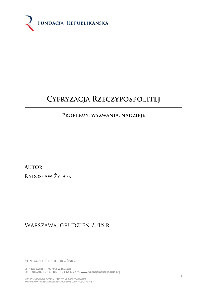 FUNDACJA REPUBLIKAŃSKA ul. Nowy Świat 41, 00-042 Warszawa tel.: +48 22 891 07 37, tel.: +48 512 435 471, www.fundacjarepublikanska.org 1 NIP: 952-207-86-26, REGON: 142075516, KRS: 0000340559 nr konta bankowego: Alior Bank 84 2490 0005 0000 4520 9156 1754 Wstęp ..................................................................................................................... 3 Polska Cyfrowa AD 2015 ..................................................................................... 4 Potrzeba koordynacji – zadania dla nowego Ministerstwa Cyfryzacji ................. 6 Inwestycje w ramach Polski Cyfrowej – teoria i praktyka ................................... 7 Wykluczenie cyfrowe – skala zjawiska ................................................................ 9 Kompetencje cyfrowe – definicja, waga, drogi rozwoju .................................... 10 Podsumowanie. Cyfryzacja – nowa nadzieja ...................................................... 12 FUNDACJA REPUBLIKAŃSKA ul. Nowy Świat 41, 00-042 Warszawa tel.: +48 22 891 07 37, tel.: +48 512 435 471, www.fundacjarepublikanska.org 2 NIP: 952-207-86-26, REGON: 142075516, KRS: 0000340559 nr konta bankowego: Alior Bank 84 2490 0005 0000 4520 9156 1754 9 grudnia 2015 roku Fundacja Republikańska zorganizowała w Centrum Prasowym PAP otwarte seminarium „Przeciwdziałanie wykluczeniu cyfrowemu w Polsce w kontekście Europejskiej Agendy Cyfrowej”. Organizatorzy razem z zaproszonymi gośćmi – ekspertami z branży teleinformatycznej, działaczami z sektora NGO, naukowcami i przedstawicielami władz państwowych – dyskutowali o zachodzących przemianach społeczno-ekonomicznych związanych z popularyzacją technik cyfrowych i rozwojem łączy szerokopasmowych. Głównym celem seminarium było odpowiedzenie na pytanie: jak wygląda polska cyfryzacja w kontekście Europejskiej Agendy Cyfrowej i co można zrobić w przyszłości, aby procesy z nią związane przebiegały z korzyścią dla polskiego społeczeństwa. Wydarzenie podzielone było na dwa panele – pierwszy poświęcony Europejskiej Agendzie Cyfrowej, natomiast drugi – zjawisku wykluczenia cyfrowego. Konkluzje obu dyskusji zamierzam przedstawić w poniższym artykule. Najważniejsze ramy całej dyskusji o cyfryzacji w skali Unii Europejskiej wyznacza Europejska Agenda Cyfrowa. Jest to plan rozwoju sektora teleinformatycznego i jego otoczenia prawno-administracyjnego przyjęty przez Komisję Europejską w 2010 roku. EAC stanowi część większej strategii „Europa 2020”, która była odpowiedzią Unii na kryzys ekonomiczny. Projekt ten oparty jest o obserwacje, z których wynika korelacja pomiędzy produktywnością gospodarki a jej poziomem technologicznych, w szczególności określanym poprzez udział przedsiębiorstw ICT w PKB. Unijni decydenci, obserwując zarówno rynki krajów członkowskich, jak i zewnętrzne, w szczególności amerykański i japoński, dostrzegli duże braki w infrastrukturze informatycznej krajów UE i postępujące za nim wykluczenie cyfrowe. Efektem tego jest brak udziału znacznej części obywateli Unii w zdobyczach technologicznych XXI wieku, a w konsekwencji gorsze warunki bytowe tej grupy, w tym niższe płace, trudniejszy dostęp do informacji oraz wolniejszy wzrost gospodarczy w skali całej wspólnoty. Można więc skonkludować, że esencją Europejskiej Agendy Cyfrowej jest dostrzeżenie braków w kompetencjach obywateli i infrastrukturze teleinformatycznej i uznanie, że podwyższenie wskaźników związanych z w/w doprowadzi do polepszenia indywidualnej sytuacji osób objętych tymi działaniami, poprawienia globalnej FUNDACJA REPUBLIKAŃSKA ul. Nowy Świat 41, 00-042 Warszawa tel.: +48 22 891 07 37, tel.: +48 512 435 471, www.fundacjarepublikanska.org 3 NIP: 952-207-86-26, REGON: 142075516, KRS: 0000340559 nr konta bankowego: Alior Bank 84 2490 0005 0000 4520 9156 1754 konkurencyjności gospodarek krajów członkowskich i przyspieszenia ich wzrostu gospodarczego. W styczniu 2014 roku Rada Ministrów RP przyjęła założenia Programu Operacyjnego Polska Cyfrowa na lata 2014-2020, który jest krajową implementacją Europejskiej Agendy Cyfrowej. Fundamentami PO PC, zgodnie z opisem tego programu, są: szeroki dostęp do szybkiego Internetu, efektywne i przyjazne użytkownikom e-usługi publiczne oraz stale rosnący poziom kompetencji cyfrowych społeczeństwa. Dla realizacji tych celów wyznaczono cztery osie priorytetowe: I. Powszechny dostęp do szybkiego Internetu; II. E-administracja i otwarty rząd; III. Cyfrowe kompetencje społeczeństwa; IV. Pomoc techniczna. Na każdą z osi przewidziano odpowiednie fundusze, które łącznie przekroczyły kwotę 2 miliardów euro. W toku seminarium goście dyskutowali o tym, jak te fundusze są wydatkowane i czy podjęte przez instytucje publiczne działania faktycznie zmierzają do osiągnięcia założonych celów. Głos zabrali eksperci z trzech najistotniejszych stron procesów cyfryzacyjnych: biznesu, rządu i NGO. W toku dyskusji udało się wypracować pewien konsensus. Panuje ogólna zgoda co do podstawowych problemów i sposobu ich rozwiązywania. Po pierwsze: Polska potrzebuje horyzontalnej polityki cyfryzacyjnej, wykraczającej poza pojedyncze resorty, obejmującej nie tylko budowę sieci szerokopasmowych, ale przede wszystkim kompetencji i usług niezbędnych, aby infrastruktura była faktycznie wykorzystywana. Do tej pory działania różnych ministerstw ograniczały się tylko do działów administracji, którymi zajmuje się dany resort, przez co były punktowe i dalece nieefektywne. Instytucje publiczne za słabo ze sobą współpracują, w związku z czym tracona jest szansa na efekt synergii (niższe koszty, większy zasięg działań). Po drugie: w zależności od instytucji nadzorującej dany proces, źle lub bardzo źle wygląda kontrola i ewaluacja poszczególnych projektów teleinformatycznych. Brakuje standaryzacji, która pozwoliłaby na wyznaczan