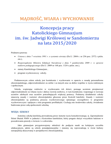 MĄDROŚĆ, WIARA i WYCHOWANIE Koncepcja pracy Katolickiego Gimnazjum im. św. Jadwigi Królowej w Sandomierzu na lata 2015/2020 Podstawa prawna: Ustawa z dnia 7 września 1991 r. o systemie oświaty (Dz.U. 2004 r. nr 256 poz. 2572 z późn. zm.), Rozporządzenie Ministra Edukacji Narodowej z dnia 7 października 2009 r. w sprawie nadzoru pedagogicznego (Dz.U. 2009 nr 168 poz. 1324 z późn. zm.), statuty Katolickiego Gimnazjum , program wychowawczy szkoły. Podstawowym celem szkoły jest kształcenie i wychowanie w oparciu o zasadę personalizmu chrześcijańskiego, odpowiedzialności za siebie i za innych oraz za dobro wspólne w życiu rodzinnym i społecznym. Szkoła, wspierając rodziców w wychowaniu ich dzieci, pomaga uczniom przejmować odpowiedzialność za własne życie i dalszy rozwój osobowy, w tym kształcenie; wspomaga w rozwoju uczniów zdolnych oraz uczniów potrzebujących większej pomocy. Podstawę działalności szkoły stanowią zasady i wartości chrześcijańskie głoszone przez Kościół katolicki. Zasady i wartości chrześcijańskie są podstawą procesu wychowawczego opisanego szczegółowo w programie wychowawczym i spójnym z nim programie profilaktyki. Cechują one środowisko szkoły, świadomie budowane przez całą społeczność szkolną. WIZJA SZKOŁY Jesteśmy szkołą katolicką prowadzoną przez instytut życia konsekrowanego, tj. Zgromadzenie Sióstr Służek NMN w jedności z Kościołem katolickim, który pragnie służyć wszystkim ludziom w poszukiwaniu prawdy o świecie i o człowieku. Jako gimnazjum przygotowujemy młodzież do podjęcia nauki na kolejnym szczeblu edukacyjnym, jakim są szkoły ponadgimnazjalne i staramy się wprowadzają w świat kultury europejskiej ukazywanej w perspektywie chrześcijańskiej. MISJA SZKOŁY Działamy po to, aby: - pomagać rodzicom w tworzeniu warunków do kształtowania dojrzałej osobowości chrześcijańskiej młodych ludzi; - dbać, by codzienny, sumienny wysiłek intelektualny pracowników oraz ich życzliwy kontakt z każdym uczniem pomagał młodzieży w zdobyciu wiedzy, umiejętności, postaw moralnych i społecznych, które pozwalają na integralny rozwój a także włączenie się we wspólnotę ludzką jako pożyteczni jej członkowie; - zapewniać warunki do rozwoju duchowego, intelektualnego i fizycznego, aby pomóc w przygotowaniu się do odczytania i realizacji osobistego powołania każdego z naszych wychowanków, przeżywanego w duchu przyjaźni z Chrystusem, ludźmi i szacunku do stworzonego świata przyrody; - szkoła cieszyła się uznaniem w środowisku; - wspomagać młodzież do włączania się w środowisko lokalne. Do realizacji tych założeń, z myślą o dobru powierzonego nam ucznia, szkoła koncentruje się na: a) dydaktyce, b) wychowaniu i opiece, c) bazie i organizacji pracy szkoły. A. DYDAKTYKA Cel ogólny: wysoki poziom kształcenia, wysokie wyniki egzaminów gimnazjalnych, udział uczniów w olimpiadach i konkursach, stworzenie warunków dobrego kształcenia uczniom pochodzącym z rodzin ubogich. Sposoby osiągnięcia celów: efektywne poszukiwania nowatorskich form i metod pracy, indywidualizacja procesu nauczania i wymagań względem uczniów, współpraca z rodzicami, analiza wyników egzaminu gimnazjalnego i maturalnego, różne sposoby diagnozowania uczniów, systematyczne przygotowanie i uczestnictwo uczniów w konkursach, olimpiadach przedmiotowych i zawodach sportowych, bogata oferta zajęć pozalekcyjnych, efektywny system doskonalenia zawodowego nauczycieli, stosowanie aktywizujących metod nauczania. B. WYCHOWANIE I OPIEKA Cel ogólny: szkoła przyjazna dla ucznia, zapewnienie bezpieczeństwa ucznia i wychowanie w duchu chrześcijańskim, poczucie bezpieczeństwa u każdego ucznia w szkole, wzajemne wsparcie w wychowaniu i rozwiązywaniu problemów na płaszczyźnie rodziny, szkoły i pedagoga, zadowolenie rodziców i uczniów z pracy szkoły, kultura osobista w relacjach międzyludzkich, wyrównywanie szans uczniów z różnych środowisk, funkcjonowanie w oparciu o chrześcijański system wartości. Sposoby osiągnięcia celów: współpraca z rodzicami uczniów, współpraca z instytucjami wspierającymi pracę szkoły, systematyczne informowanie rodziców o sukcesach oraz trudnościach wychowawczych uczniów, integracja młodzieży poprzez udział we wspólnych uroczystościach szkolnych wycieczki szkolne, udział uczniów w planowaniu pracy szkoły, działalność organizacji uczniowskich, rekolekcje szkolne, jednakowy strój szkolny, wzajemne wsparcie nauczycieli w kształtowaniu osobowości wychowanka współpraca ze środowiskiem lokalnym. C. BAZA I ORGANIZACJA SZKOŁY Cel ogólny: szkoła dobrze zorganizowana, sprawnie funkcjonująca zarówno dla uczniów, rodziców i pracowników, dobrze wyposażona w sprzęt i pomoce dydaktyczne. Sposoby osiągnięcia celów: sprawna komunikacja między podstawowymi grupami w szkole — dyrekcja, nauczyciele, pracownicy niepedagogiczni, uczniowie, rodzice, satysfakcja i duma pracowników z pracy w szkole katolickiej, pozyskiwanie funduszy na funkcjonowanie szkoły, dokonywanie na bieżąco i sukcesywnie drobnych napraw i remontów, systematyczne wzbogacanie szkoły w pomoce dydaktyczne. MĄDROŚĆ, WIARA i WYCHOWANIE Koncepcja pracy Katolickiego Liceum Ogólnokształcącego im. św. Jadwigi Królowej w Sandomierzu na lata 2015/2020 Podstawa prawna: Ustawa z dnia 7 września 1991 r. o systemie oświaty (Dz.U. 2004 r. nr 256 poz. 2572 z późn. zm.), Rozporządzenie Ministra Edukacji Narodowej z dnia 7 października 2009 r. w sprawie nadzoru pedagogicznego (Dz.U. 2009 nr 168 poz. 1324 z późn. zm.), Statut Katolickiego Liceum Ogólnokształcącego, program wychowawczy szkoły. Podstawowym celem szkoły jest kształcenie i wychowanie w oparciu o zasadę personalizmu chrześcijańskiego, odpowiedzialności za siebie i za innych oraz za dobro wspólne w życiu rodzinnym i społecznym. Szkoła, wspierając rodziców w
