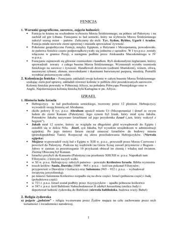 FENICJA 1. Warunki geograficzne, surowce, zajęcia ludności: Fenicja to kraina na wschodnim wybrzeżu Morza Śródziemnego, na północ od Palestyny i na zachód od gór Libanu. Fenicjanie to lud semicki, który na wybrzeżu Morza Śródziemnego założył szereg miast – państw. Zaliczamy do nich: Tyr, Sydon, Byblos, Ugarit i Arados. Fenicja miała niewiele ziemi uprawnej i musiała sprowadzać żywność. Położenie geopolityczne Fenicji, między Egiptem, a Hetytami i Mezopotamią, powodowało, że państwa fenickie często podporządkowywały się jednemu z sąsiadów. W I tys.p.n.e. zostały włączone w granice Persji, a następnie podbite przez Aleksandra Macedońskiego w IV w.p.n.e. Fenicjanie zajmowali się głównie rzemiosłem i handlem. Byli doskonałymi żeglarzami, którzy sprowadzali towary z całego basenu Morza Śródziemnego. Wymieniali wyroby rzemiosła fenickiego na surowce i żywność. Handlowali drzewem (cedrami libańskimi), winem, oliwą, suszonymi rybami, złotem, niewolnikami i tkaninami barwionymi purpurą, miedzią. Potrafili wyrabiać przezroczyste szkło. 2. Kolonizacja fenicka – Fenicjanie zakładali swoje kolonie w całym basenie Morza Śródziemnego szukając ziem pod uprawę; zakładali również kolonie w pobliżu złóż poszukiwanych surowców. Kolonie fenickie powstały w Północnej Afryce, na południu Półwyspu Pirenejskiego oraz w Anglii. Najsławniejsza kolonią fenicką była Kartagina w pn. Afryce. IZRAEL 1. Historia ludu Izraela Hebrajczycy to lud pochodzenia semickiego, tworzony przez 12 plemion. Hebrajczycy wywodzili swoją historię od Abrahama. około połowy II tys. p.n.e. Abraham opuścił miasto Ur (Mezopotamia) i dotarł ze swym ludem do ziemi Kanaan (Palestyna). Jego synem był Izaak, który miał syna Jakuba. Potomków Jakuba nazywano Izraelitami od jego przydomka Izrael („ten, który walczył z bogiem”). Jakub miał 12 synów, którzy ze względu na długoletni głód wywędrowali do Egiptu i osiedlili się w delcie Nilu. Józef, syn Jakuba, był wysokim urzędnikiem w administracji egipskiej. Po jego śmierci faraon zaczął zmuszać Izraelitów do budowy miasta (prawdopodobnie Tanis). Rozpoczął się okres prześladowania Hebrajczyków. (Niewola egipska) Mojżesz wyprowadził swój lud z Egiptu w XIII w. p.n.e., przeszedł przez Morze Czerwone i powrócił do Palestyny. Podczas tej wędrówki na Górze Synaj zawarł przymierze z Bogiem – Jahwe w zamian za przestrzeganie 10 przykazań obiecał im ziemię i władzę nad światem. Ziemią Obiecaną był Kanaan. Izraelici przybyli do Kanaanu (Palestyny) na przełomie XIII/XII w. p.n.e. Napotkali tam Filistynów, z którymi toczyli walki. w XI w. p.n.e. Hebrajczycy założyli państwo – powstało Królestwo Izraela. Biblia wymienia trzech królów: Saula, Dawida (1000 – 965 r. p.n.e. – król ten pokonał Filistynów; przypowieść o Dawidzie i Goliacie) oraz Salomona (965 – 932 r. p.n.e. – wybudował świątynię jerozolimską). po śmierci Salomona Królestwo rozpadło się na dwie części: Izrael (północna część) i Judę (południowa część) w 721 r. p.n.e. Izrael został podbity przez Asyryjczyków – upadło północne królestwo w 587 r. p.n.e. król Babilonii Nabuchodonozor II zdobył Jerozolimę (stolica Judy) i deportował ludność żydowską do Babilonii (niewola babilońska, budowa wieży Babel) 2. Religia żydowska a) pojęcie „judaizm” - religia wyznawana przez Żydów mająca na celu zachowanie przez nich tożsamości i świadomości narodowej. 1 Judaizm jest pierwszą religią monoteistyczną, uznającą jedynego Boga, stwórcę całego świata. Za założyciela judaizmu uważa się Mojżesza, który żył ok. 1250 r. p.n.e. Zgodnie z wiarą Mojżesz zawarł przymierze między ludem Izraela a Bogiem na górze Synaj. Żydzi zostali uznani za naród wybrany i otrzymali wówczas od Jahwe 10 kamiennych tablic zawierających 10 przykazań bożych, których mieli przestrzegać. b) system wierzeń: istnieje tylko jeden Bóg, który jest stwórcą świata i wszystkich zdarzeń. Jest to Jahwe Bóg jest bezcielesny ( nie można przedstawiać wizerunku Boga), sprawiedliwy i miłosierny, wszechmocny i wszechobecny Bóg przekazuje prawdy wiary przez proroków, z których największym był Mojżesz Żydzi to naród wybrany, z którym Jahwe zawarł przymierze. Symbolem przymierza jest obrzezanie podstawą zbawienia jest postępowanie zgodnie z przykazaniami bożymi. Za grzech uznaje się: uznawanie innych bogów i modlenia się do posągów (bałwochwalstwo), bluźnierstwo, kazirodztwo, zabójstwo, kradzież, jedzenie mięsa wyrwanego z żywych zwierząt, łamanie prawa przekonanie o przyjściu Mesjasza, wiara we wskrzeszenie po śmierci, sąd ostateczny i życie wieczne w królestwie niebieskim jedyną świątynią, w której przebywa Jahwe jest świątynia jerozolimska zbudowana przez Salomona, syna Dawida; zburzona przez Rzymian w I w.n.e. Żydem jest tylko osoba urodzona z Żydówki c) święte księgi judaizmu Podstawą tej wiary jest Tora, która składa się z pięciu ksiąg: Księga Rodzaju (Genezis) Księga Wyjścia (Exodus) Księga Kapłanów (Leviticus) Księga Liczb (Numeri) Księga Powtórzonego Prawa (Deuteronomium) Komentarzem do Tory jest Talmud - zbiór norm szczegółowo regulujących życie wyznawców judaizmu. Obejmuje zbiór 63 ksiąg, usystematyzowany w 6 działów dotyczących: zasad utrzymania rytualnej czystości, zasad żywienia, obrzędów, zasad współżycia z innymi ludźmi itp. Symbole judaizmu: gwiazda Dawida – gwiazda sześcioramienna menora – siedmioramienny świecznik wykonany z 1 bryły metalu Organizacja brak hierarchii i centrum religijnego wyznawcy gromadzą się w gminach, które mają pełną autonomię. na czele gminy stoi rabin oraz kantor najważniejszymi budynkami w gminie są: synagoga (bożnica – miejsce modlitw) , rytualna łaźnia oraz rytualna rzeźnia PERSJA 1. Warunki geograficzne, surowce, 