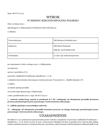 Sygn. akt II Ca 12/13 WYROK W IMIENIU RZECZYPOSPOLITEJ POLSKIEJ Dnia 14 lutego 2013 r. Sąd Okręgowy w Białymstoku II Wydział Cywilny Odwoławczy w składzie: Przewodniczący: SSO Barbara Puchalska (spr.) Sędziowie: SSO Beata Wojtasiak SSR del. Jacek Malinowski Protokolant: st. sekr. sąd. Zofia Szczęsnowicz po rozpoznaniu w dniu 14 lutego 2013 r. w Białymstoku na rozprawie sprawy z powództwa D. S. przeciwko Spółdzielni Produkcyjno-Handlowej (...) w K. z udziałem interwenienta ubocznego po stronie pozwanej Towarzystwa (...) Spółki Akcyjnej w W. o zapłatę na skutek apelacji powódki od wyroku Sądu Rejonowego w Białymstoku z dnia 5 października 2012 r. sygn. akt XI C 974/12 I. zmienia zaskarżony wyrok w punktach II i III i odstępuje od obciążania powódki kosztami procesu poniesionymi przez pozwanego i interwenienta ubocznego; II. oddala apelację w pozostałym zakresie; III. odstępuje od obciążania powódki kosztami procesu za drugą instancję poniesionymi przez pozwanego i interwenienta ubocznego. UZASADNIENIE Powódka D. S. po ostatecznym sprecyzowaniu pozwu wniosła o zasądzenie od pozwanej Spółdzielni Produkcyjno – Handlowej (...) w K. kwoty 20.000 zł wraz z ustawowymi odsetkami od dnia 15 grudnia 2010 roku do dnia zapłaty tytułem zadośćuczynienia za cierpienia fizyczne i psychiczne, jakich doznała wskutek pęknięcia szklanej butelki wody gazowanej marki „K., w wyniku czego ostra krawędź szkła wbiła się w lewą dłoń powódki. Ponadto wniosła o zasądzenie na jej rzecz kosztów procesu. Powódka wystąpiła do pozwanej jako do producenta przedmiotu niebezpiecznego. Pozwana Spółdzielnia Produkcyjno – Handlowa (...) w K. wniosła o oddalenie powództwa w całości, wezwanie do udziału w sprawie po stronie pozwanej Towarzystwa (...) S.A. w W. i Przedsiębiorstwa (...) M. P. Sp. J. w J. oraz o zasądzenie od powódki zwrotu kosztów procesu według norm przepisanych. Kwestionowała swoją odpowiedzialność za szkodę doznaną przez powódkę. Interwenient uboczny po stronie pozwanej Towarzystwo (...) Spółka Akcyjna w W. wniosła o oddalenie powództwa i zasądzenie od powódki na swoją rzecz zwrotu kosztów procesu według norm przepisanych. Wyrokiem z dnia 5 października 2012 r. Sąd Rejonowy w Białymstoku w punkcie I oddalił powództwo, w punkcie II zasądził od powódki na rzecz pozwanej kwotę 2.417 zł tytułem zwrotu kosztów zastępstwa prawnego, w punkcie III zasądził od powódki na rzecz interwenienta ubocznego po stronie pozwanej Towarzystwa (...) Spółki Akcyjnej w W. kwotę 2.542 zł tytułem zwrotu kosztów procesu, w tym kwotę 2.417 zł tytułem zwrotu kosztów zastępstwa prawnego, zaś w punkcie IV odstąpił od obciążania powódki brakującymi kosztami sądowymi. Sąd I instancji ustalił, iż powódka D. S. była zatrudniona na stanowisku kasjera w (...) Spółdzielni (...) w B. przy ul. (...). W dniu 10 czerwca 2010 roku trzech klientów w sklepie przy ul. (...) w B., wspólnie zakupiło trzy szklane butelki wody gazowanej marki (...) o pojemności 330 ml każda. Mężczyźni poprosili powódkę o otwarcie butelek. Podczas zdejmowania przez powódkę kapsla z trzeciej (ostatniej) butelki doszło do pęknięcia butelki. Ostra krawędź szkła z butelki wbiła się powódce w lewą dłoń. Na skutek powyższego powódka doznała urazu dłoni lewej i została przewieziona do SPZOZ Wojewódzkiego Szpitala (...) w B. na Oddział Ortopedyczny. Rozpoznano u niej ranę ciętą kciuka lewego z uszkodzeniem częściowym ścięgna zginacza długiego przywodziciela. W dniu 10 czerwca 2010 r. wykonano chirurgiczne opracowanie rany kciuka lewego, szycie zginacza długiego i przywodziciela i założono szynę gipsową. Powódka przebywała w szpitalu do dnia 11 czerwca 2010 roku na obserwacji. W dniu 14 czerwca 2010 roku powódka zgłosiła się do Szpitala na kontrolę. Podczas kolejnej wizyty w dniu 26 czerwca 2010 r. zdjęto powódce szwy, a w dniu 15 lipca 2010 roku szynę. W okresie od 14 czerwca 2010 roku do 30 września 2010 roku powódka przebywała na zwolnieniu lekarskim. Następnie do dnia 31 października 2010 r. korzystała z urlopu. Na skutek wypadku lekarz orzecznik Zakładu Ubezpieczeń Społecznych w B. ustalił 10% stały uszczerbek na zdrowiu powódki. Biegły sądowy z zakresu (...) po przeprowadzonym badaniu podmiotowo - przedmiotowym powódki i po analizie dokumentacji medycznej z akt sprawy rozpoznał u D. S. stan po przebytym uszkodzeniu ścięgna zginacza i przywodziciela kciuka lewego. Jednocześnie stwierdził, że w wyniku zdarzenia z dnia 10 czerwca 2010 roku powódka doznała rany ciętej kciuka lewego z częściowym uszkodzeniem ścięgna zginacza i przywodziciela kciuka lewego. Przebyty przez powódkę uraz w wyniku wspomnianego zdarzenia spowodował według biegłego trwały uszczerbek na zdrowiu w wysokości 8%. Przedmiotowa szklana butelka o pojemności 0,33 l stanowi opakowanie wody gazowanej (...) produkowanej przez pozwaną. Producentem opakowania wody - butelek szklanych o poj. 0,33 l jest Przedsiębiorstwo (...) M. P. Sp. J. w J., z którym pozwana współpracuje, co najmniej od 6 stycznia 2009 roku. Butelki posiadają świadectwo jakości zdrowotnej (...) Instytutu (...) – Zakładu (...) oraz certyfikat zgodności dla materiałów mających styczność z żywnością. Powódka wywodziła swoje roszczenie z odpowiedzialności za szkodę wyrządzoną wytworzonym przez pozwaną w ramach swojej działalności produktem niebezpiecznym (art. 4491 kc, art. 415 kc). Z kolei pozwana podnosiła, że to powódka na skutek swojego nieumiejętnego zachowania doznała szkody. Wskazywała, że zakres obowiązków powódki nie przewiduje otwierania butelek klientom. Podnosiła również brak podstaw do twierdzeń o wadliwości butelki wobec jej braku i niemożności poddania jej jakiejkolwiek ekspertyzie. Sąd Rejonowy omówił zasady odpowiedzialności producenta za szkodę wyrządzoną przez 