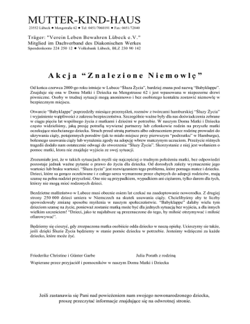 MUTTER-KIND-HAUS 23552 Lübeck ! Mengstraße 62 ! Tel: 0451/7060191 ! Fax: 0451/72840 Träger: "Verein Leben Bewahren Lübeck e.V." Mitglied im Dachverband des Diakonischen Werkes Spendenkonto 224 250 12 ! Volksbank Lübeck, BLZ 230 90 142 Spe Akcja “Znalezione Niemowl“” Od ko½ca czerwca 2000-go roku istnieje w Lubece “Ðluza òycia”, bardziej znana pod nazw• “Babyklappe”. Znajduje si“ ona w Domu Matki i Dziecka na Mengstrasse 62 i jest wpasowana w niepozorne drzwi piwniczne. Osoby w trudnej sytuacji mog• anonimowo i bez osobistego kontaktu zostawiƒ niemowl“ w bezpiecznym miejscu. Otwarcie “Babyklappe” poprzedzi»y miesi•ce przemyÑle½, rozmów z twórcami hamburskiej “Ðluzy òycia” i wyjaÑnienie w•tpliwoÑci z zakresu bezpiecze½stwa. Szczególnie waóne by»y dla nas doÑwiadczenia zebrane w ci•gu pi“ciu lat wspólnego óycia z matkami i dzieƒmi w potrzebie. W naszym Domu Matki i Dziecka cz“sto widzieliÑmy, jak• presj“ potrafi• wywieraƒ partnerzy lub cz»onkowie rodzin na przysz»e matki oczekuj•ce niechcianego dziecka. Strach przed utrat• partnera albo odrzuceniem przez rodzin“ prowadzi do ukrywania ci•óy, potajemnych porodów (jak to mia»o miejsce przy pierwszym “podrzutku” w Hamburgu), bolesnego usuwania ci•óy lub wyraóenia zgody na adopcj“ wbrew matczynym uczuciom. Przeóycie róónych tragedii doda»o nam ostatecznie odwagi do stworzenia “Ðluzy òycia”. Skorzystanie z niej jest wo»aniem o pomoc matki, ktora nie znajduje wyjÑcia ze swej sytuacji. Zrozumia»e jest, óe w takich sytuacjach myÑli si“ najcz“Ñciej o trudnym po»oóeniu matki, bez odpowiedzi pozostaje jednak waóne pytanie o prawo do óycia dla dziecka. Od doros»ych zaleóy wyznaczenie jego wartoÑci lub braku wartoÑci. “Ðluza óycia” jest rozwi•zaniem tego problemu, które pomaga matce i dziecku. Dzieci, które sa gor•co oczekiwane i z ca»ego serca wymarzone przez ch“tnych do adopcji rodziców, maj• szans“ na pe»na nadziei przyszloу. One nie s• przypadkiem, wypadkiem ani ci“óarem, tylko darem dla tych, którzy nie mog• mieƒ rodzonych dzieci. Bezdzietne ma»óe½stwo w Lubece musi obecnie osiem lat czekaƒ na zaadoptowanie noworodka. Z drugiej strony 250 000 dzieci umiera w Niemczech na skutek usuwania ci•óy. ChcielibyÑmy aby te liczby spowodowa»y zmian“ sposobu myÑlenia w naszym spo»ecze½stwie. “Babyklappe” da»aby wielu tym dzieciom szans“ na óycie, poniewaó zostanie matk• moóe byƒ dla jednych sytuacj• bez wyjÑcia, a dla innych wielkim szczeÑciem! “Dzieci, jako te najs»absze s• przeznaczone do tego, by mi»oу otrzymywaƒ i mi»oу ofiarowywaƒ”. B“dziemy si“ cieszyƒ, gdy zrozpaczona matka osobiÑcie odda dziecko w nasz• opiek“. Ucieszymy sie takóe, jeÑli dzi“ki Ðluzie òycia b“dziemy w stanie pomóc dziecku w potrzebie. JesteÑmy wdzi“czni za kaóde dziecko, które moóe óyƒ. Friederike Christine i Günter Garbe Julia Porath z rodzin• Wspierane przez przyjació» i pomocników w naszym Domu Matki i Dziecka JeÑli zastanawia si“ Pani nad powieóeniem nam swojego nowonarodzonego dziecka, prosz“ przeczytaƒ informacje znajduj•ce si“ na odwrotnej stronie. O co chcia»»aby si““ Pani jeszcze zapytaƒƒ W jaki sposób mog““ przekazaƒƒ moje dziecko? Dziecko moze Pani oddaƒ albo osobiÑcie w Domu Matki i Dziecka, Mengstraße 62, albo po»oóyƒ w Ñluzie óycia. JeÑli zdecyduje si“ Pani na t• drug• moóliwoу, to prosz“ przyjу z niemowl“ciem do Ñluzy óycia (na lewo od drzwi wejÑciowych Domu Matki i Dziecka). Prosz“ otworzyƒ klap“ i w»oóyƒ dziecko do znajduj•cego si“ tam podgrzewanego do tempertury 37°C »óóeczka. Prosz“ wzi•у "list do matki" przymocowany do wewn“trznej strony drzwiczek. List ten zawiera znaczek identyfikacyjny, który potrzebny jest gdyby matka zdecydowa»a si“ odzyskaƒ dziecko. Po zamkni“ciu klapy nie mozna jej juó otworzyƒ od zewn•trz. Co dzieje si““ z moim dzieckiem, po zostawieniu go w Ñluzie óycia? Najpóïniej dwie minuty po w»•czeniu alarmu jesteÑmy przy dziecku i bierzemy je pod nasz• opiek“. My, to znaczy dwie doÑwiadczone matki, które na sta»e óyj• w Domu Matki i Dziecka. Natychmiast po odebraniu dziecka udajemy si“ z nim do szpitala, gdzie dziecko zostaje dok»adnie zbadane przez lekarza. W przypadku widocznej choroby dziecko, lekarz zostaje wzywany na miejsce. W razie potrzeby jesteÑmy teó wyszkolone w udzielaniu pierwszej pomocy. Po badaniu lekarskim przyjmujemy dziecko w naszym domu. Jak d»»ugo mog““ zmieniƒƒ decyzj““ i odzyskaƒƒ moje dziecko? Wed»ug niemieckich przepisów moóemy zatrzymaƒ dziecko tylko na okres oÑmiu tygodni, zanim zostanie oddane do Jugendamtu. W tym czasie moóe Pani w kaódej chwili si“ do nas zg»osiƒ i odebraƒ dziecko. JeÑli potrzebuje Pani wi“cej czasu do namys»u, to prosz“ si“ takóe zameldowaƒ. W takiej sytuacji istnieje moóliwoу z»oóenia podania o osobist• opiek“. Takóe w tym przypadku zachowa Pani anonimowoу. Jak d»»ugo trwa oczekiwanie dziecka na adopcj““? Czy zachowam anonimowoу у? Po godzinie 2000 moóna byƒ pewnym, óe nie zostanie si“ rozpoznanym, gdyó niewielu ludzi znajduje si“ o tej porze na Mengstraße. Alarm informuj•cy nas o fakcie uóycia Ñluzy óycia w»acza si“ dopiero po minucie. Daje doу czasu, óeby si“ oddaliƒ niezauwaóon•. Dzieci musz• byƒ w ci•gu oÑmiu tygodni oddane do Jugendamtu. JeÑli nie zostanie z»oóone podanie o osobist• opiek“ (patrz wyóej), dziecko zostanie przekazane do rodziny oczekuj•cej na adopcj“. Rodziny te s• starannie dobierane przez Jugendamt. Proces adopcji trwa oko»o roku. Dziecko mieszka w tym czasie ze swoj• now• rodzin•. Czy mog““ anonimowo urodziƒƒ dziecko? JeÑli chce Pani anonimowo urodziƒ dziecko w szpitalu, prosz“ zwróciƒ si“ wczeÑniej do nas o pomoc. My zatrosz