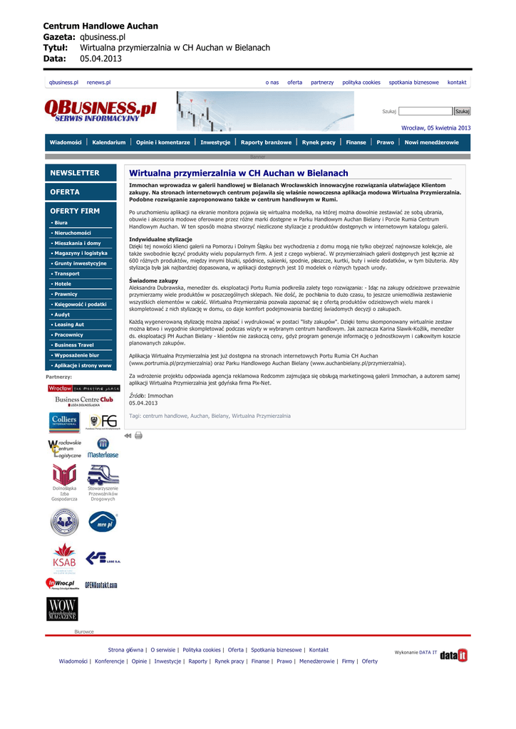 Centrum Handlowe Auchan Gazeta: qbusiness.pl Tytu³: Wirtualna przymierzalnia w CH Auchan w Bielanach Data: 05.04.2013 qbusiness.pl renews.pl o nas oferta partnerzy polityka cookies spotkania biznesowe kontakt Szukaj Szukaj Wrocław, 05 kwietnia 2013 Wiadomości Kalendarium Opinie i komentarze Inwestycje Raporty branżowe Rynek pracy Finanse Prawo Nowi menedżerowie Banner NEWSLETTER Wirtualna przymierzalnia w CH Auchan w Bielanach OFERTA Immochan wprowadza w galerii handlowej w Bielanach Wrocławskich innowacyjne rozwiązania ułatwiające Klientom zakupy. Na stronach internetowych centrum pojawiła się właśnie nowoczesna aplikacja modowa Wirtualna Przymierzalnia. Podobne rozwiązanie zaproponowano także w centrum handlowym w Rumi. OFERTY FIRM Po uruchomieniu aplikacji na ekranie monitora pojawia się wirtualna modelka, na której można dowolnie zestawiać ze sobą ubrania, obuwie i akcesoria modowe oferowane przez różne marki dostępne w Parku Handlowym Auchan Bielany i Porcie Rumia Centrum Handlowym Auchan. W ten sposób można stworzyć niezliczone stylizacje z produktów dostępnych w internetowym katalogu galerii. Biura Nieruchomości Indywidualne stylizacje Dzięki tej nowości klienci galerii na Pomorzu i Dolnym Śląsku bez wychodzenia z domu mogą nie tylko obejrzeć najnowsze kolekcje, ale także swobodnie łączyć produkty wielu popularnych firm. A jest z czego wybierać. W przymierzalniach galerii dostępnych jest łącznie aż 600 różnych produktów, między innymi bluzki, spódnice, sukienki, spodnie, płaszcze, kurtki, buty i wiele dodatków, w tym biżuteria. Aby stylizacja była jak najbardziej dopasowana, w aplikacji dostępnych jest 10 modelek o różnych typach urody. Mieszkania i domy Magazyny i logistyka Grunty inwestycyjne Transport Świadome zakupy Aleksandra Dubrawska, menedżer ds. eksploatacji Portu Rumia podkreśla zalety tego rozwiązania: - Idąc na zakupy odzieżowe przeważnie przymierzamy wiele produktów w poszczególnych sklepach. Nie dość, że pochłania to dużo czasu, to jeszcze uniemożliwia zestawienie wszystkich elementów w całość. Wirtualna Przymierzalnia pozwala zapoznać się z ofertą produktów odzieżowych wielu marek i skompletować z nich stylizację w domu, co daje komfort podejmowania bardziej świadomych decyzji o zakupach. Hotele Prawnicy Księgowość i podatki Audyt Każdą wygenerowaną stylizację można zapisać i wydrukować w postaci "listy zakupów". Dzięki temu skomponowany wirtualnie zestaw można łatwo i wygodnie skompletować podczas wizyty w wybranym centrum handlowym. Jak zaznacza Karina Slawik-Koźlik, menedżer ds. eksploatacji PH Auchan Bielany - klientów nie zaskoczą ceny, gdyż program generuje informację o jednostkowym i całkowitym koszcie planowanych zakupów. Leasing Aut Pracownicy Business Travel Wyposażenie biur Aplikacje i strony www Aplikacja Wirtualna Przymierzalnia jest już dostępna na stronach internetowych Portu Rumia CH Auchan (www.portrumia.pl/przymierzalnia) oraz Parku Handlowego Auchan Bielany (www.auchanbielany.pl/przymierzalnia). Za wdrożenie projektu odpowiada agencja reklamowa Redcomm zajmująca się obsługą marketingową galerii Immochan, a autorem samej aplikacji Wirtualna Przymierzalnia jest gdyńska firma Pix-Net. Partnerzy: Źródło: Immochan 05.04.2013 Tagi: centrum handlowe, Auchan, Bielany, Wirtualna Przymierzalnia Fundusz Poręczeń Kredytowych Dolnośląska Izba Gospodarcza Stowarzyszenie Przewoźników Drogowych Biurowce Strona główna | O serwisie | Polityka cookies | Oferta | Spotkania biznesowe | Kontakt Wiadomości | Konferencje | Opinie | Inwestycje | Raporty | Rynek pracy | Finanse | Prawo | Menedżerowie | Firmy | Oferty Wykonanie DATA IT